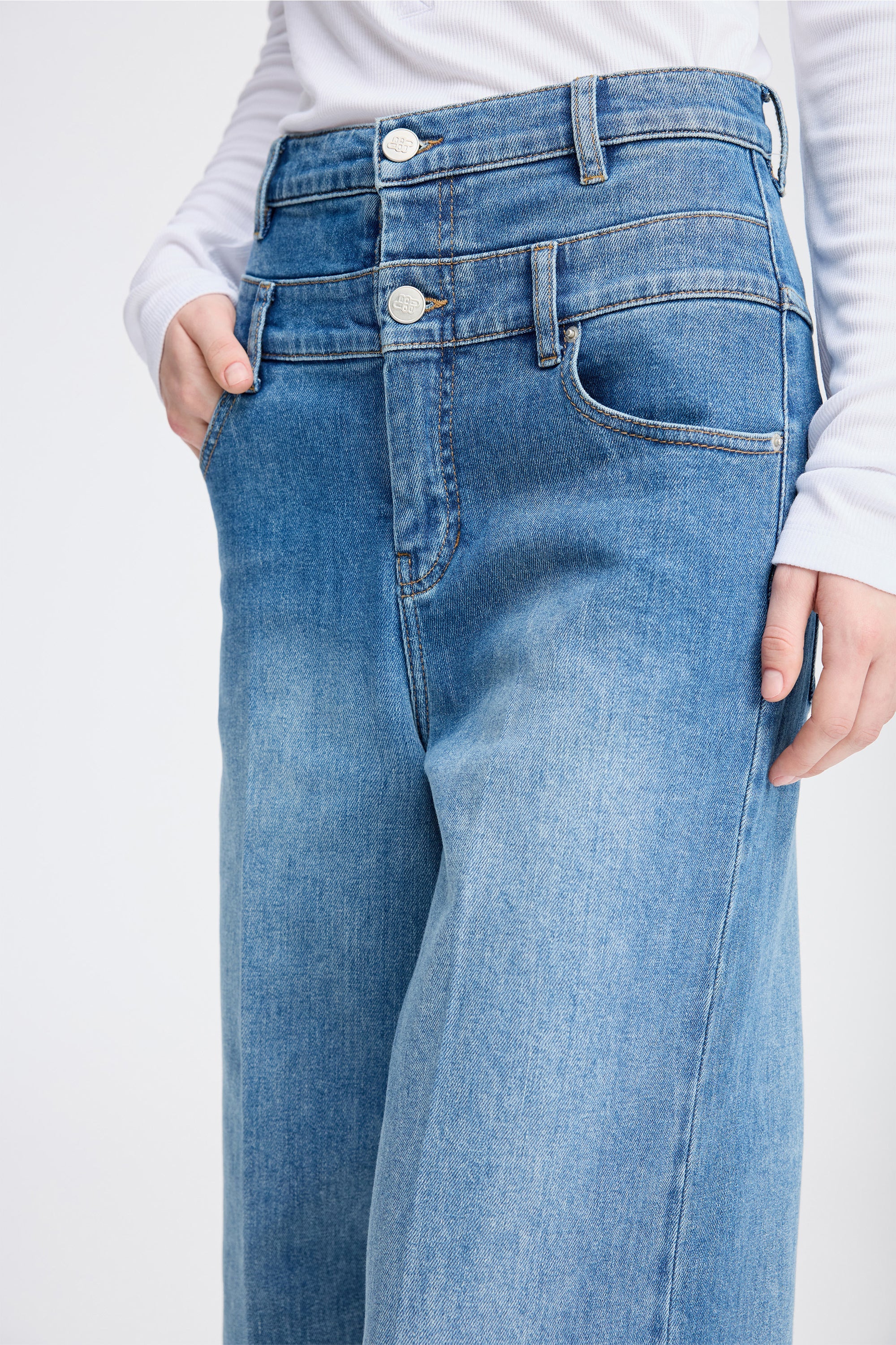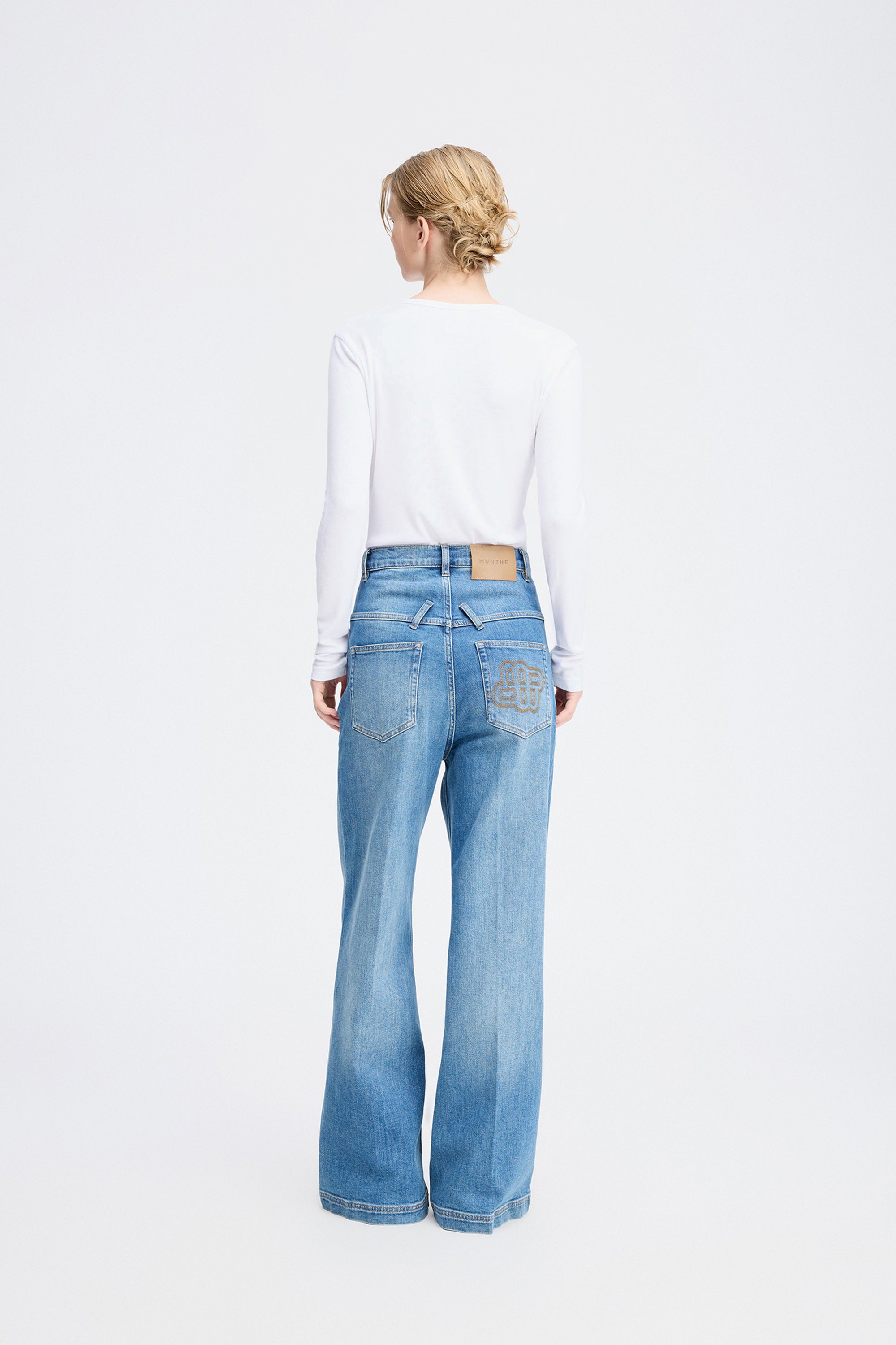 Højtaljede bukser i denim kvalitet med kontrastsyninger. Disse jeans er designet med et smukt MUNTHE emblem på baglommen, bredde ben, bæltestropper, lommer og en elegant dobbelt knaplukning.
