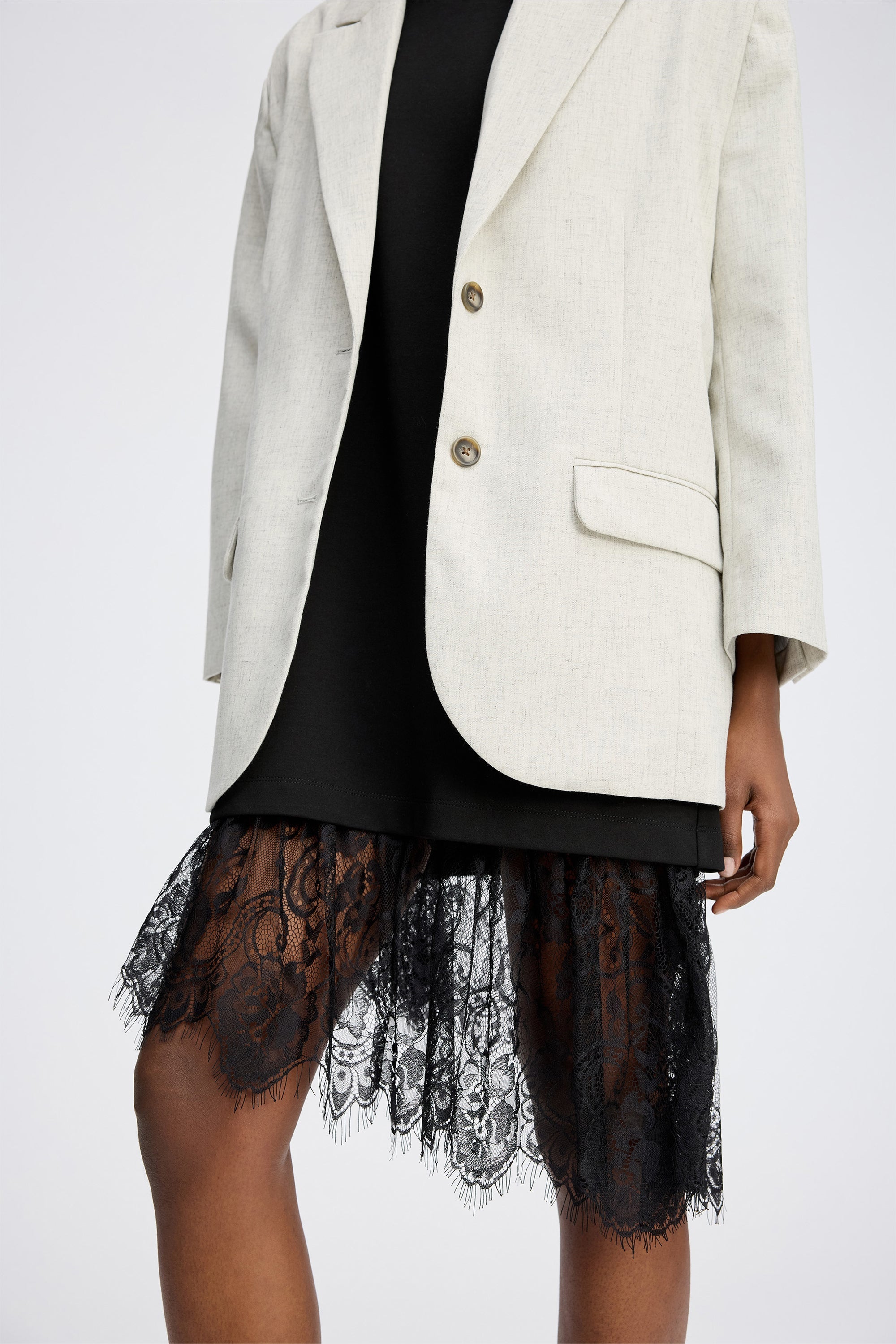 Elegant og alsidig style bestående af en kortærmet T-shirt og en løs top i let stof med en asymmetrisk blondekant. T-shirten kan bæres alene for et enkelt hverdagslook, mens blondetoppen tilføjer et feminint touch – brug dem sammen eller hver for sig.