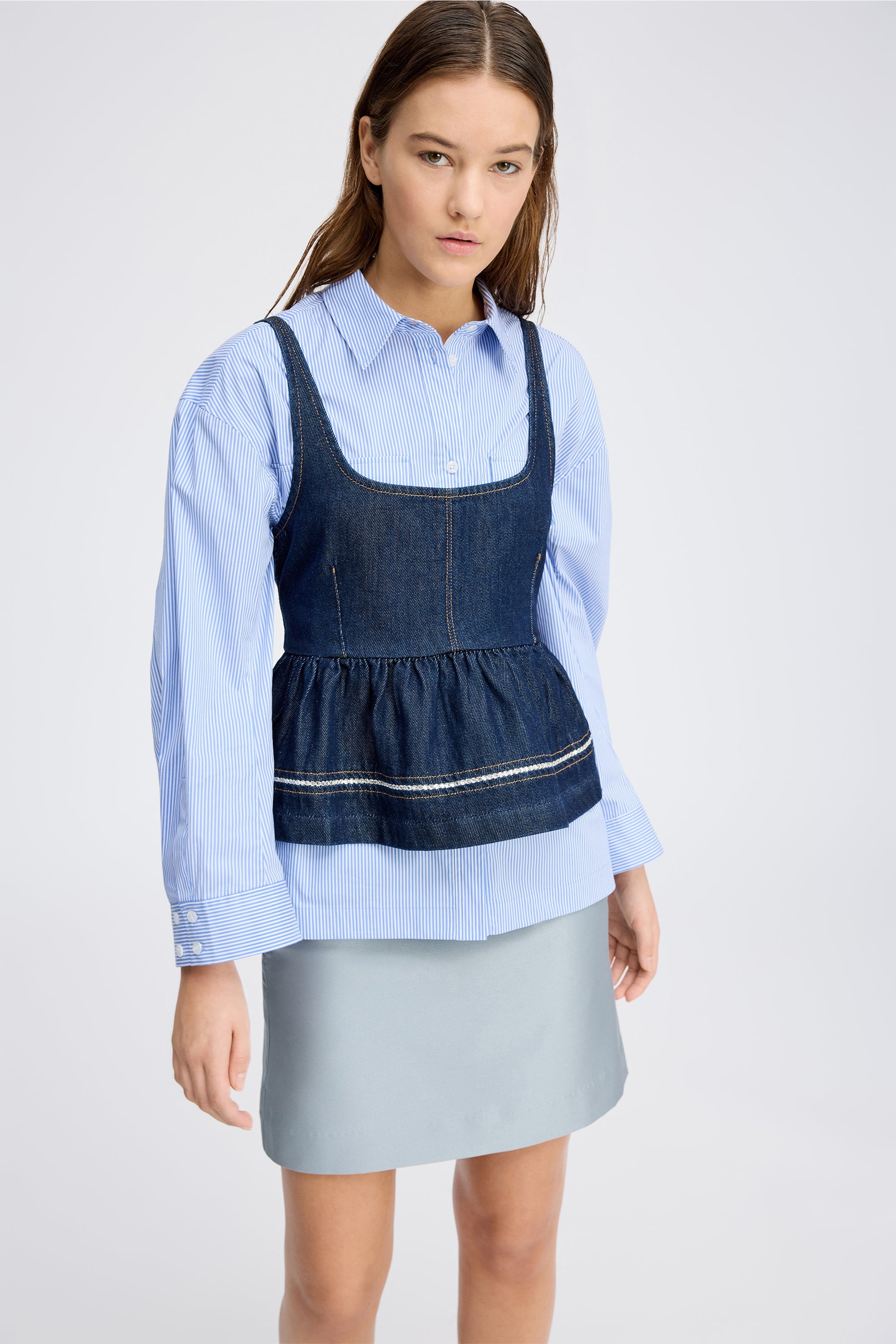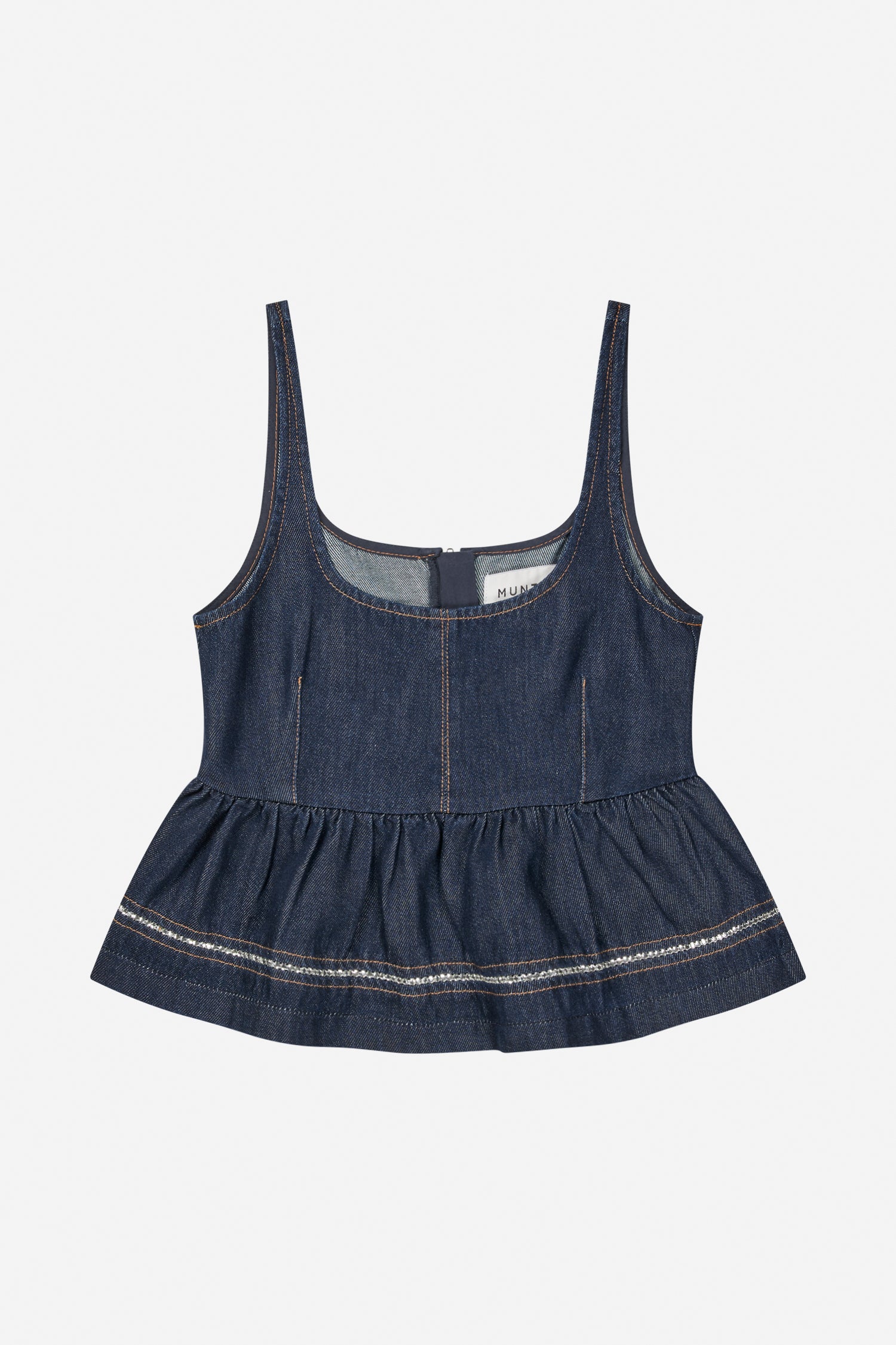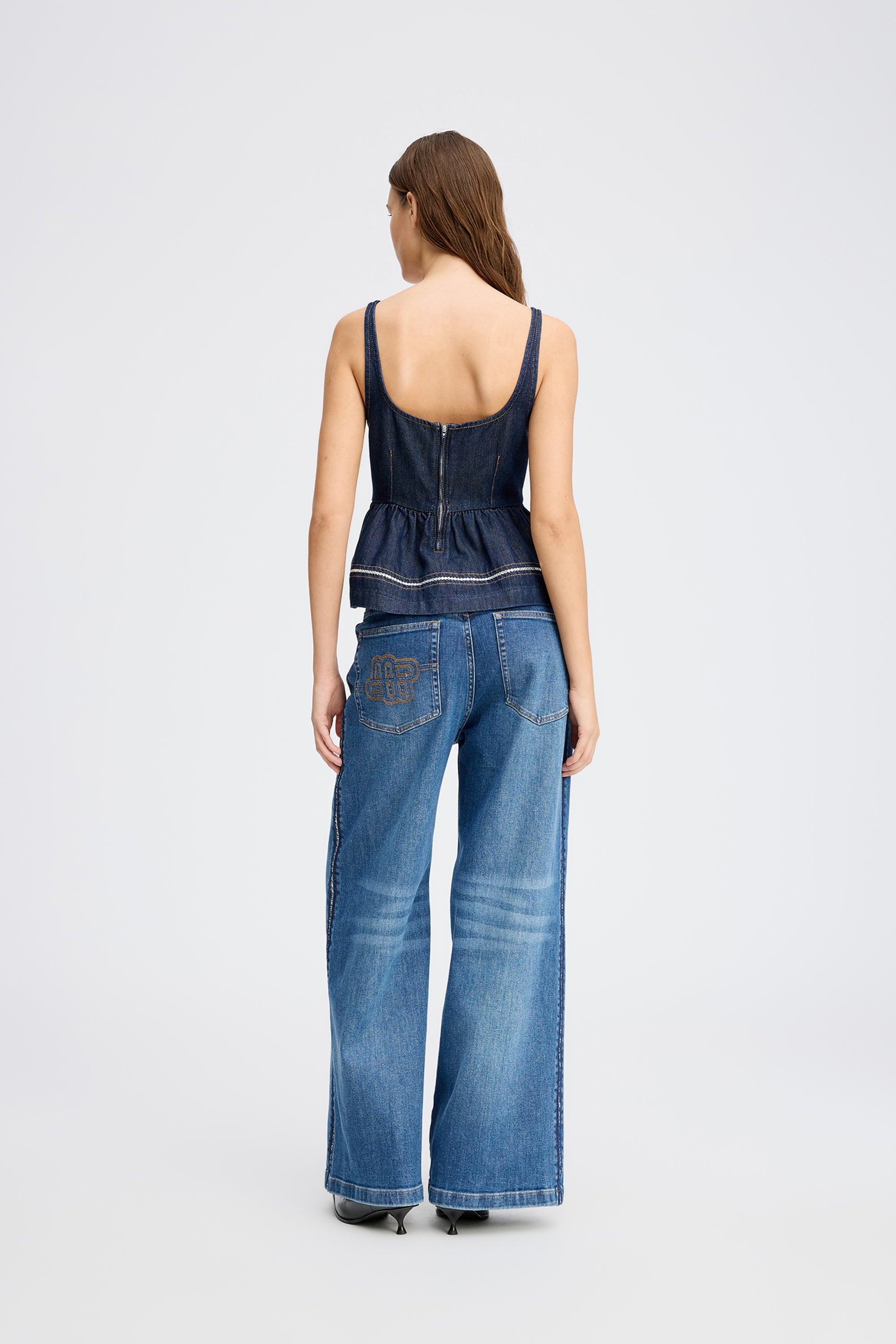 Smuk denim top med brede stropper og et elegant peplum-snit. Toppen har dekorative syninger og fine similisten-detaljer langs kanten.