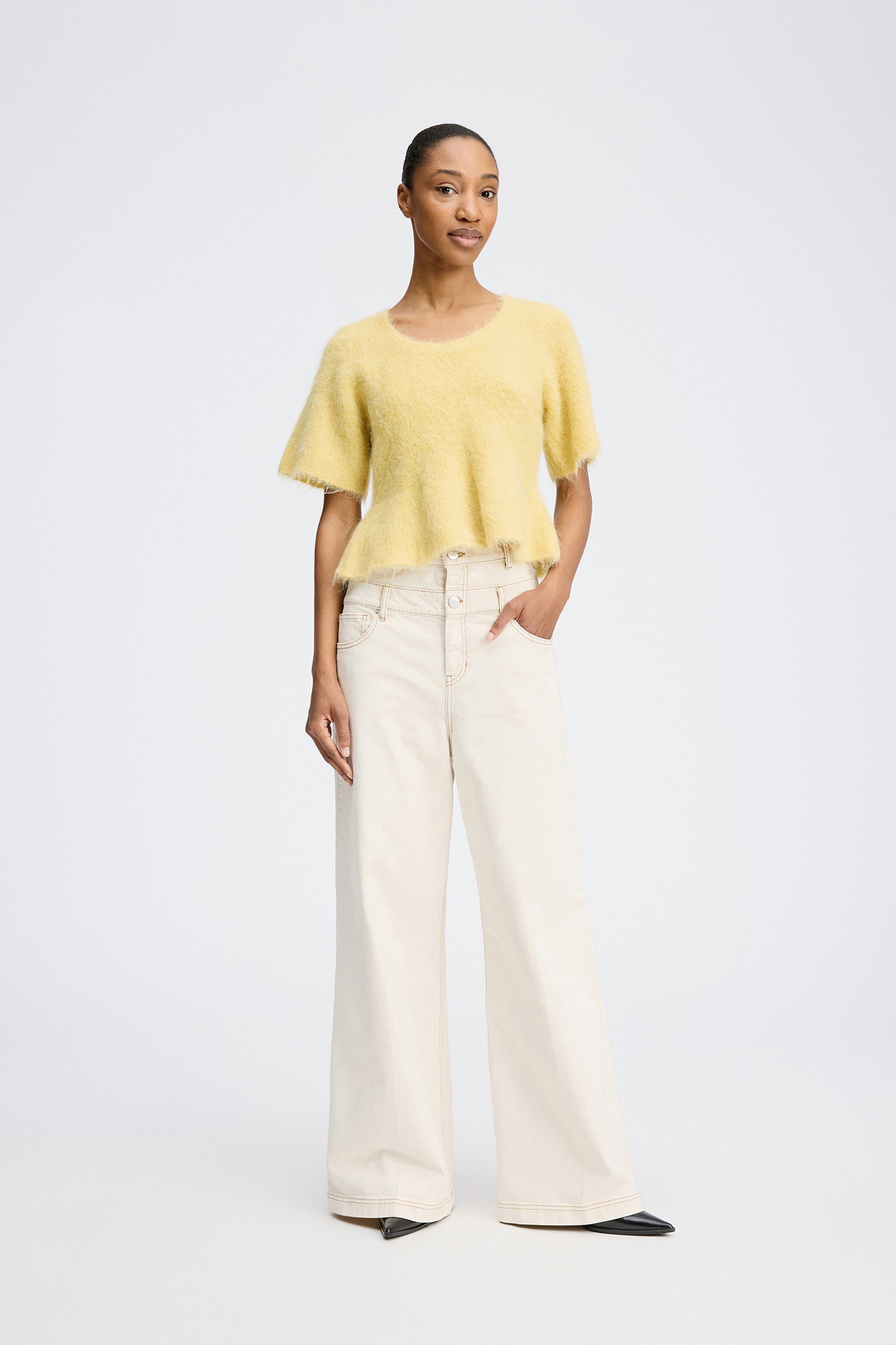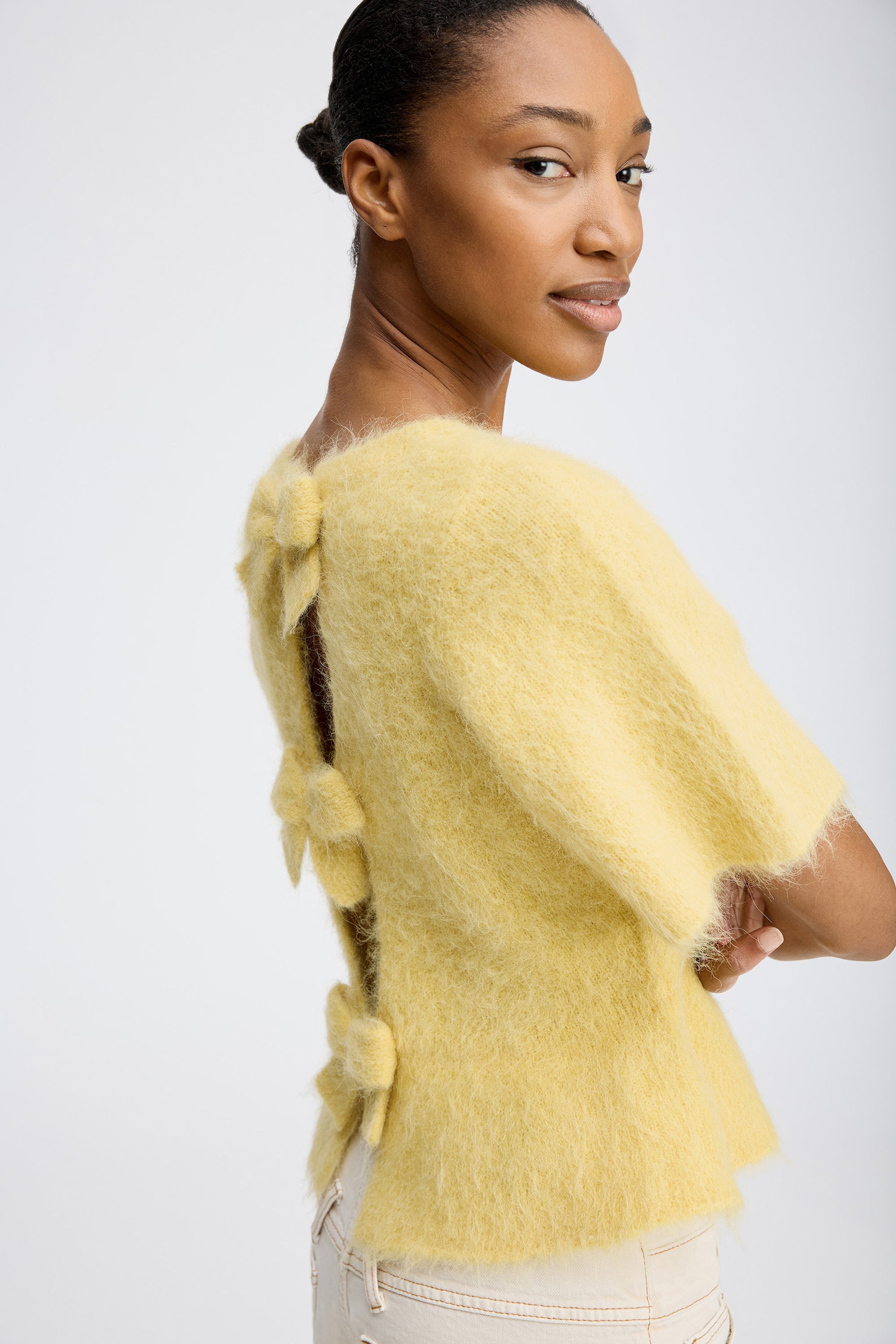 Blød, kortærmet strik med tre smukke sløjfer på ryggen. Den nederste del af strikken er designet med en let peplum-effekt.