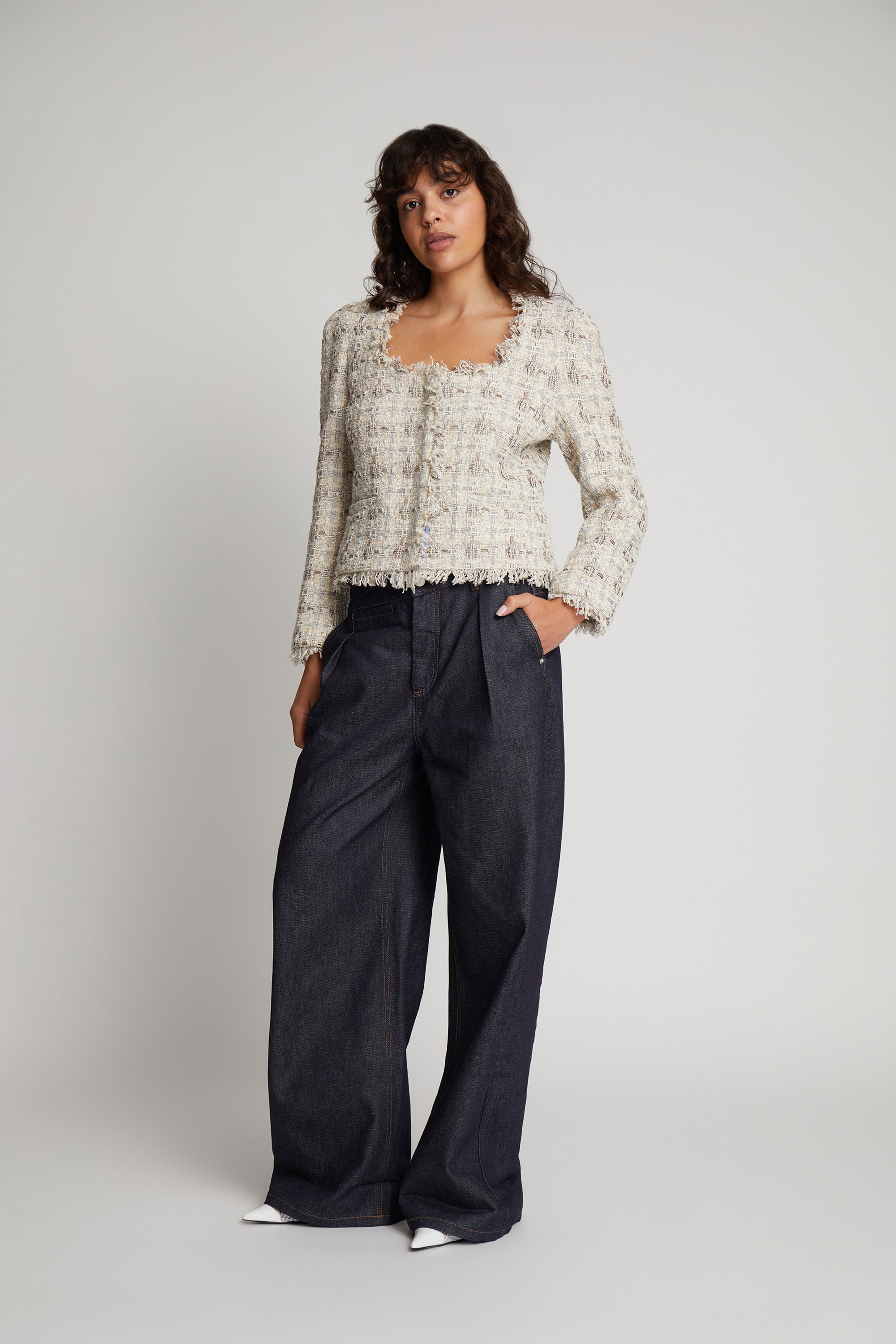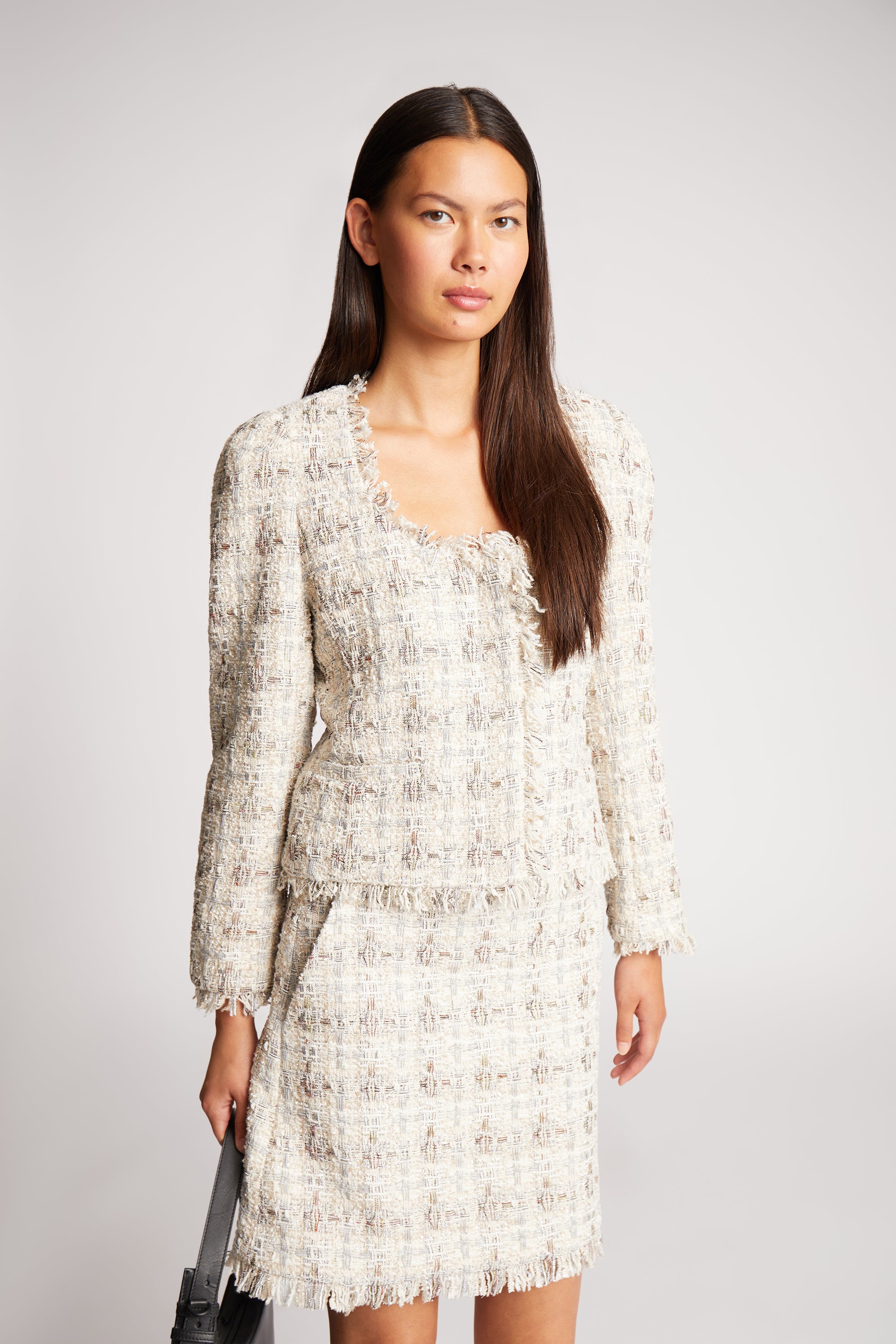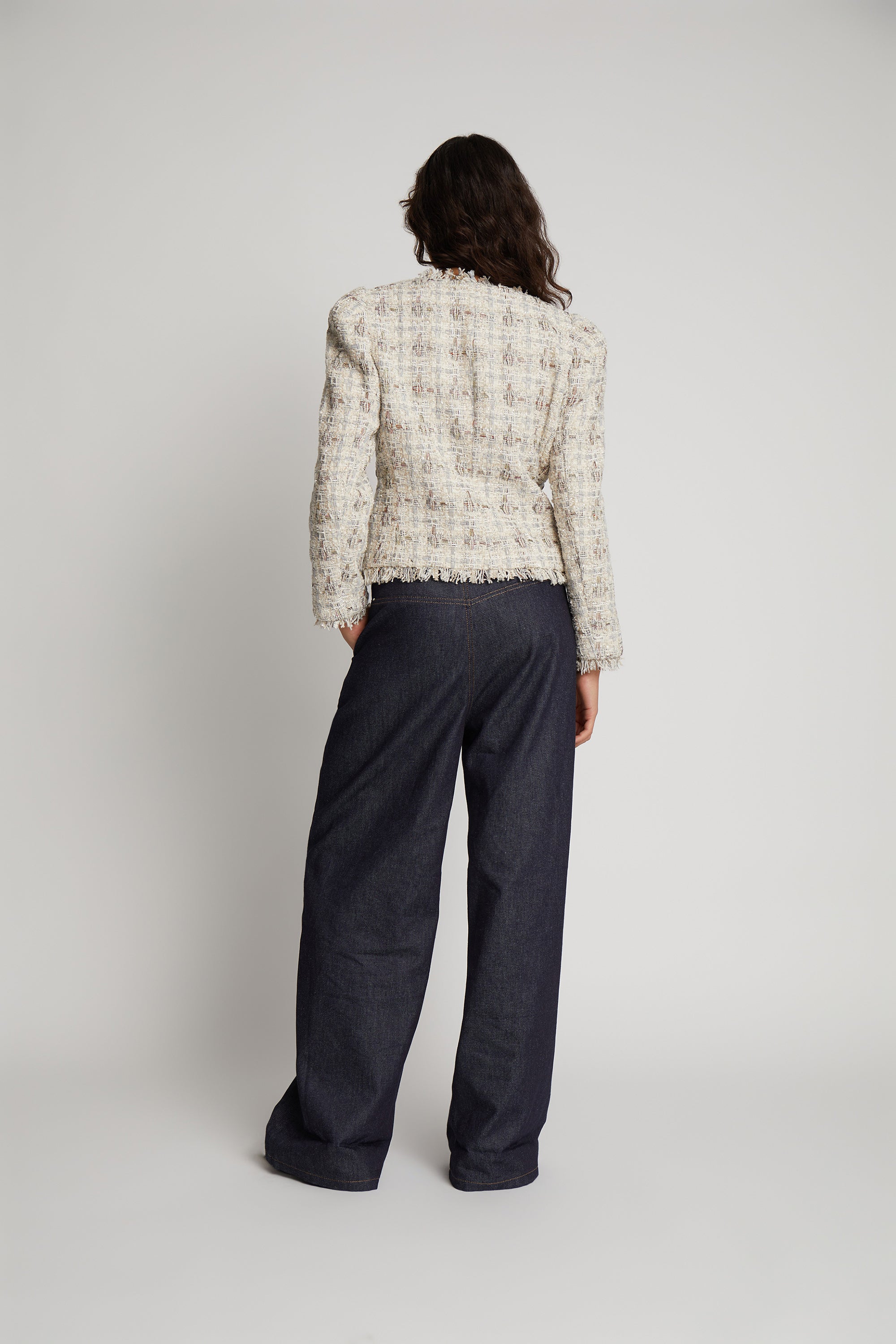 En kort bouclé-jakke designet med små frynser langs kanterne. Denne jakke har lommer, en skjult knaplukning og et elegant mønster med struktur og diskrete farver.