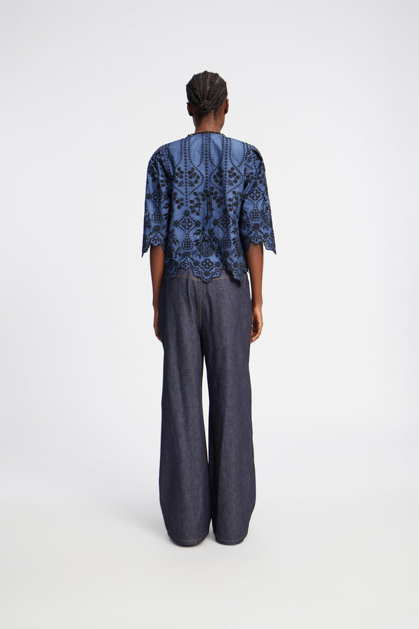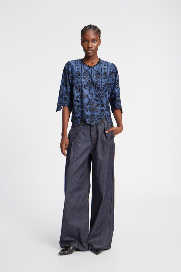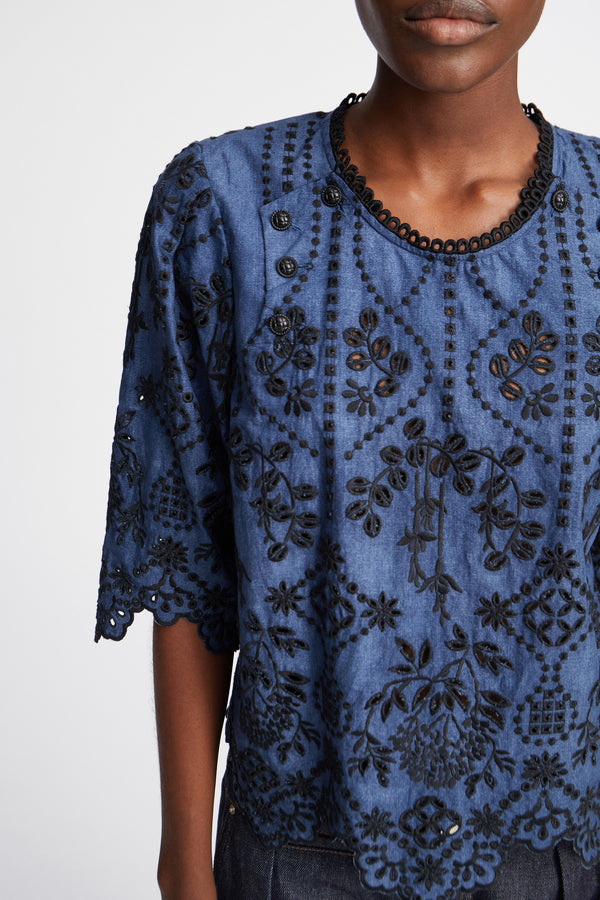 Bluse med et smukt all-over broderi og en elegant detaljeret krave, ærmer og kant nederst. Blusen er lavet af 100% økologisk bomuld og har rund hals med en elegant knaplukning i nakken.