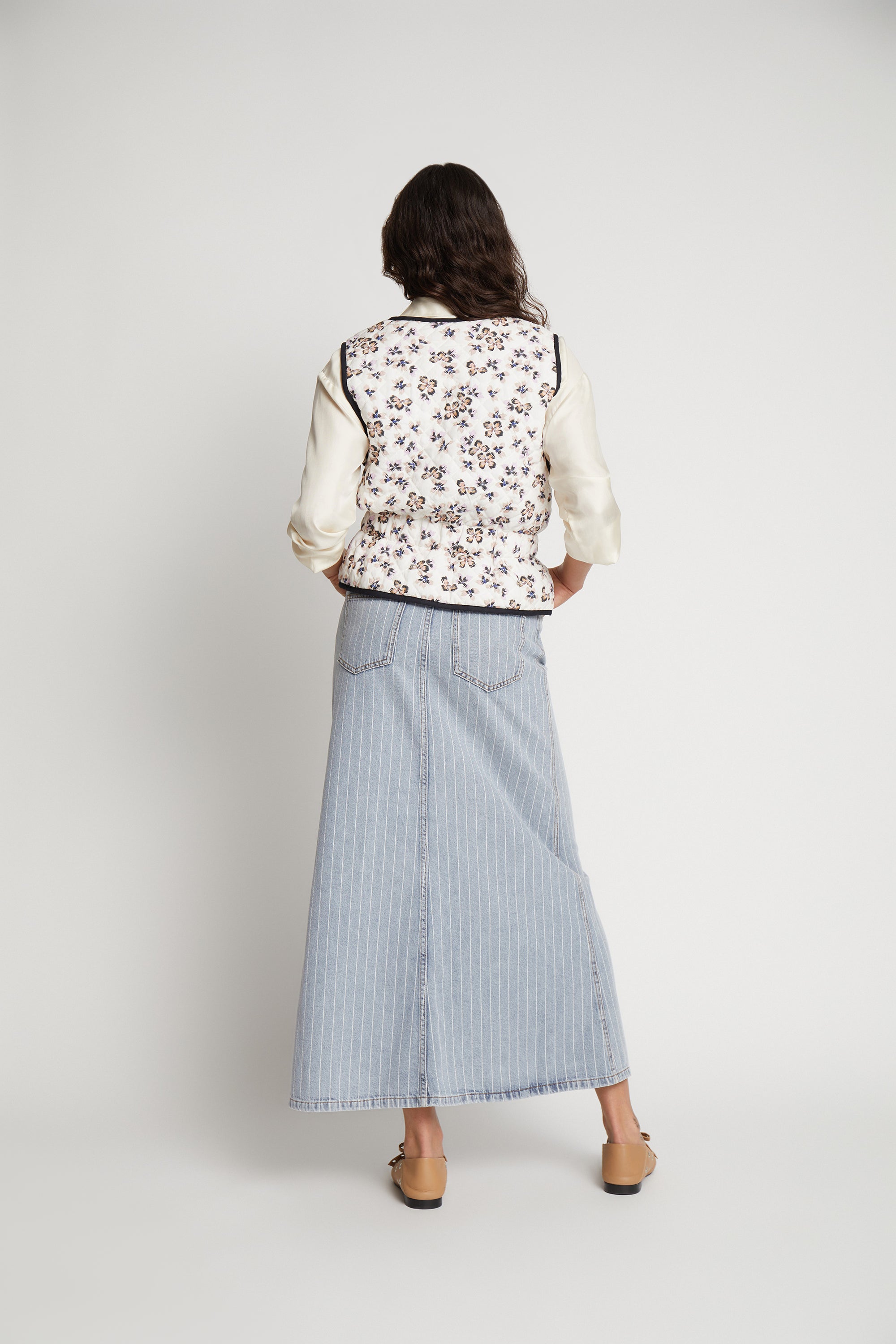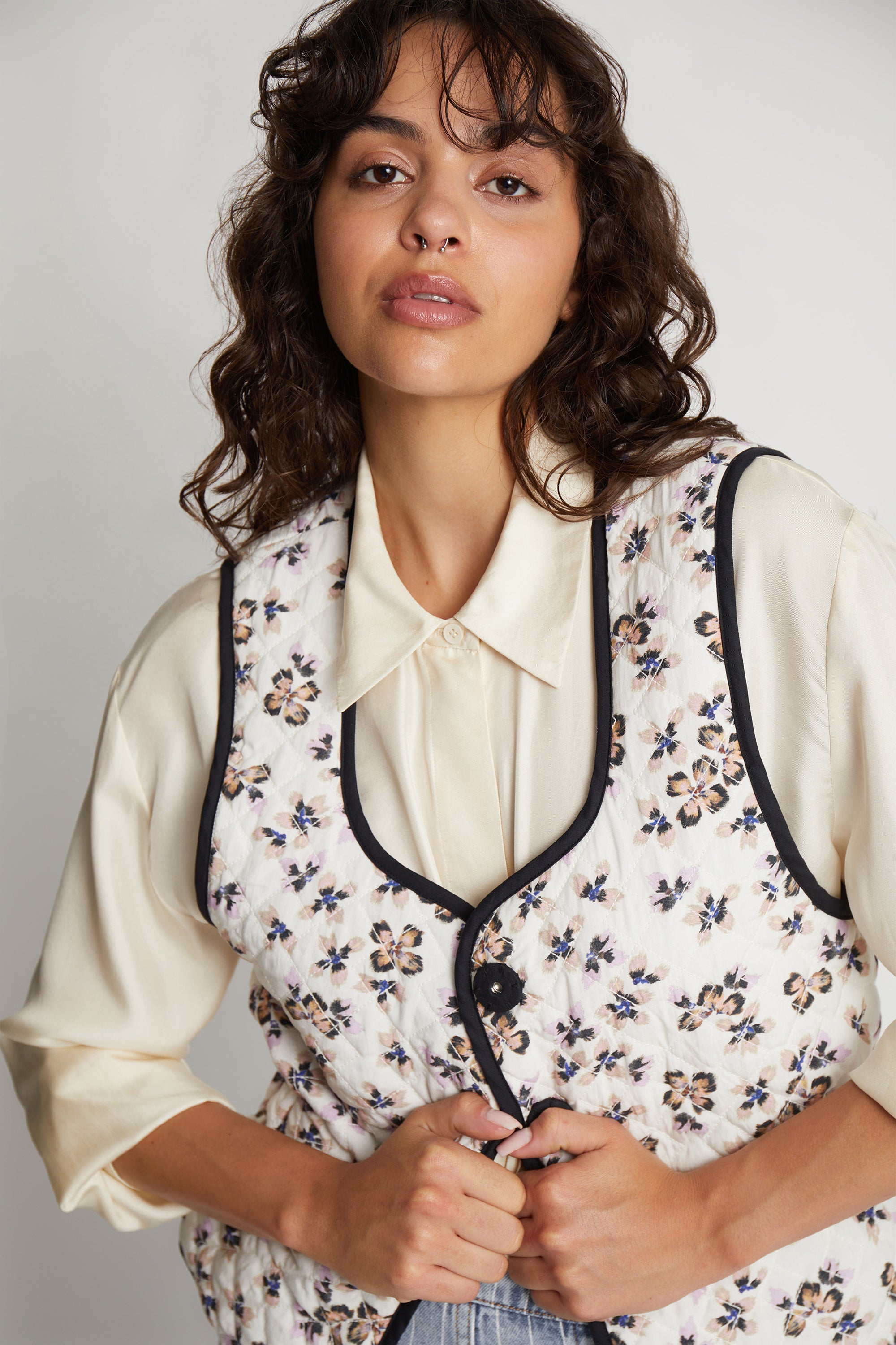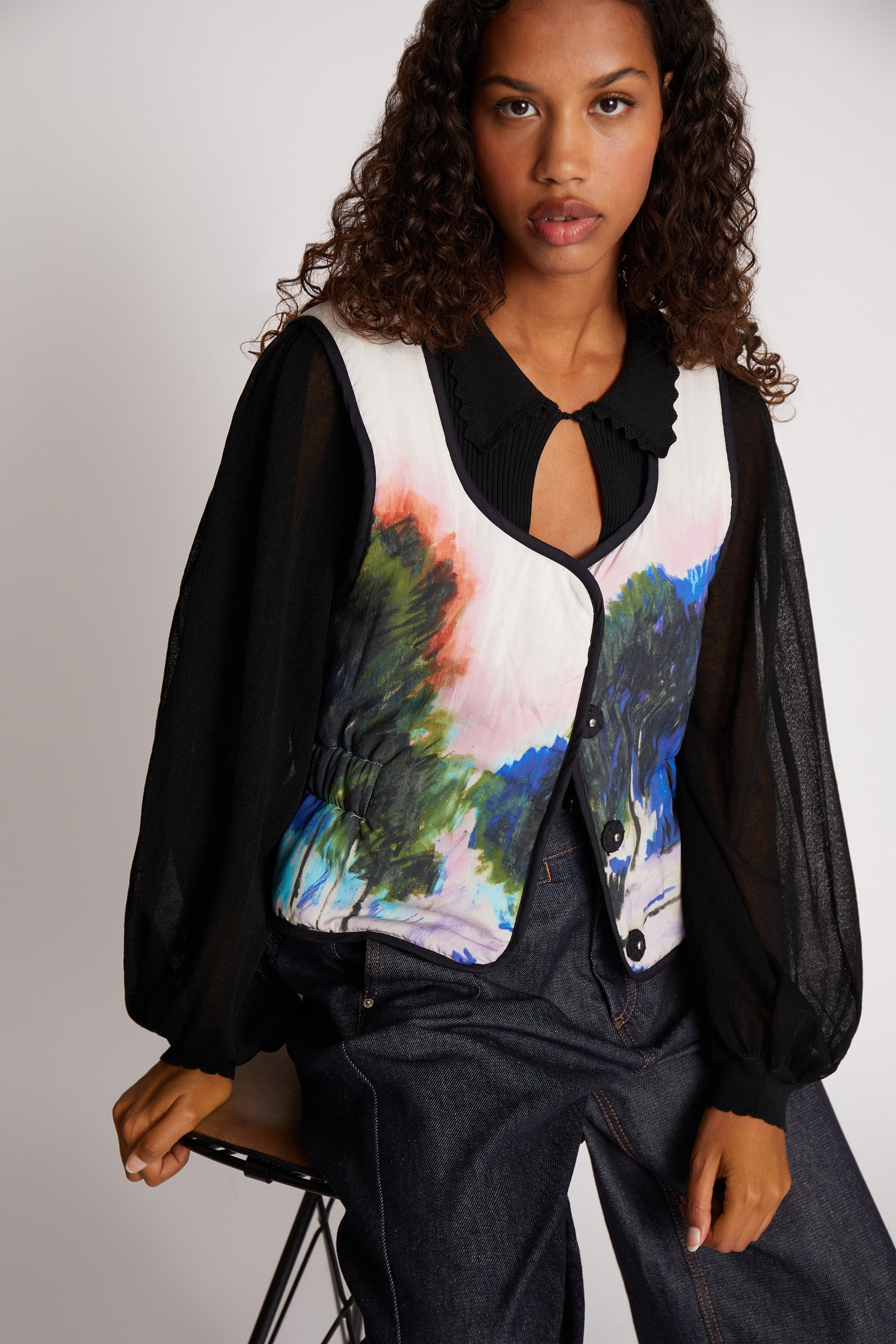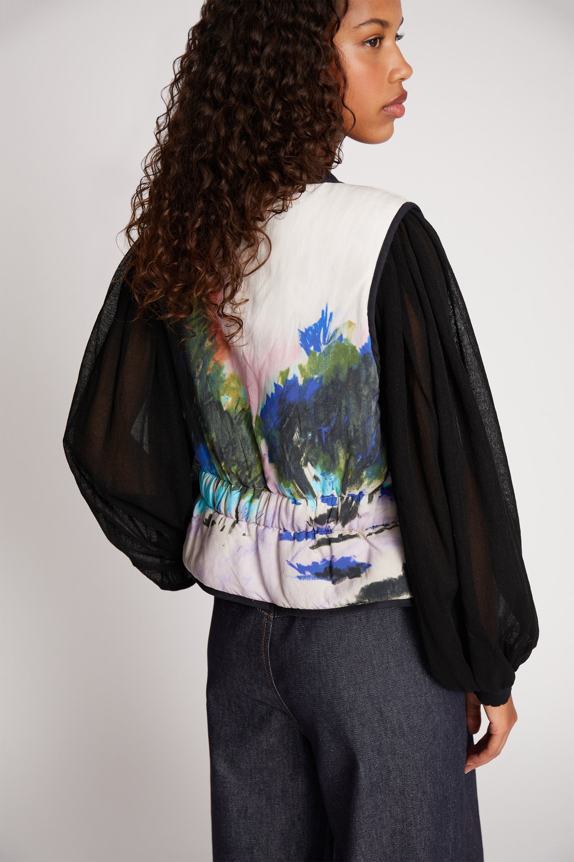 En smuk, alsidig og polstret vest, designet med muligheden for at vende vesten, og opnå et farveskift. Vesten har et elegant all-over blomsterprint på den ene side og et smukt kunstnerisk landskabsprint på den anden side. Denne vest er lavet med en fin definerende elastik detalje i taljen og en skjult knaplukning foran.