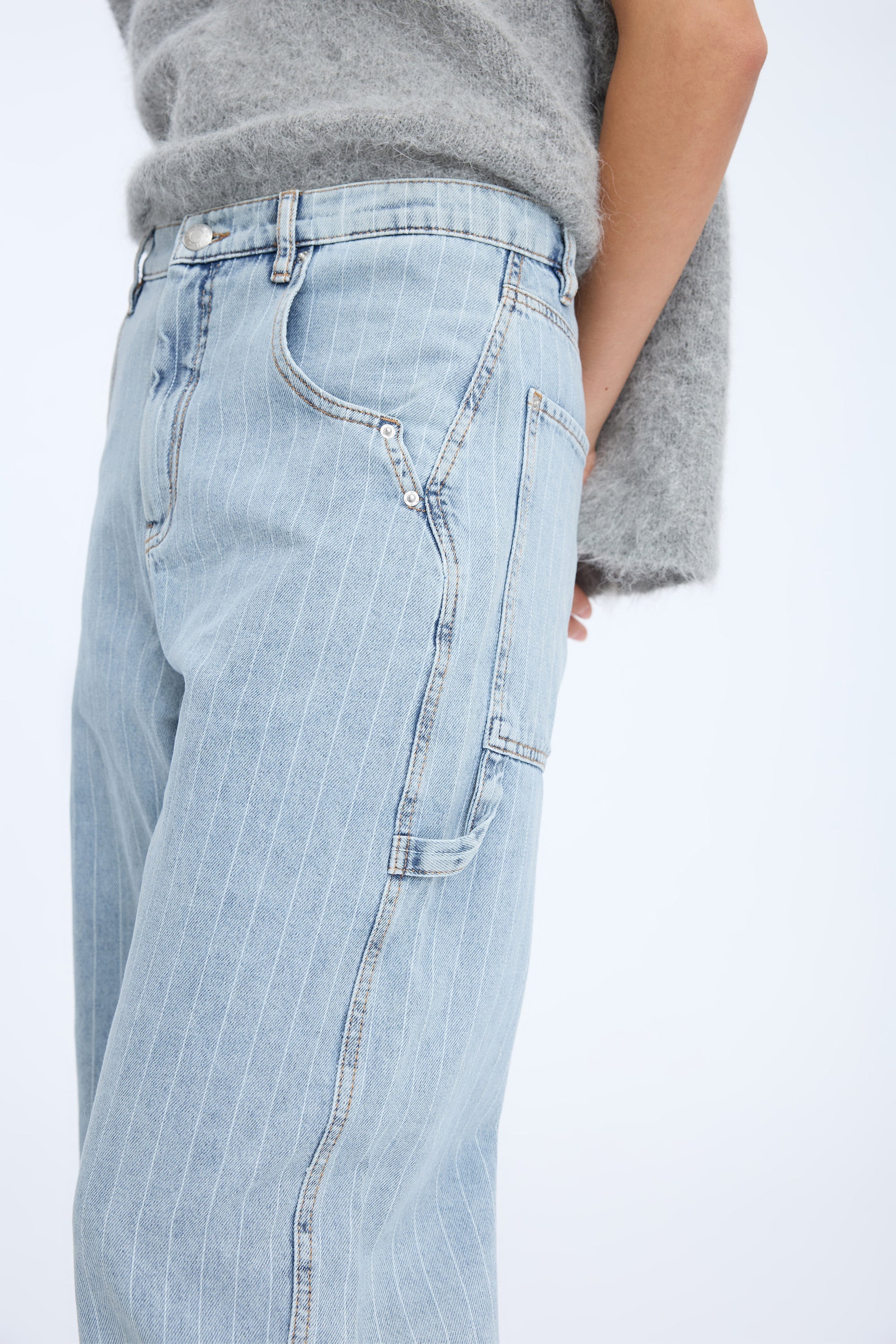 Denim bukser med elegante nålestriber, oversize baglommer og cargo buks inspirerede detaljer. Bukserne er lavet af 100% økologisk bomuld.