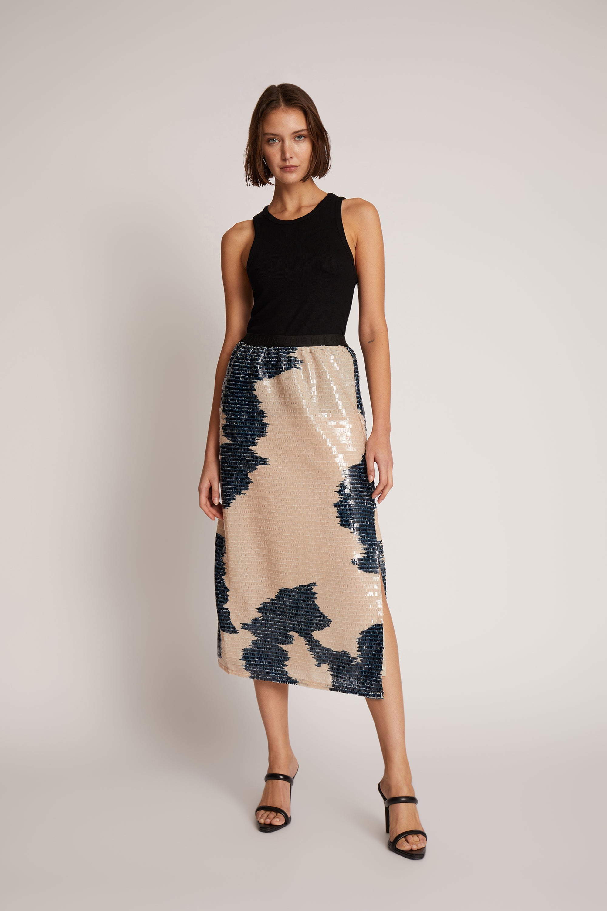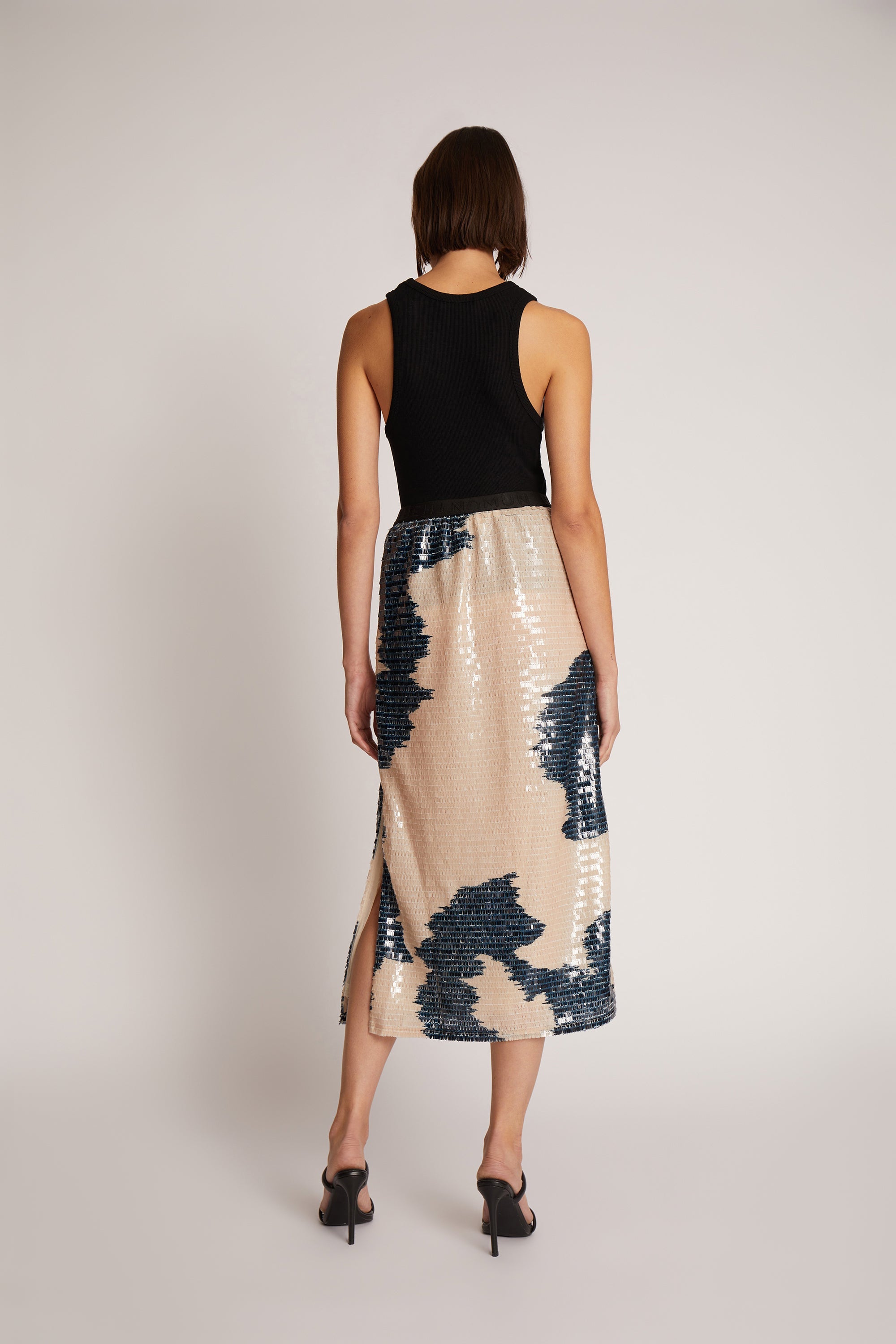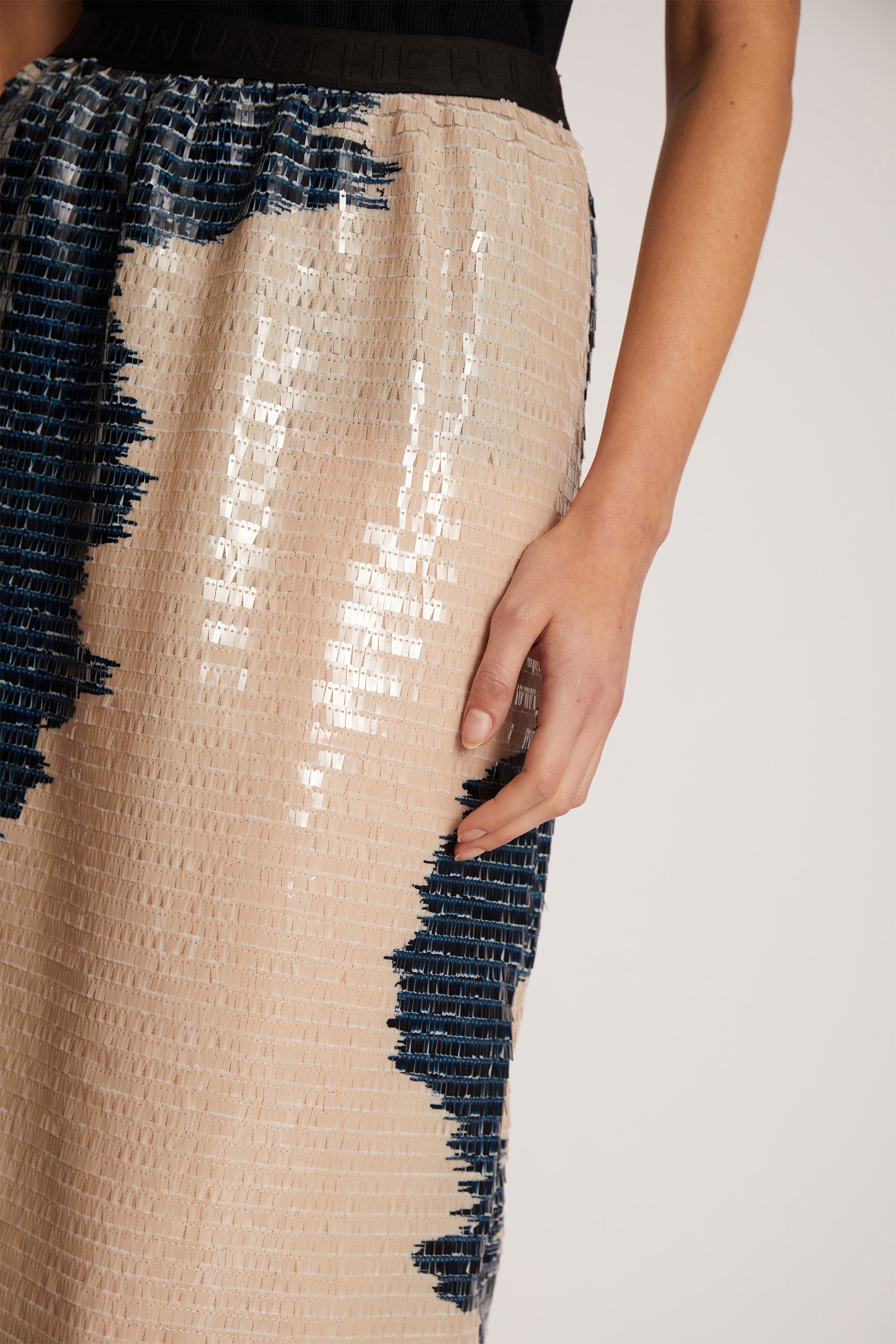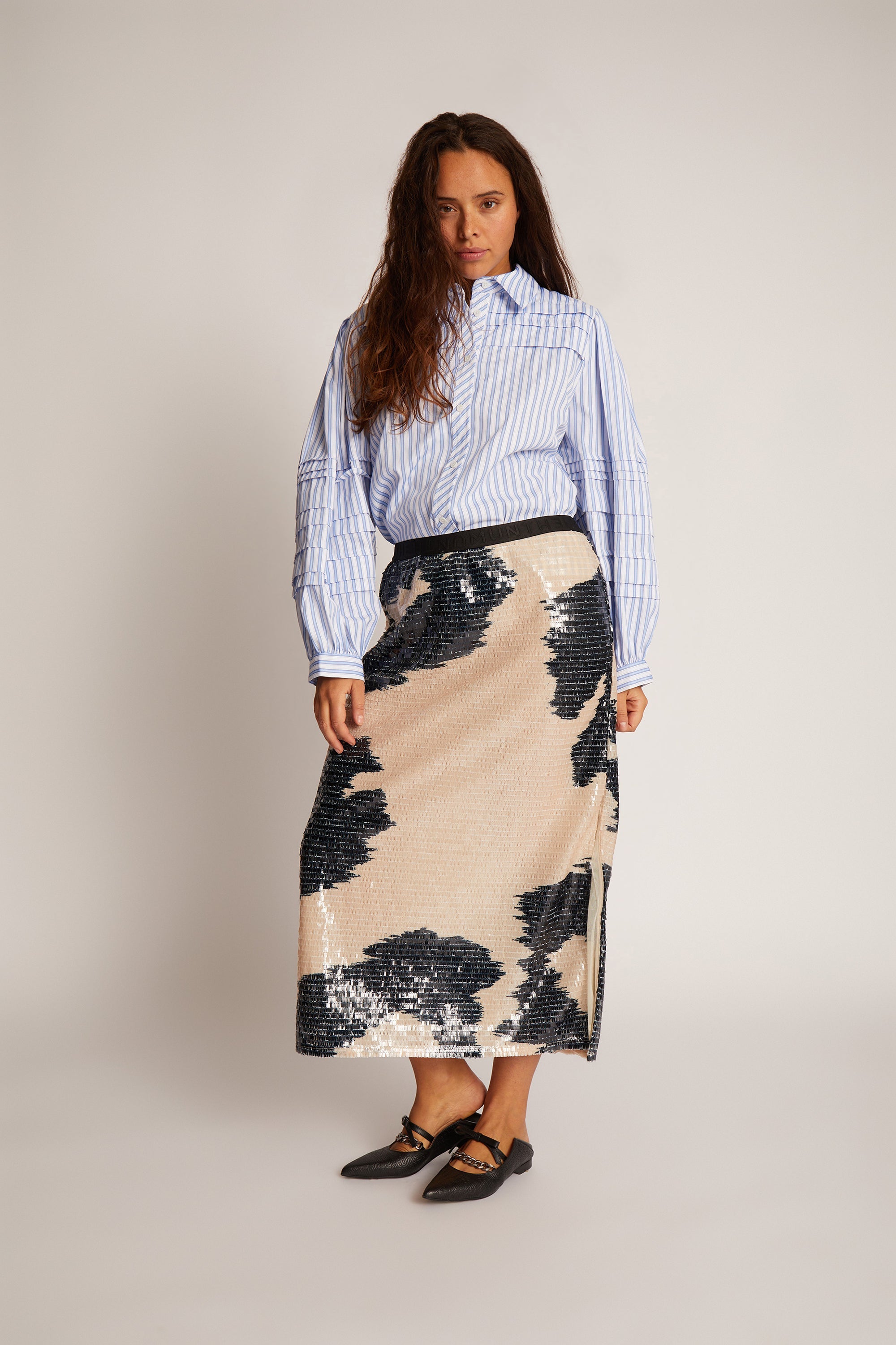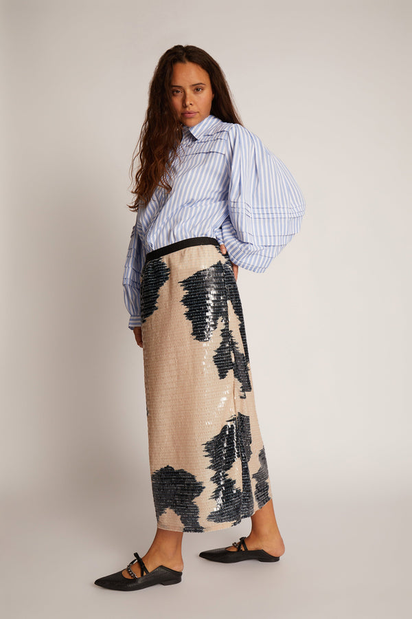 Figursyet nederdel med et smukt paillet mønster og en elegant slids. Nederdelen har et elastisk kantebånd i taljen og er designet til et løst fit.