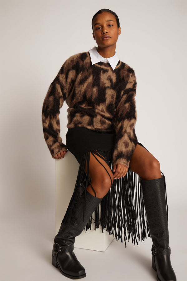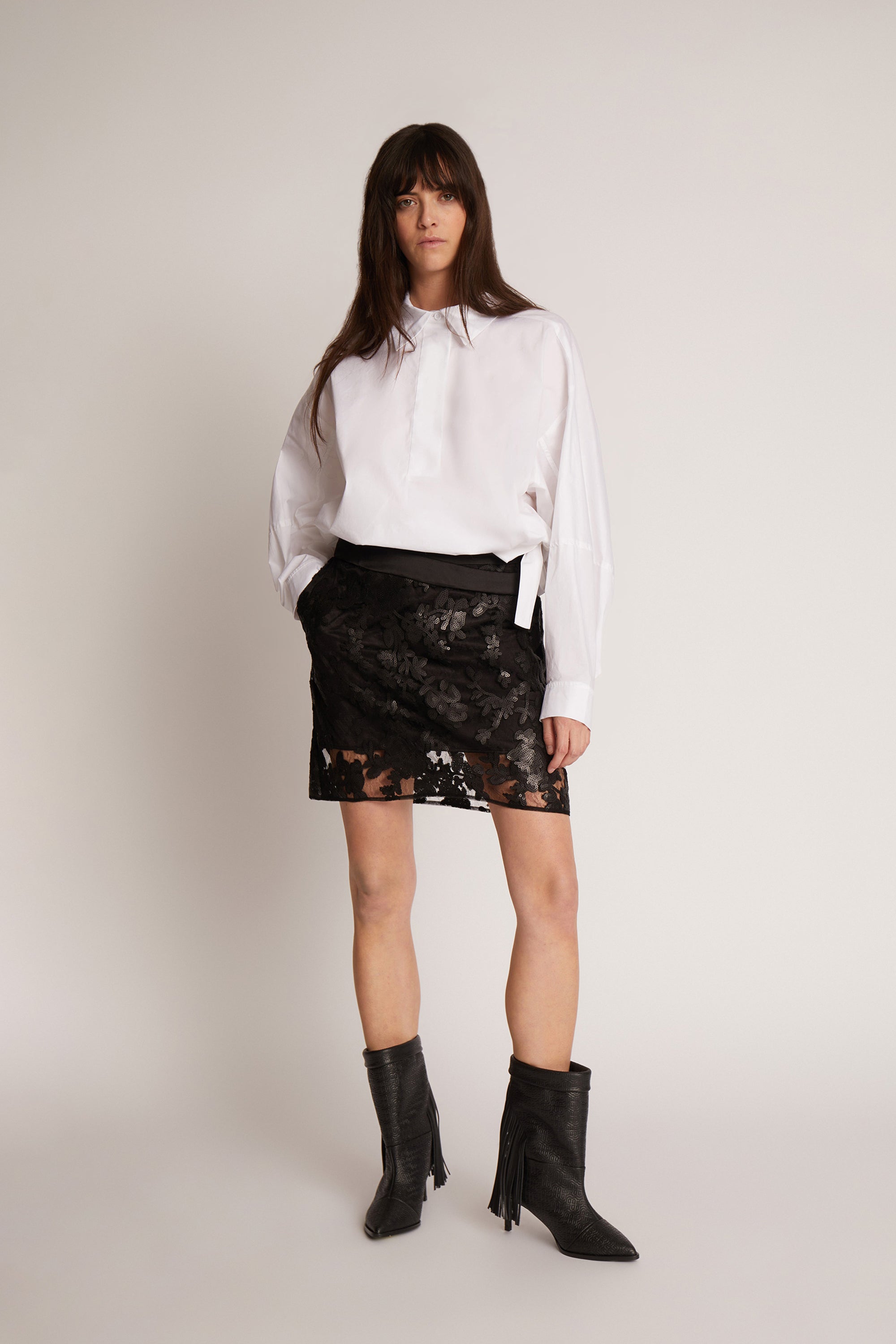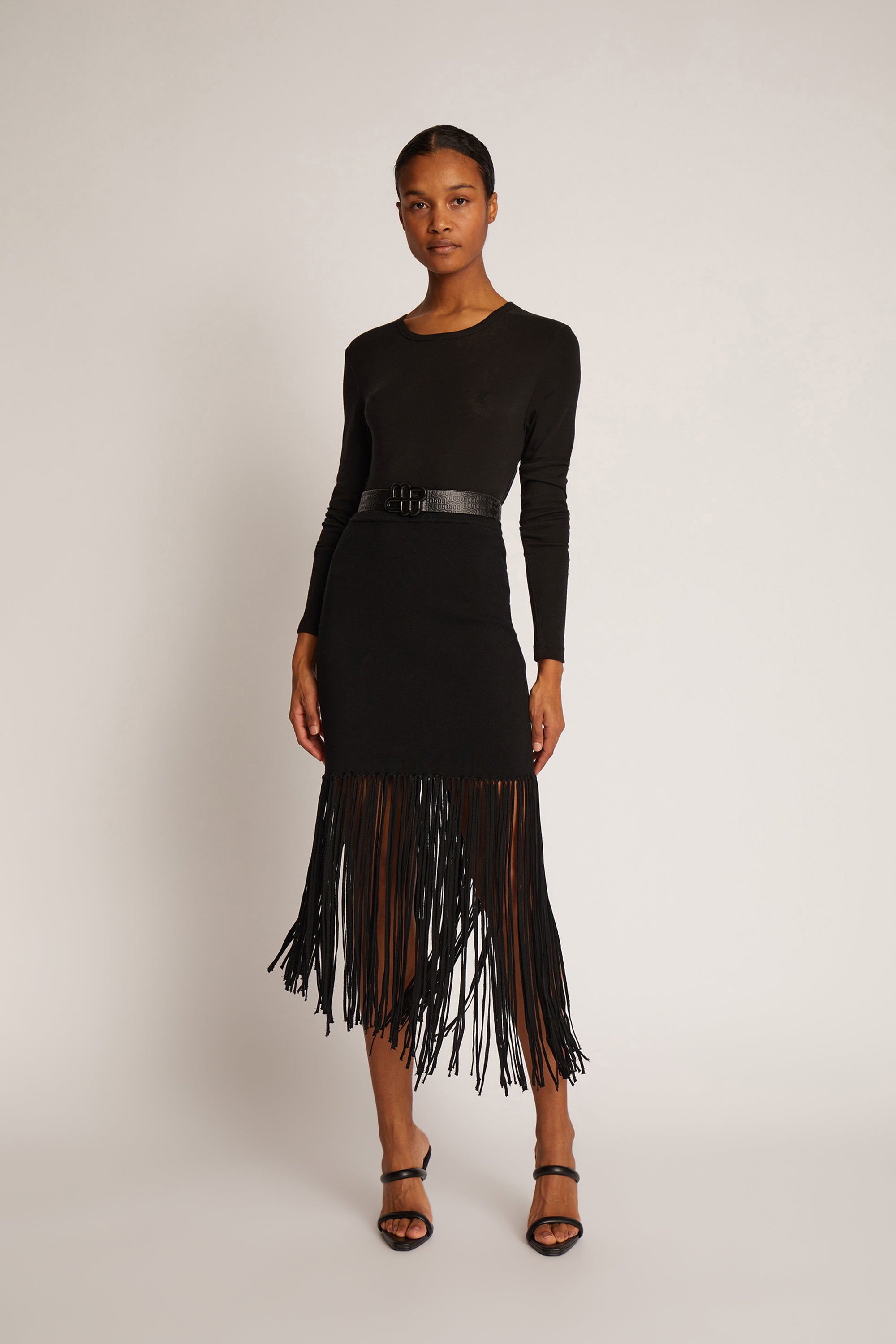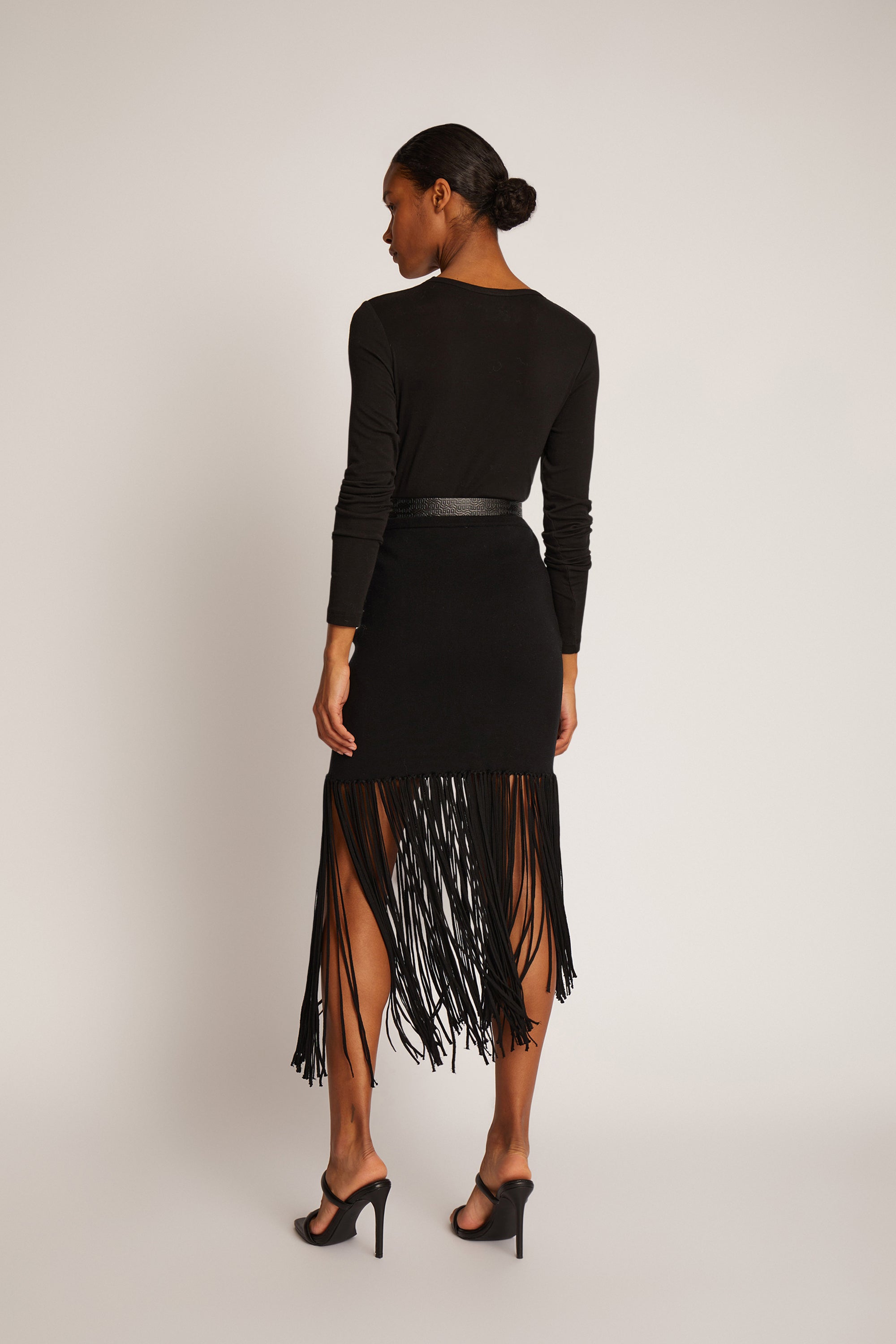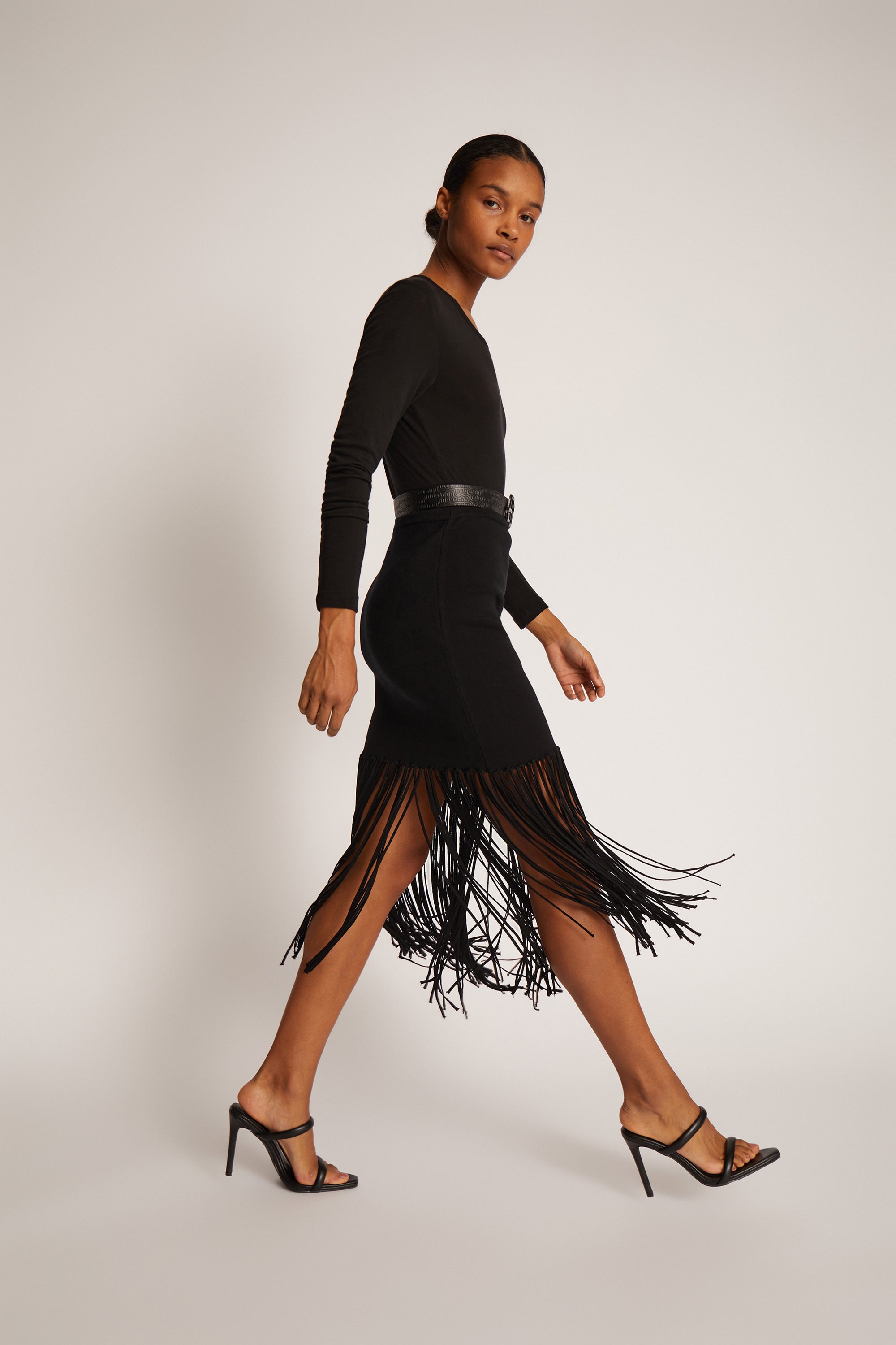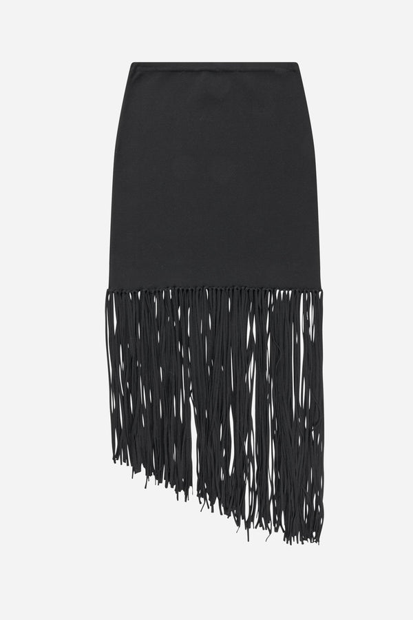 En smuk, figursyet nederdel med elegante frynser, og et asymmetrisk look nederst.