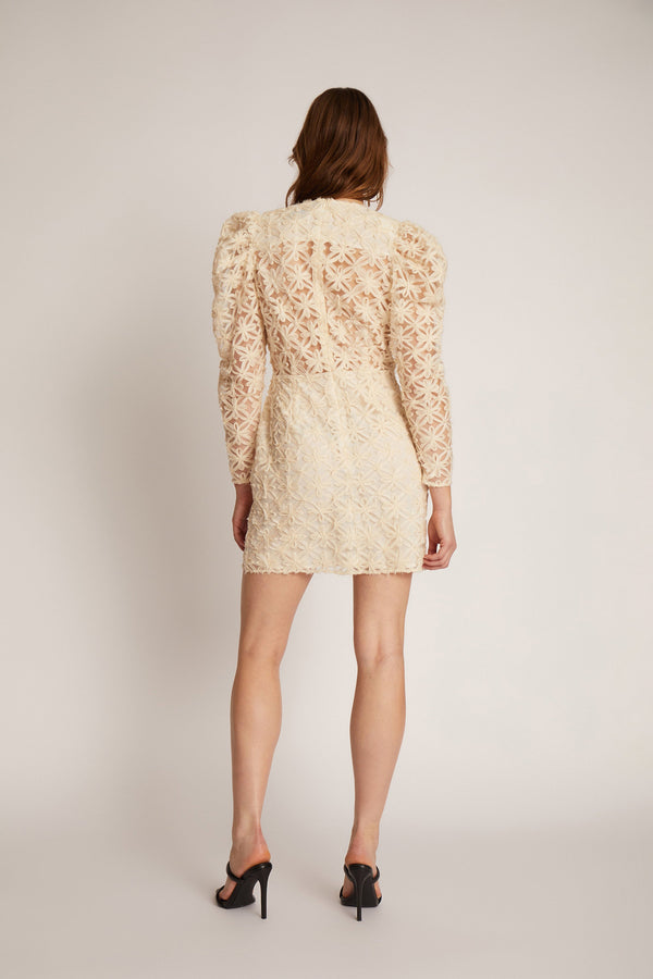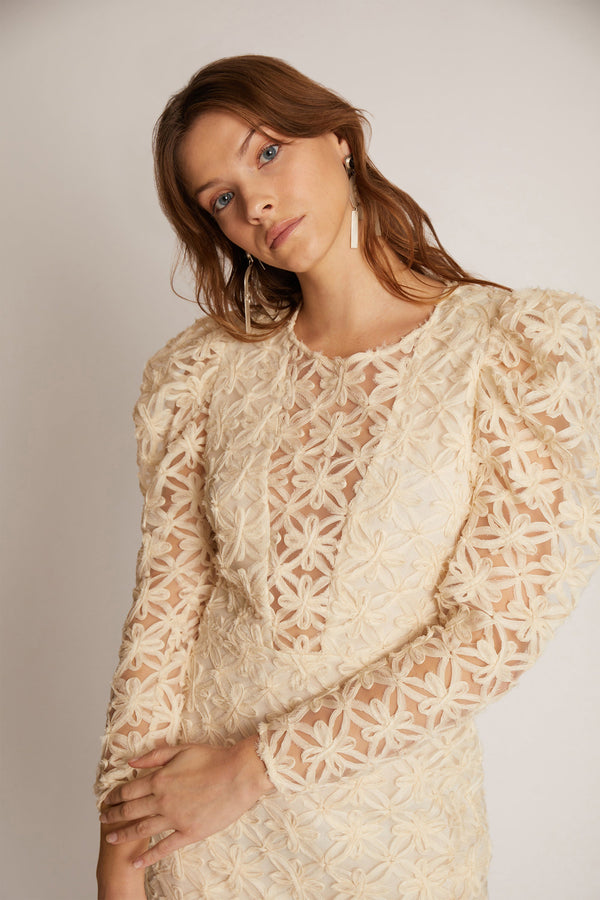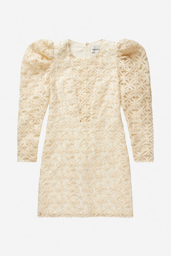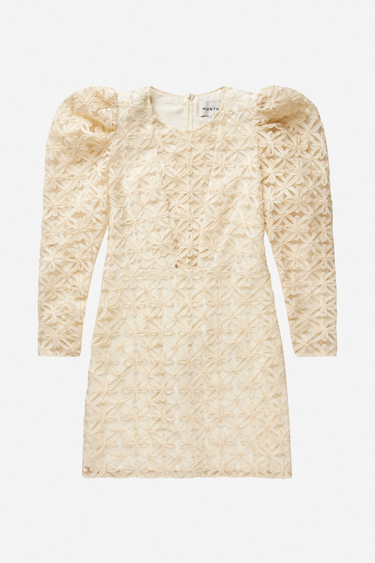 En semi-transparent kjole med smukke all-over blomster applikationer. Kjolen har ærmer med et elegant puff fra skulder til albue og den lukkes med en lynlås på ryggen.