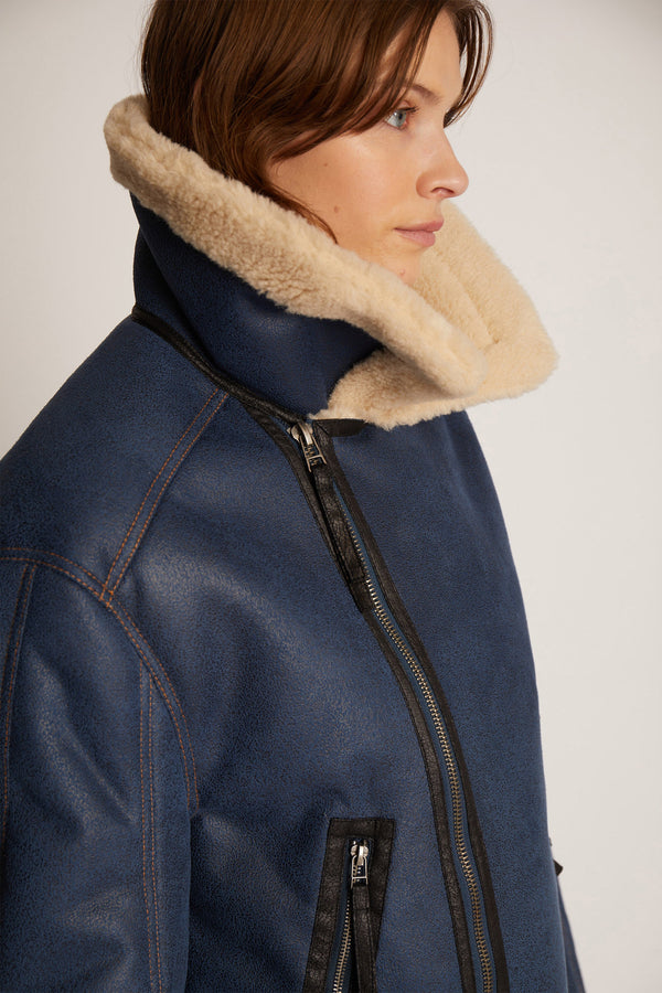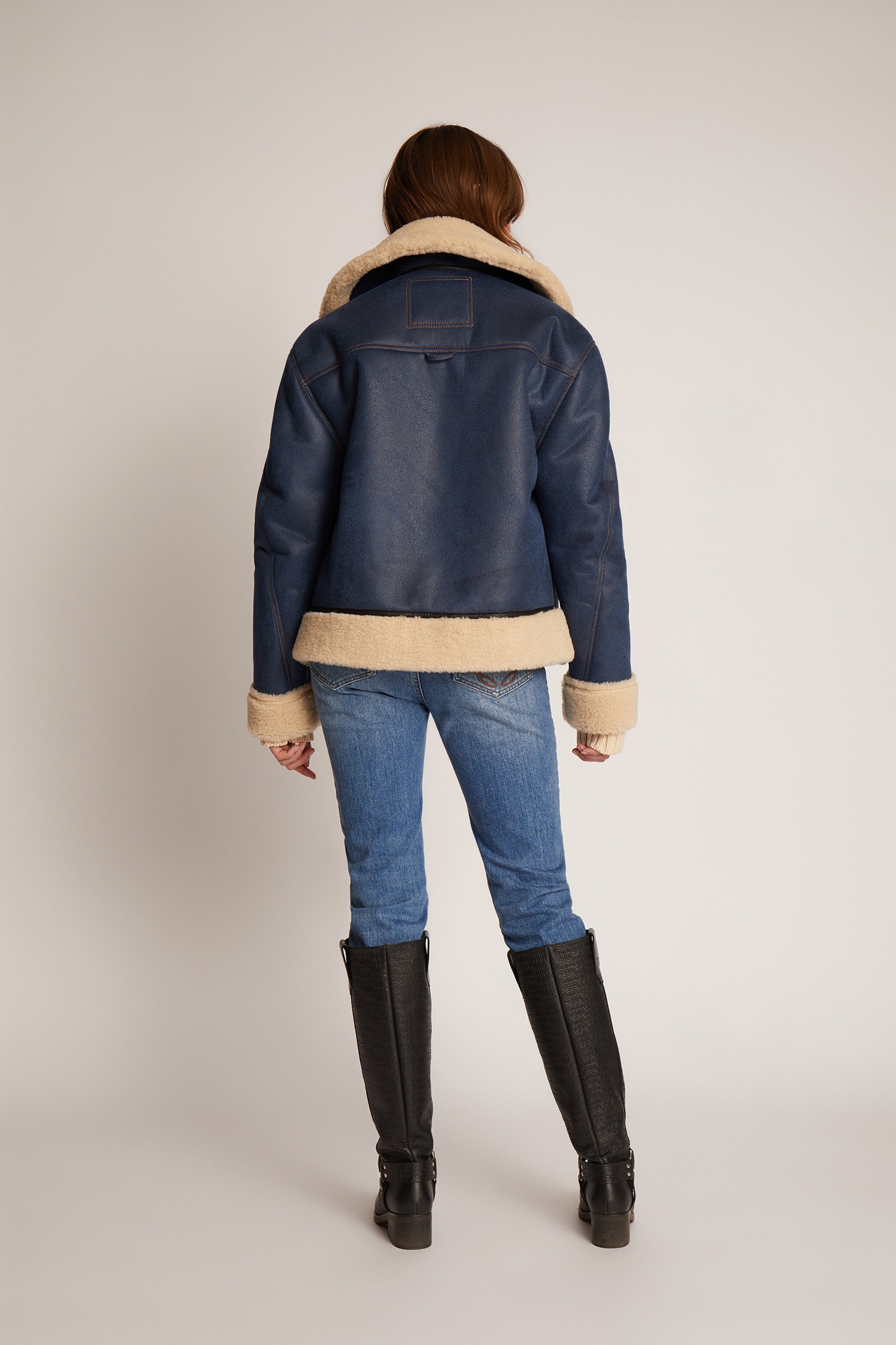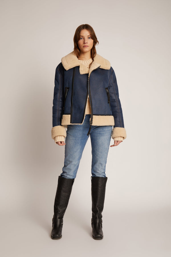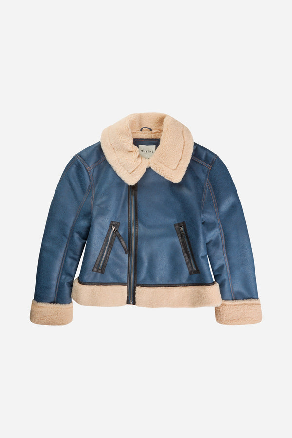 En elegant jakke lavet af vegansk læder, designet med en bred krave og lynlåslommer. Denne jakke har sorte kanter foran og bagpå. Jakken er lavet til en løs pasform.