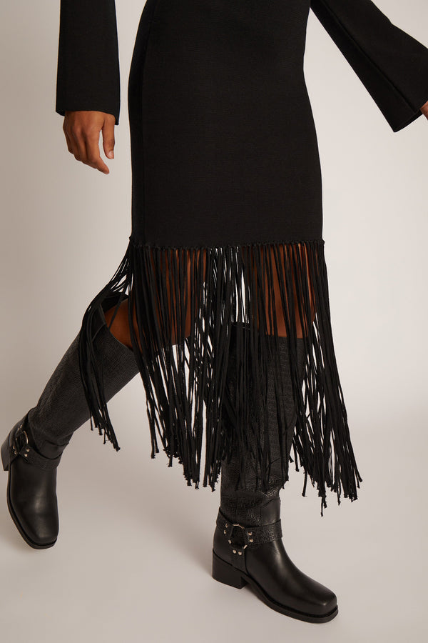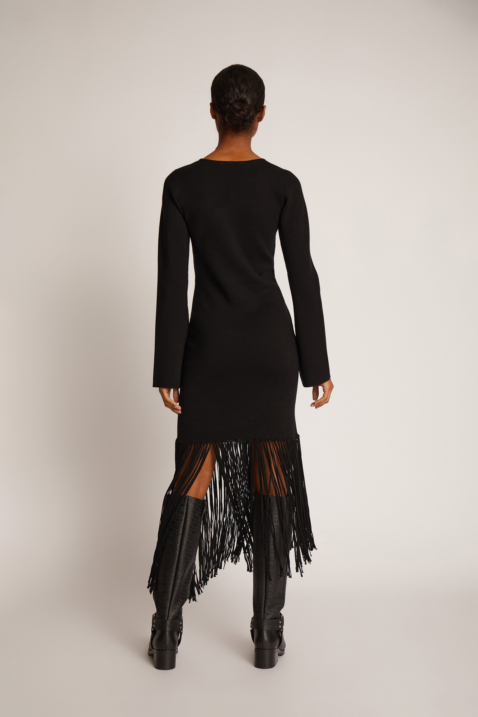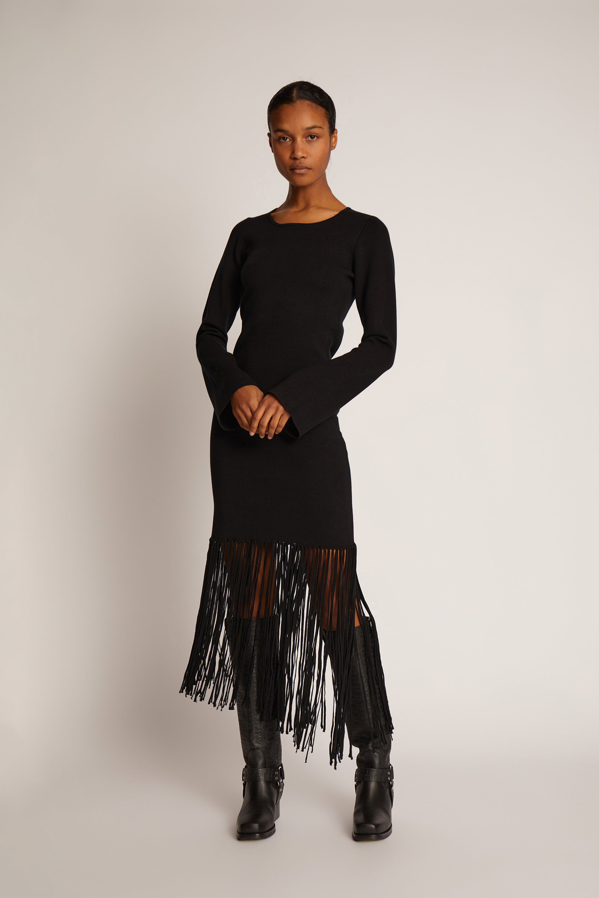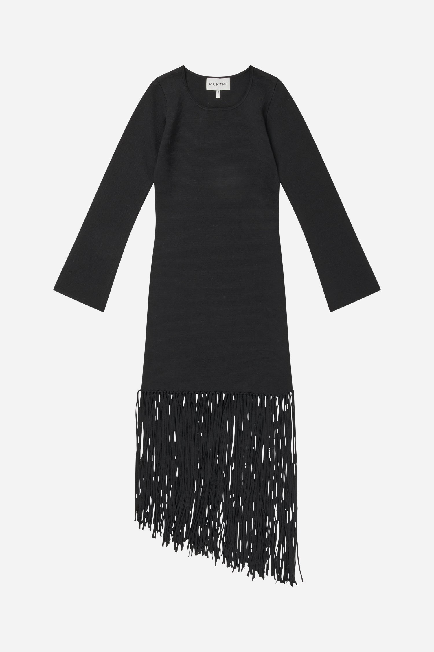 Blød strik kjole designet med elegante frynser, skåret i et asymmetrisk look forneden. Denne strik kjole er figursyet og har lange ærmer.