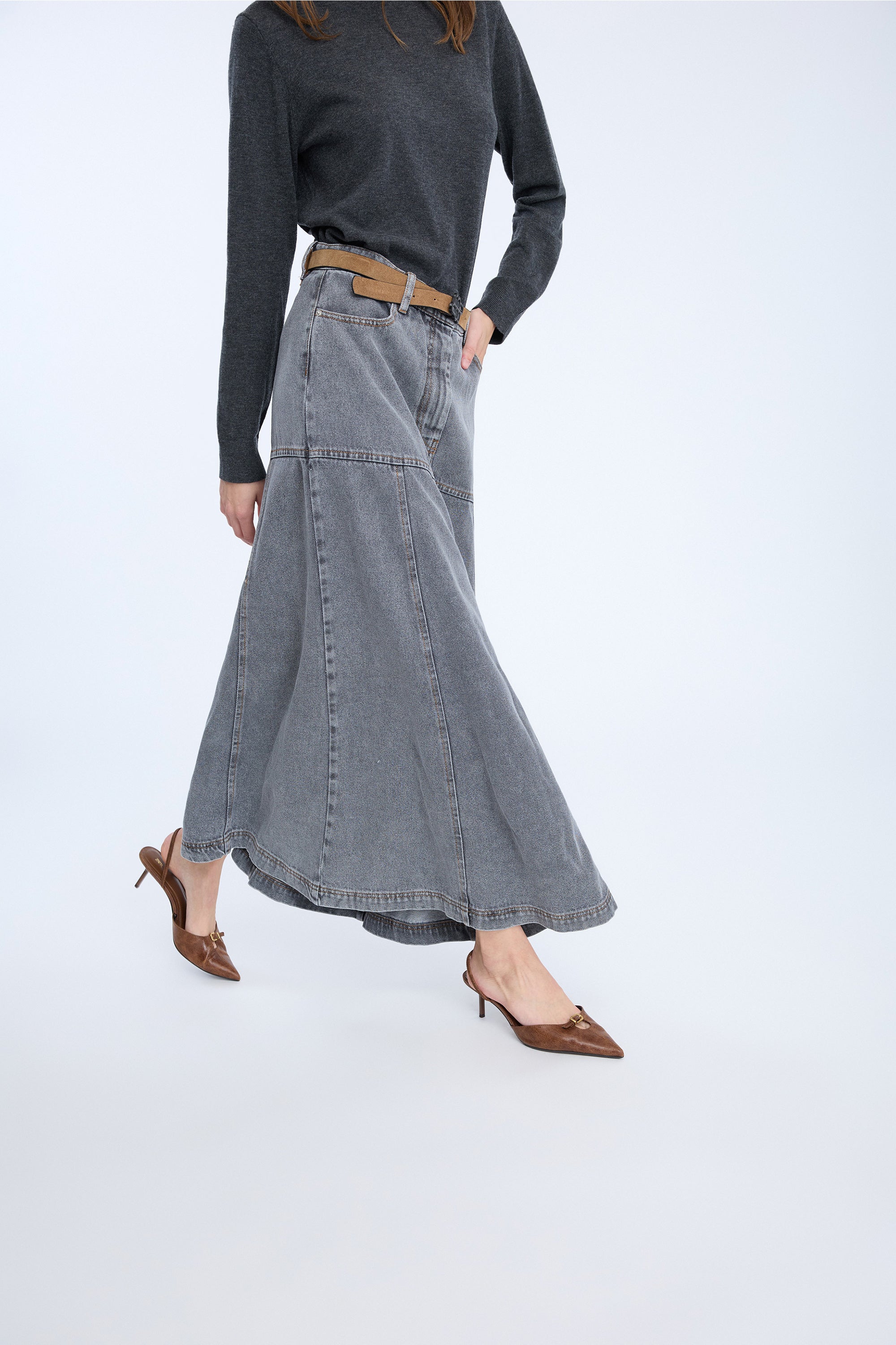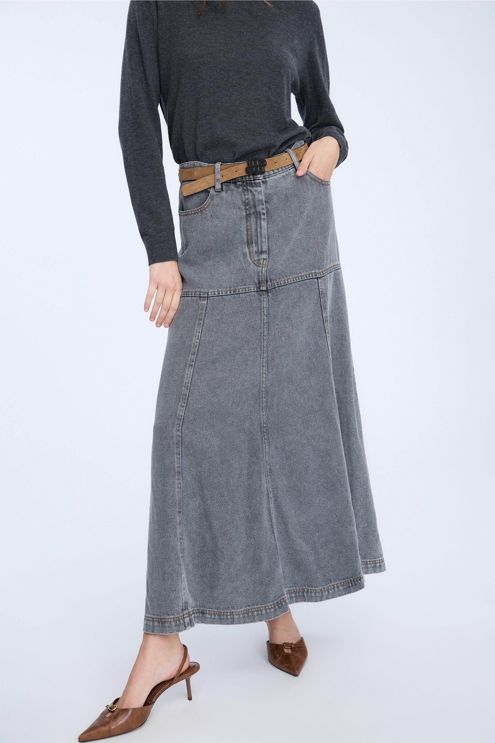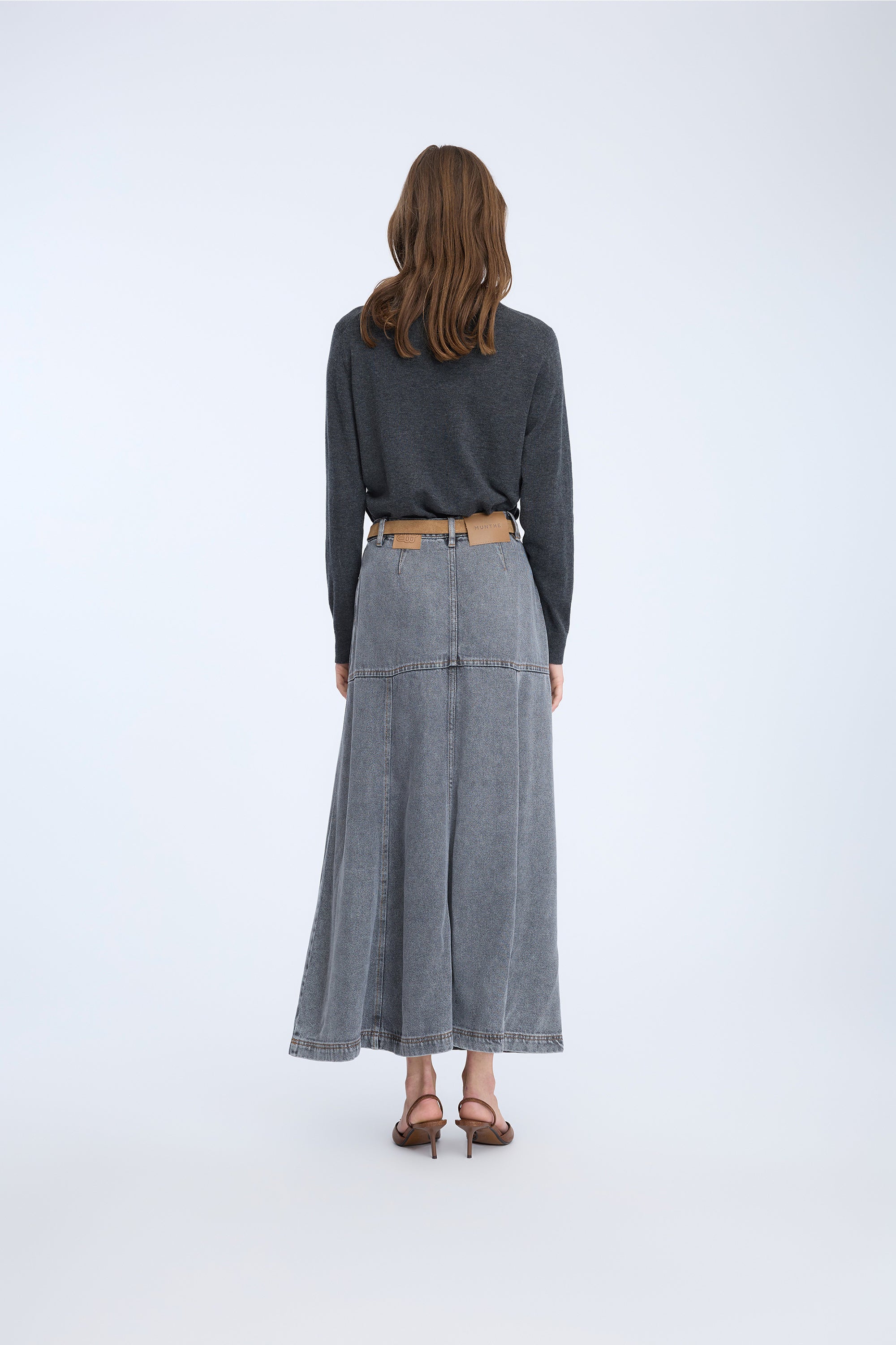 En smuk denim nederdel med en tætsiddende pasform omkring hofterne, og en kontrast flair effekt fra hofterne og ned. Nederdelen er designet med bæltestropper, lommer og har en normal pasform.