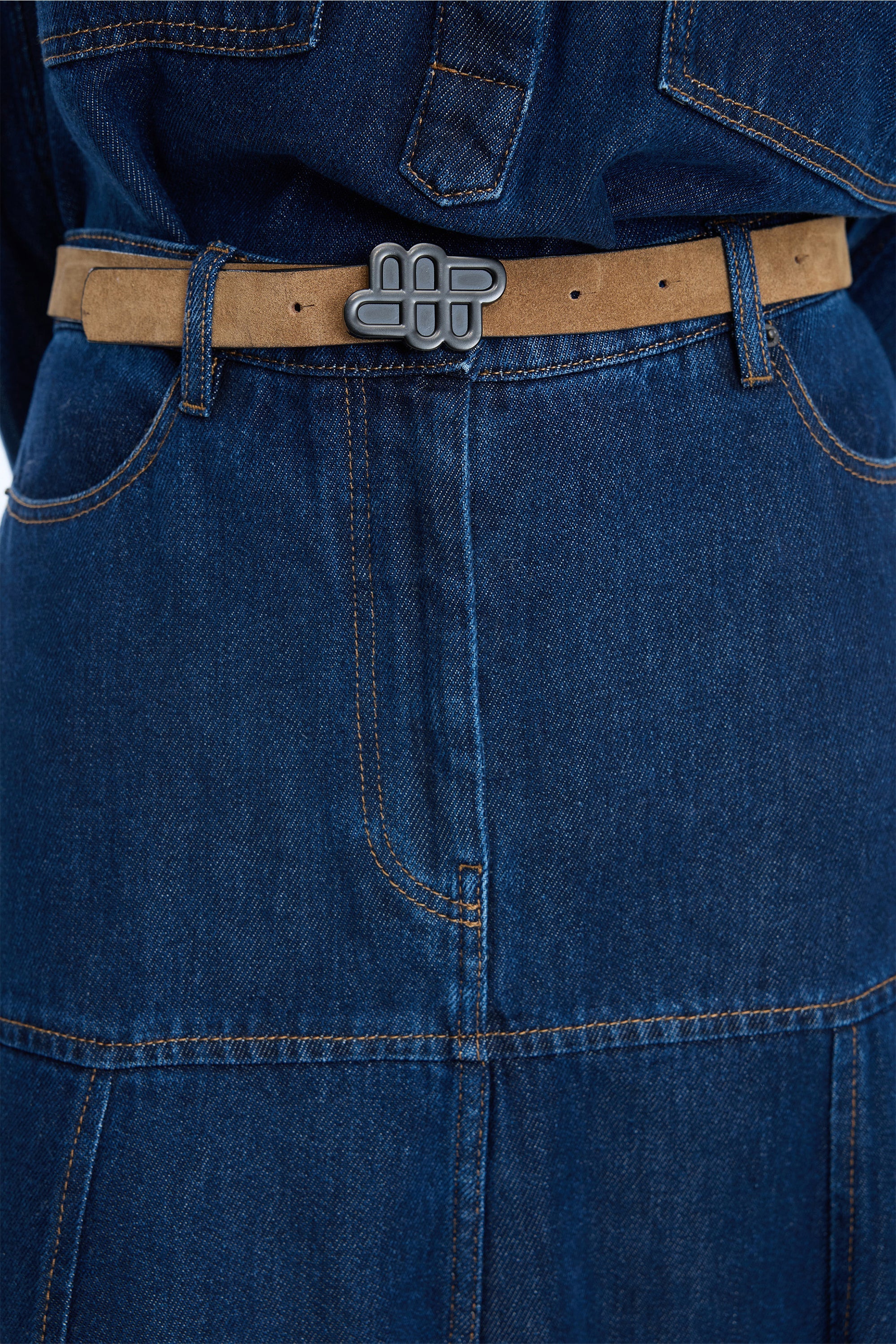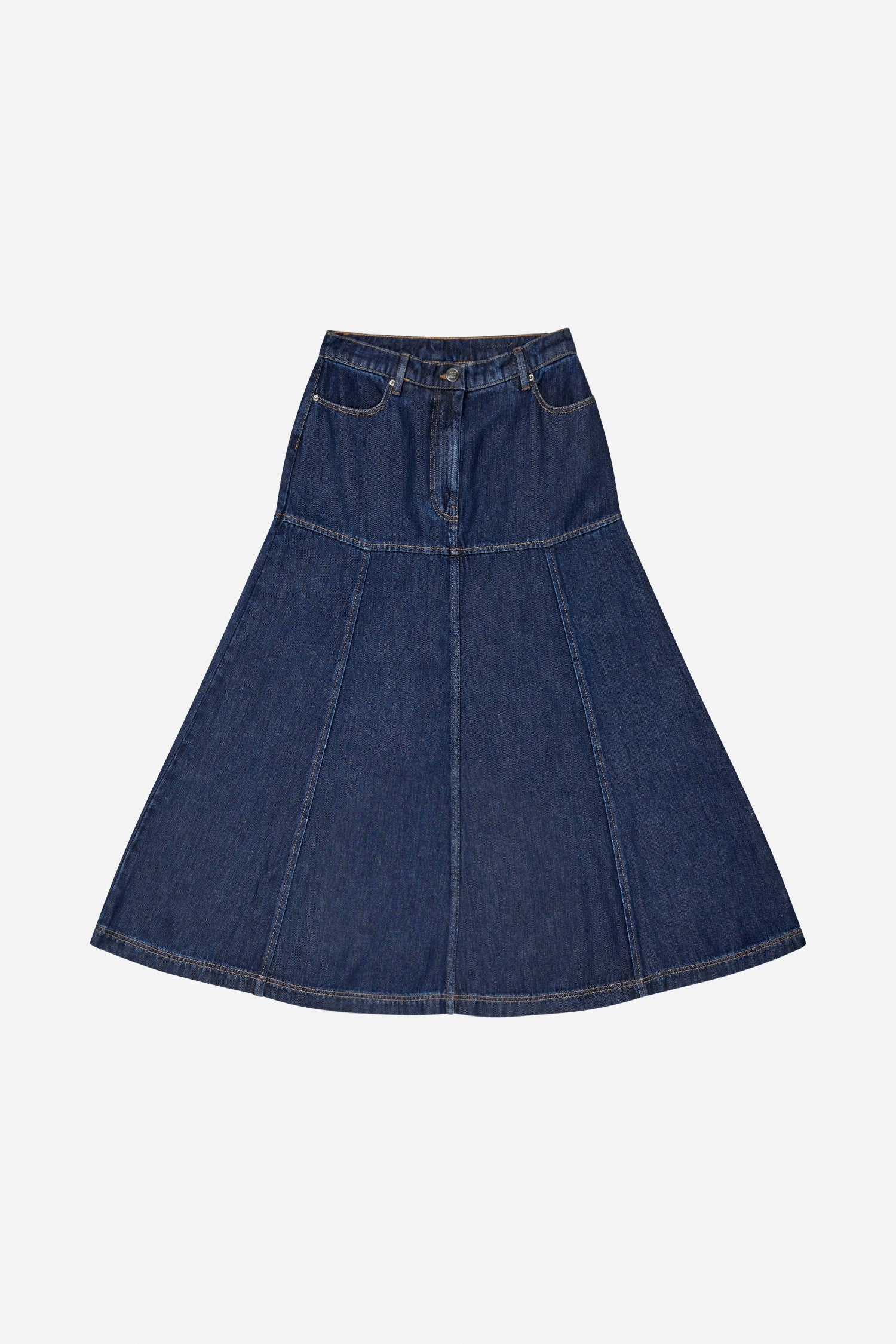 En smuk denim nederdel med en tætsiddende pasform omkring hofterne, og en kontrast flair effekt fra hofterne og ned. Nederdelen er designet med bæltestropper, lommer og har en normal pasform.
