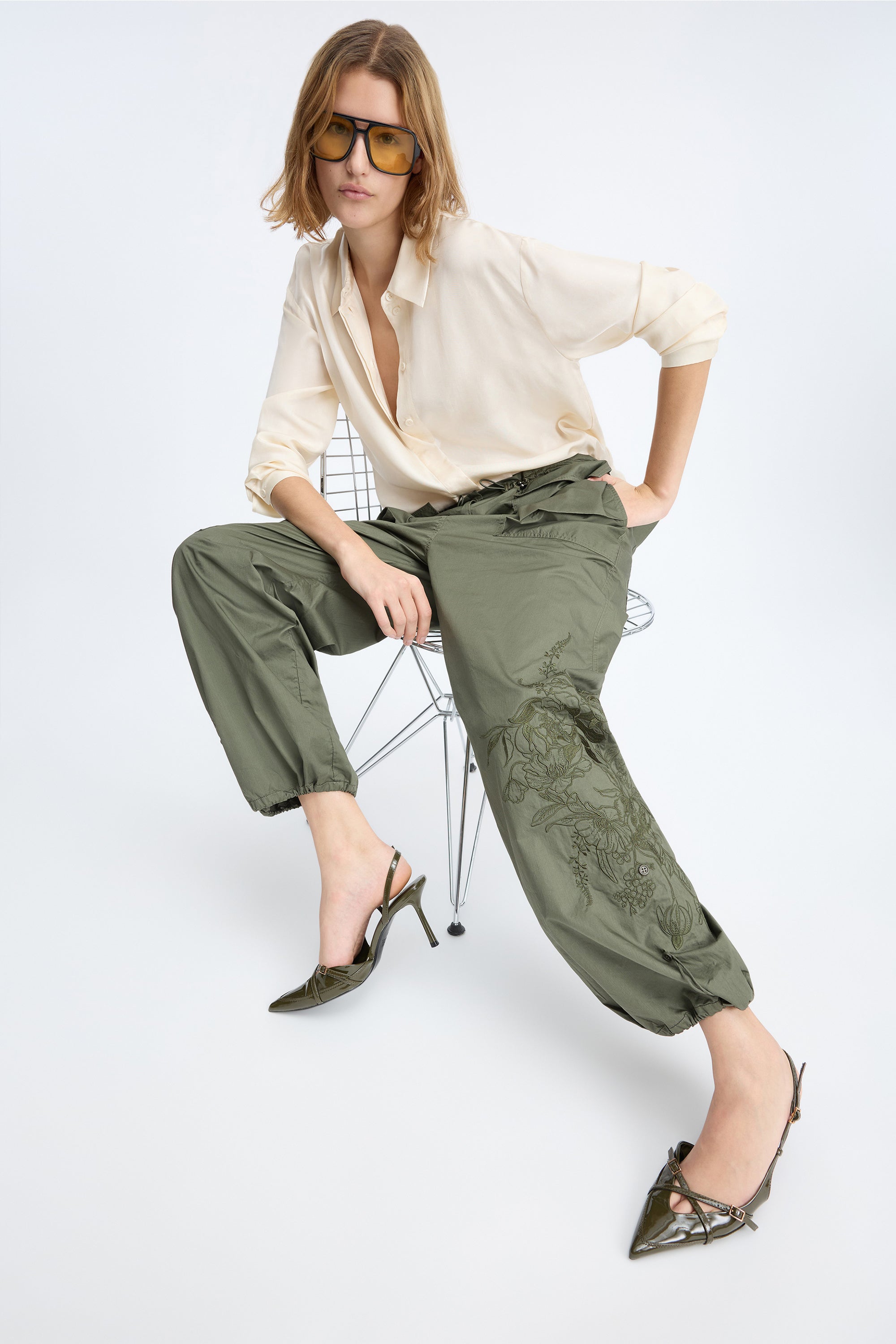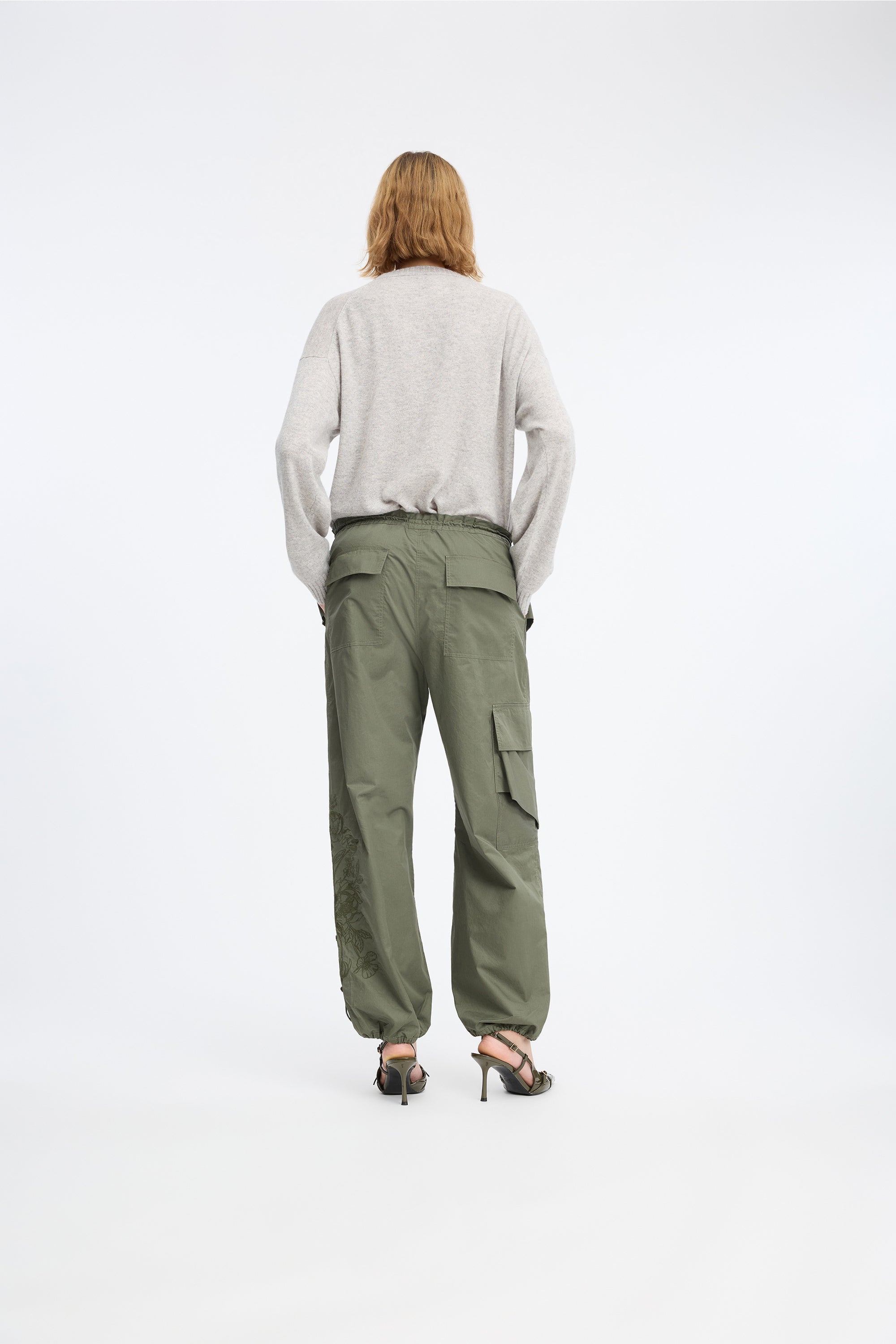Cargo bukser designet i en løs pasform, med et smukt tone i tone broderi på benet. Disse bukser er designet med elegante klaplommer langs ben, hofter og bag på. Bukserne kan justeres i livet, samt nederst på hvert ben, med en elegant snore detalje.