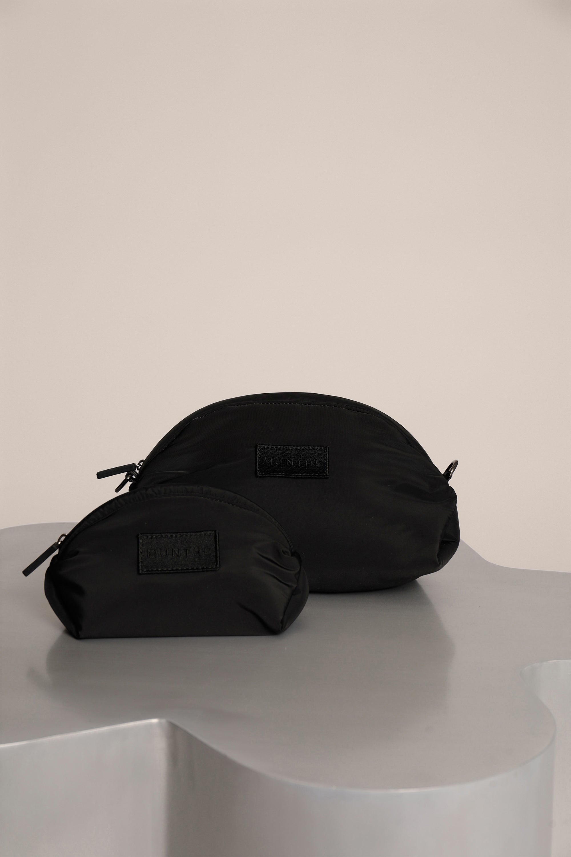 En lille taske med et elegant MUNTHE logo og lynlås. Tasken har en størrelse som kan indeholde nøgler, makeup eller andre små ting. Tasken er den lille taske af de to tasker på billedet.