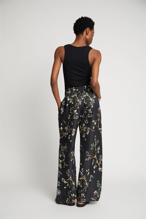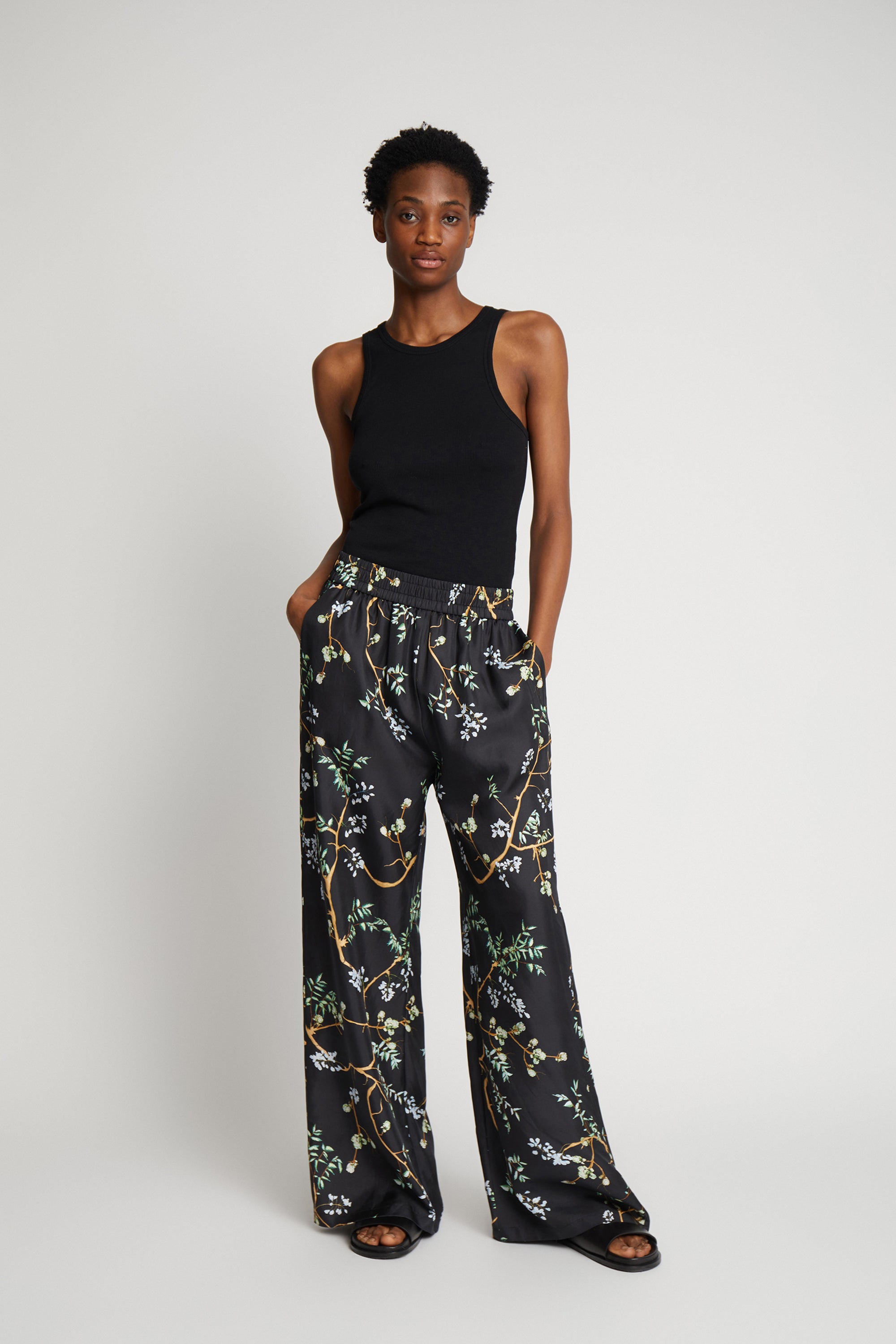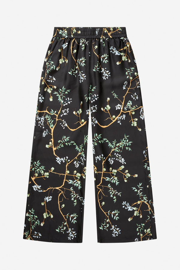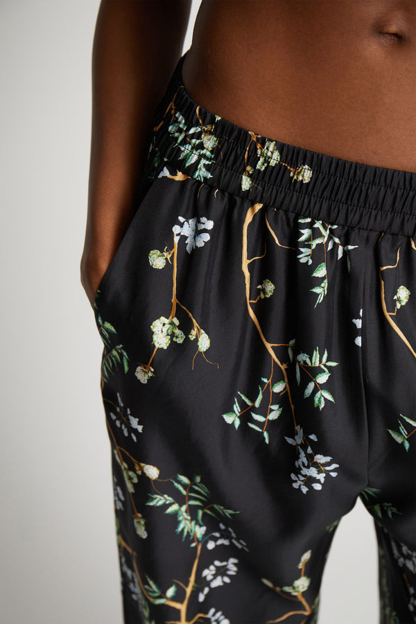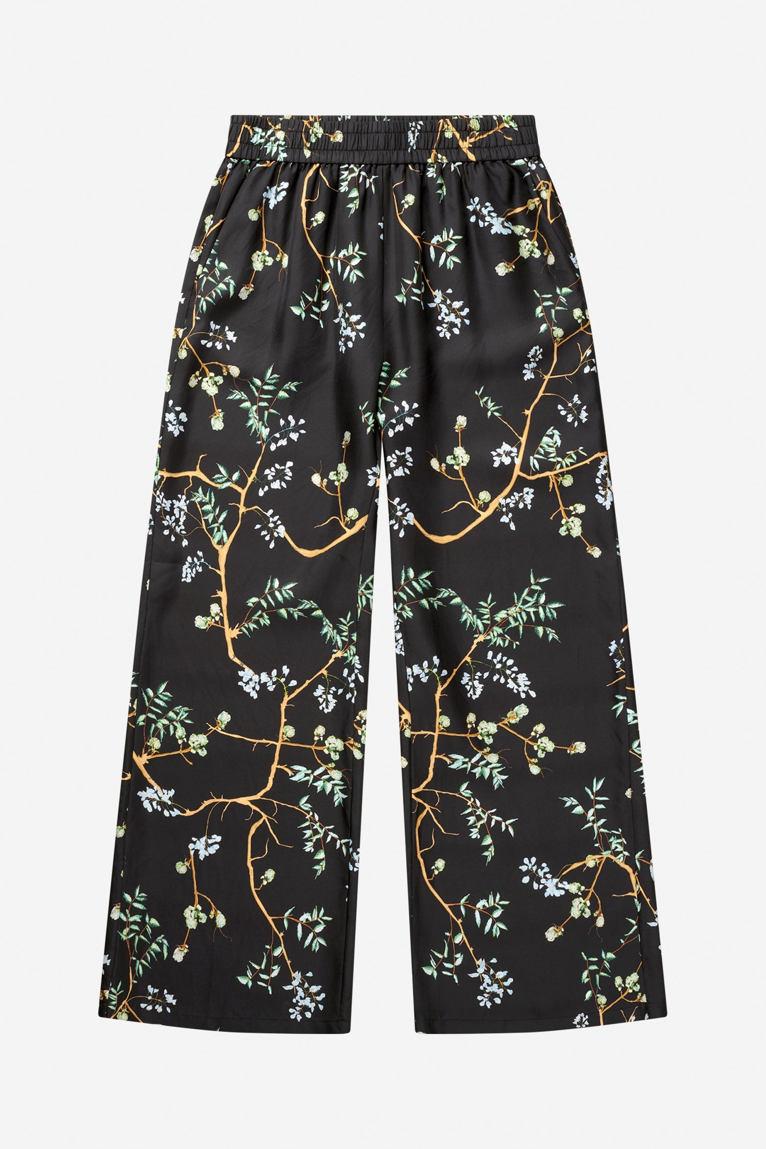 Lange oversize bukser i et smukt all-over print, lavet i 100% silke. Bukserne har lommer i hver side og elastik i taljen.