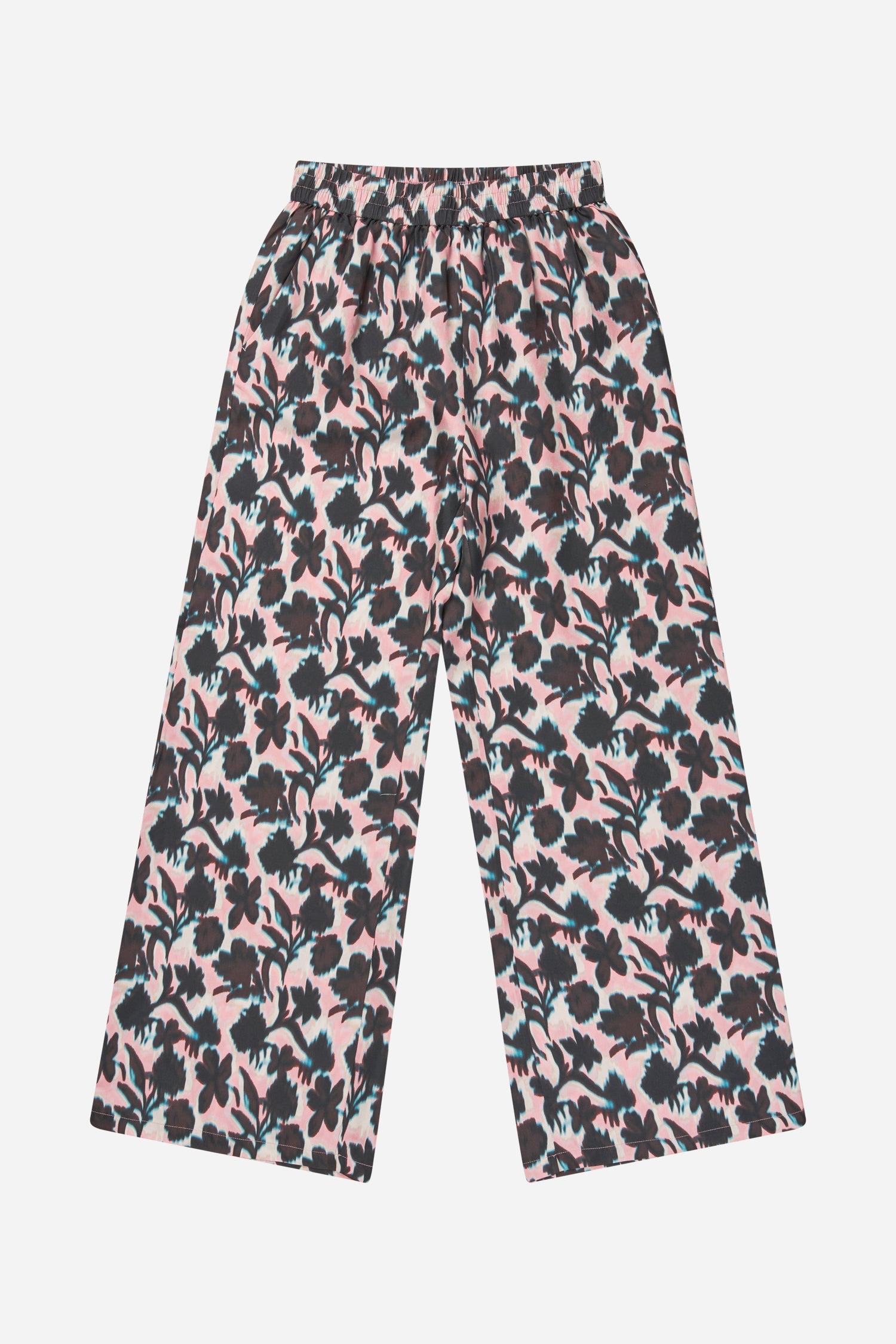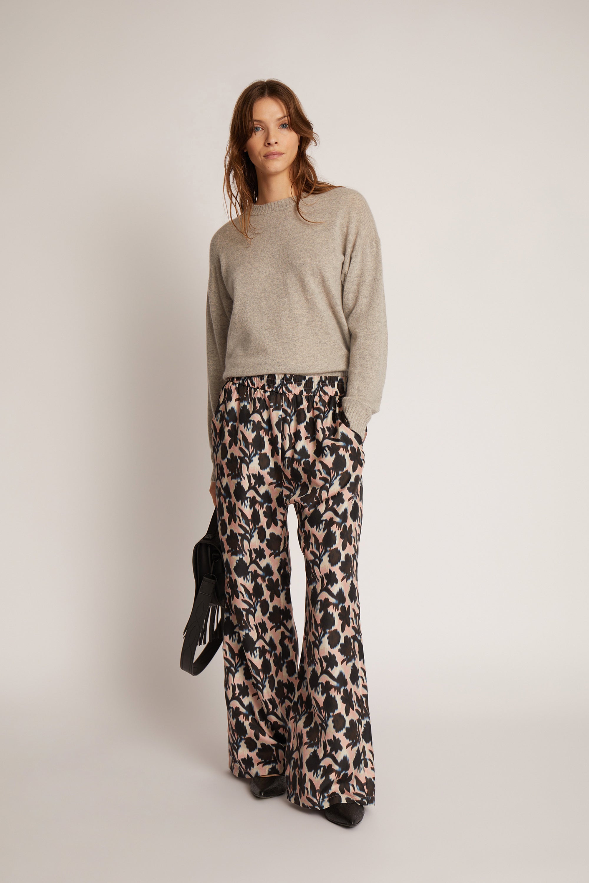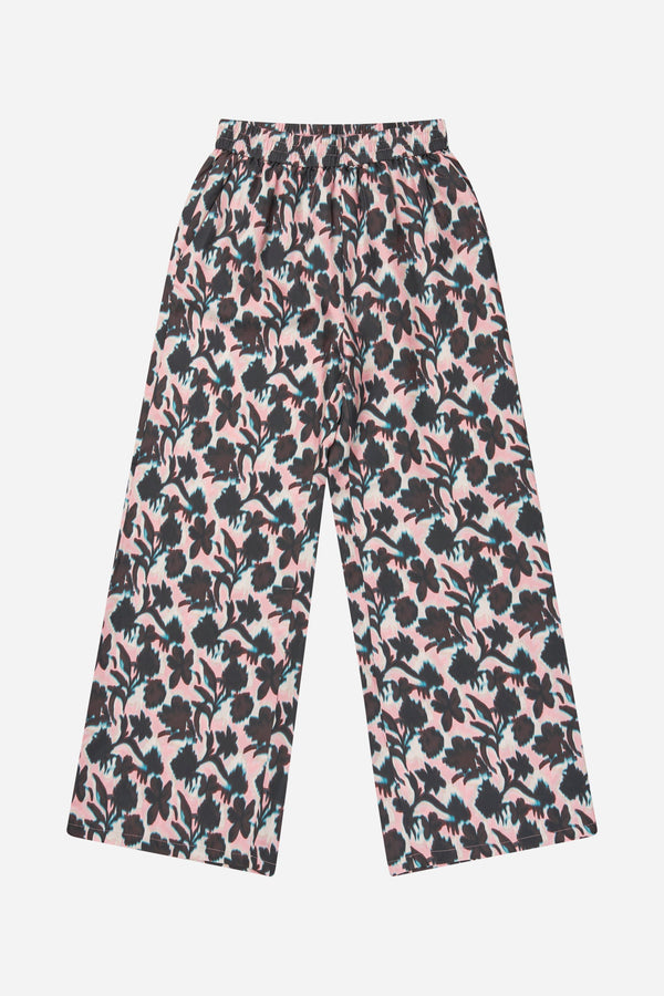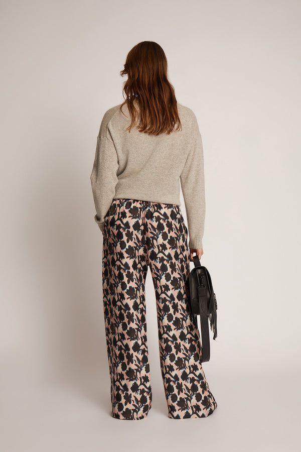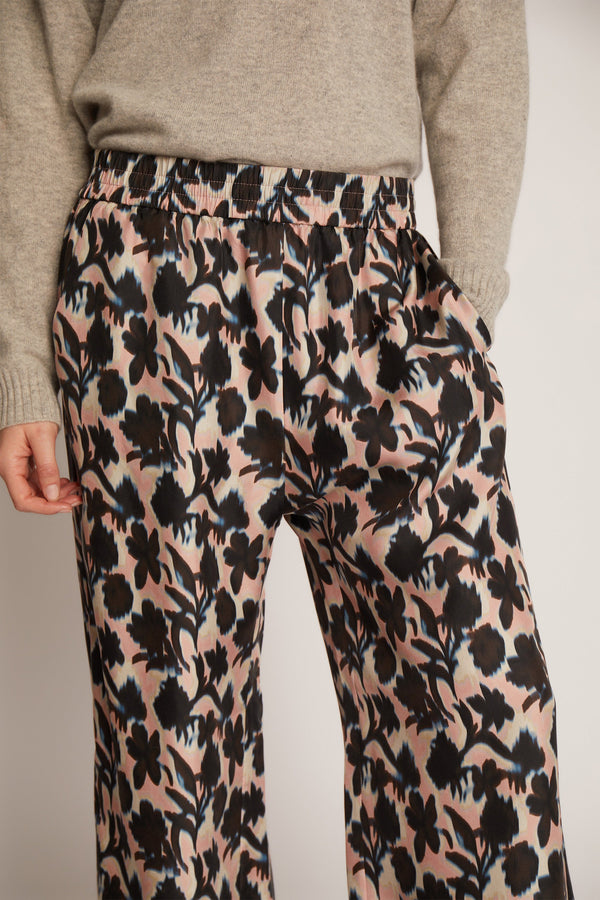 Elegante bukser med et smukt all-over print, lavet i 100% silke. Bukserne er lange, og er designet til en løs pasform, med lommer i hver side og elastik i taljen.