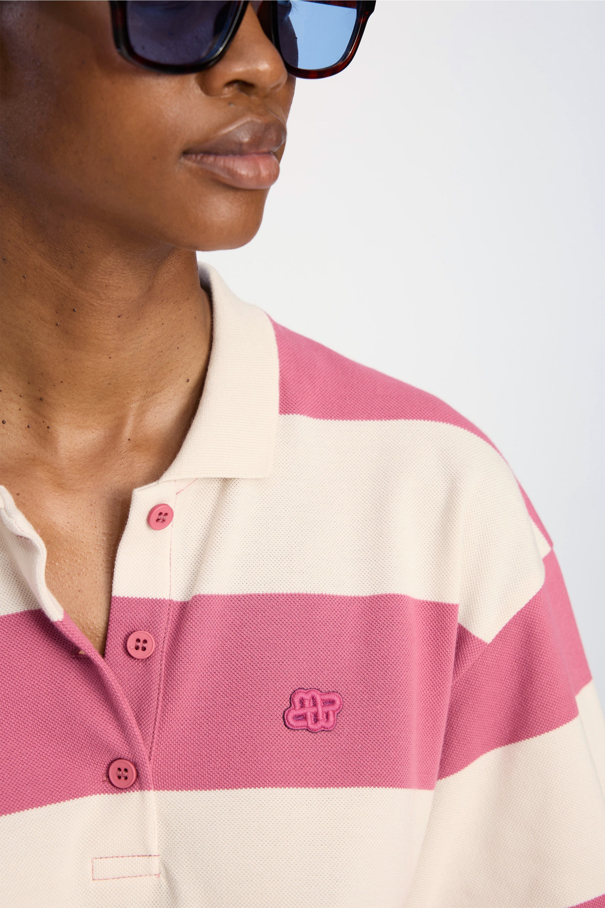 Polo t-shirt med striber, hvid krave og knappedetaljer. Den har korte ærmer, rund hals, et diskret MUNTHE emblem og en løs pasform.