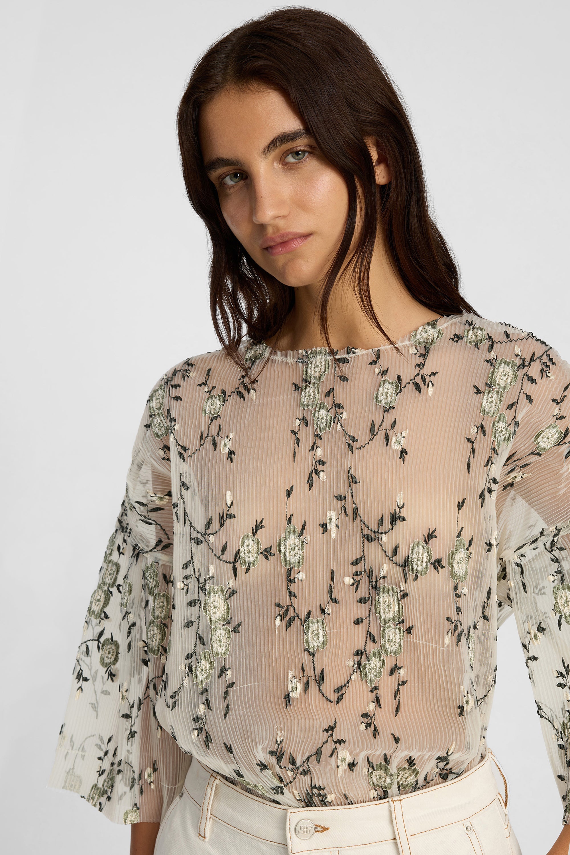 Top med broderede blomsterdetaljer, løs pasform, rund hals og korte ærmer.