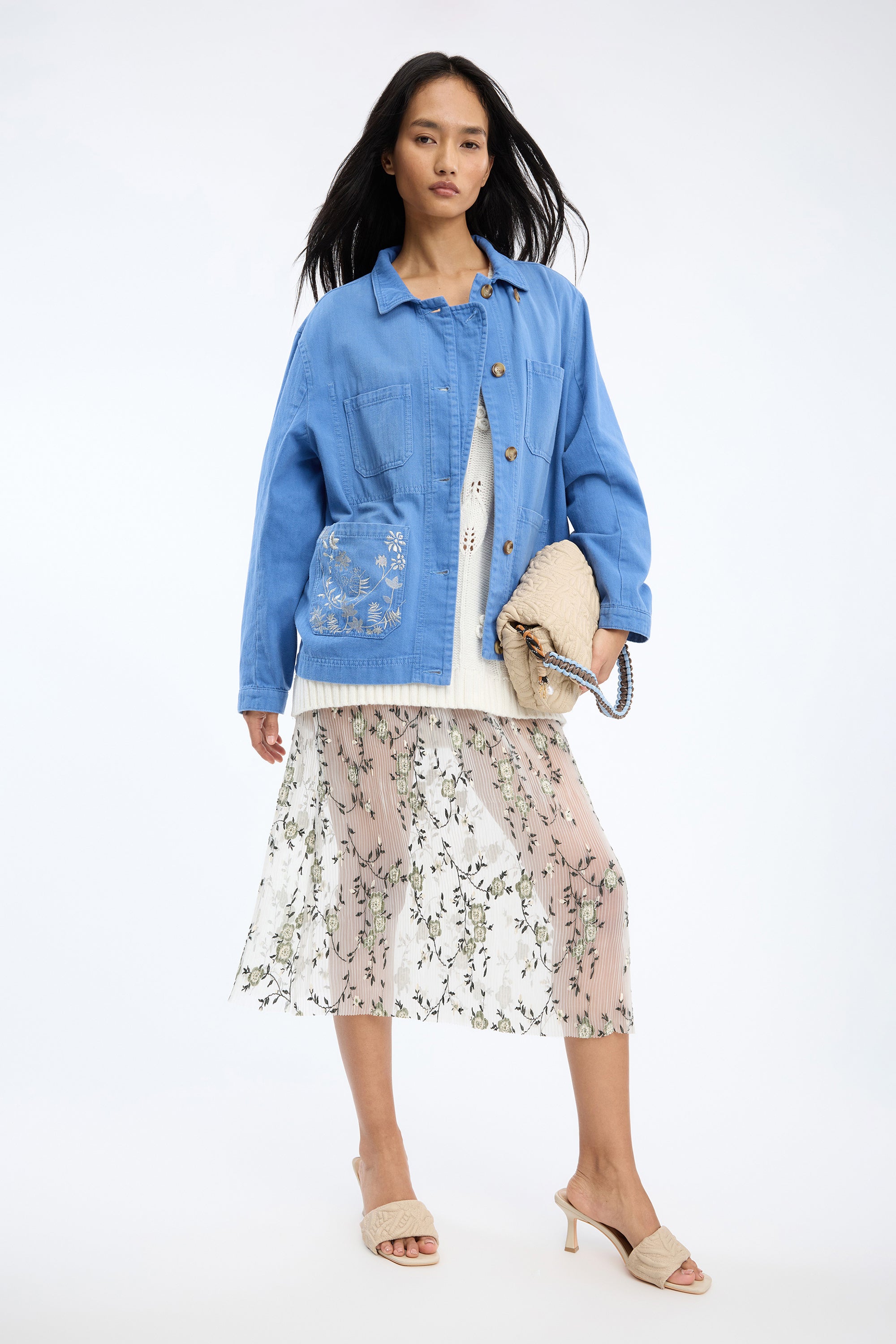 Denne jakke har fire frontlommer, en klassisk knaplukning, samt broderi i blomstermotiver på front og ryg.  Jakken er velegnet til lag på lag looks og har med sit detaljerede blomsterbroderi et kunstnerisk udtryk.