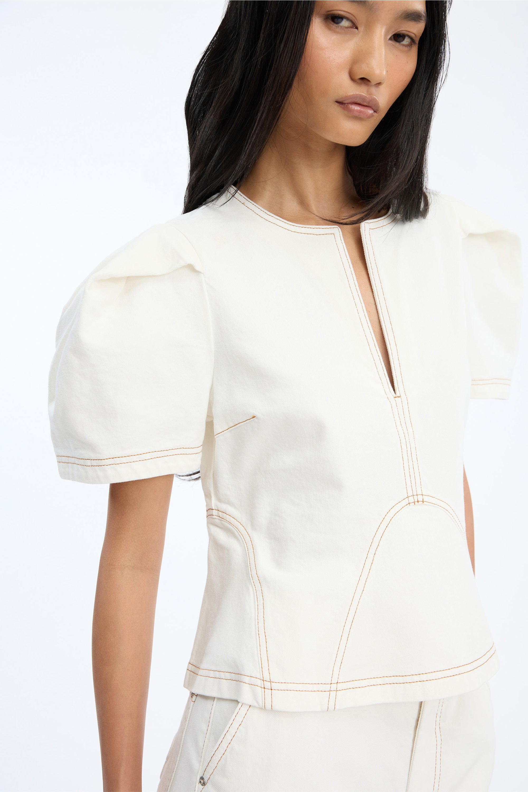 Top med kontrastsyninger, korte, let puffede ærmer, en rund halsudskæring med slids og en let A-formet silhuet.