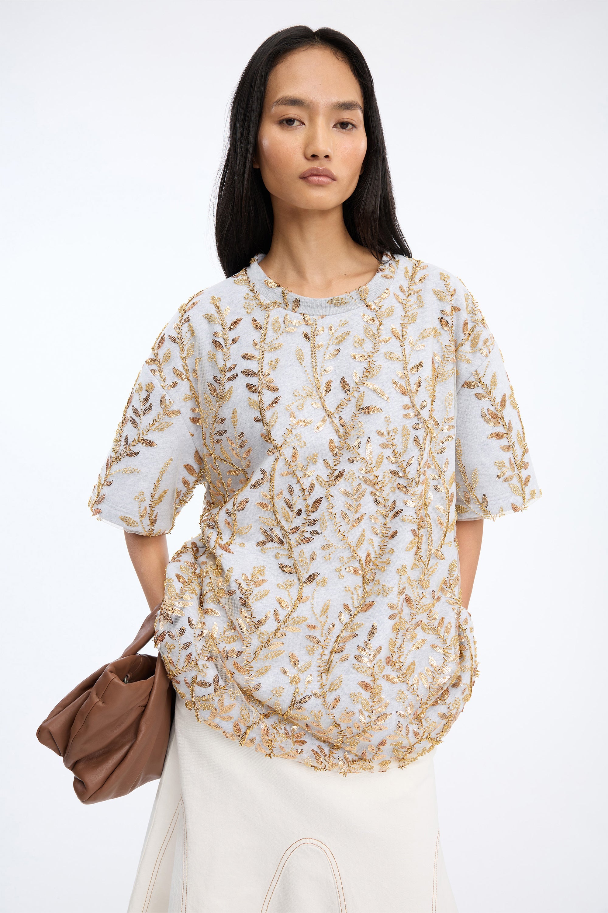 T-shirt med en oversize pasform dekoreret med et tæt mønster af guldtonede pailletter og perler i bladmønster. Den har korte ærmer, rund halsudskæring og et let, fleksibelt materiale.