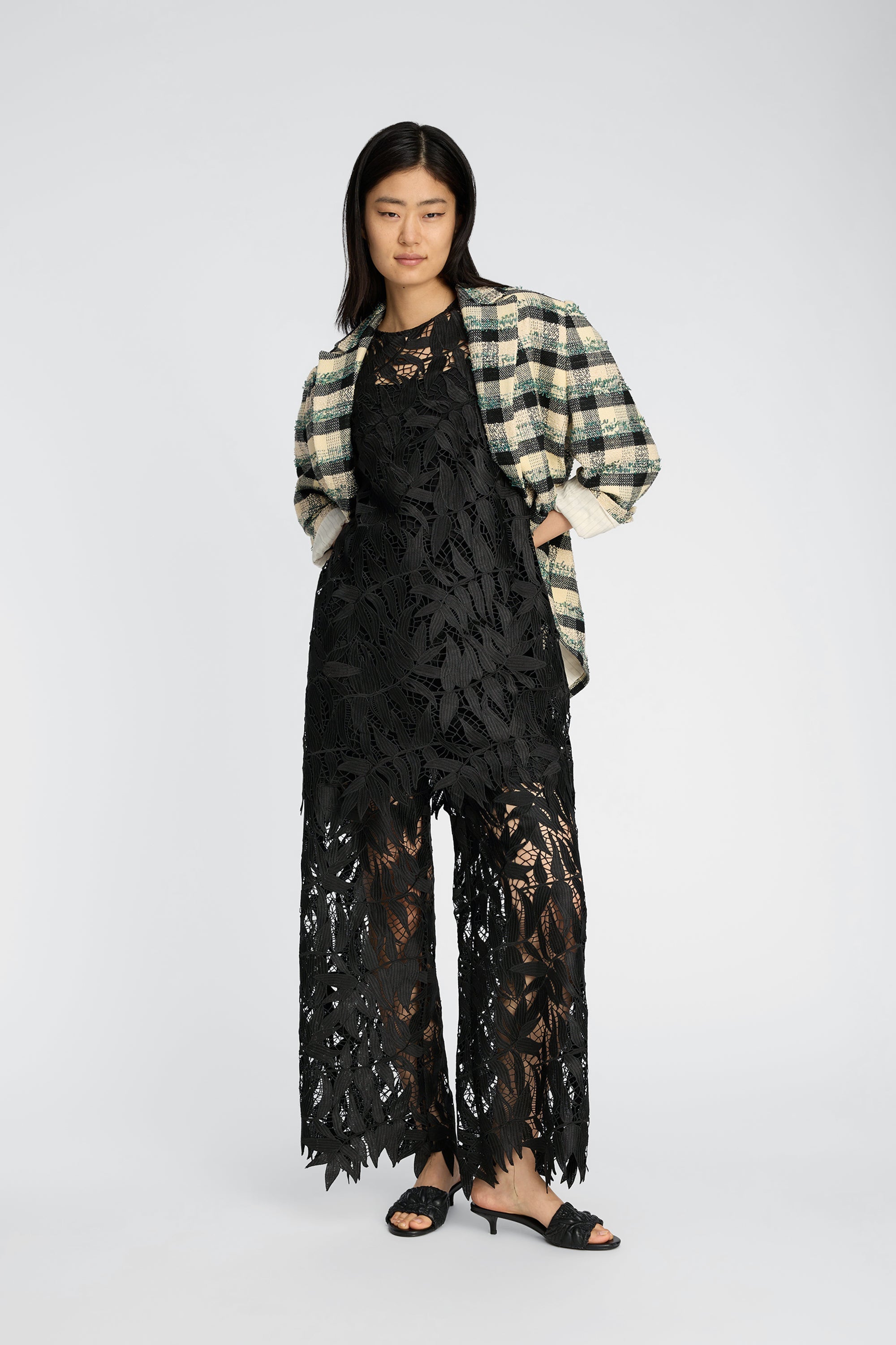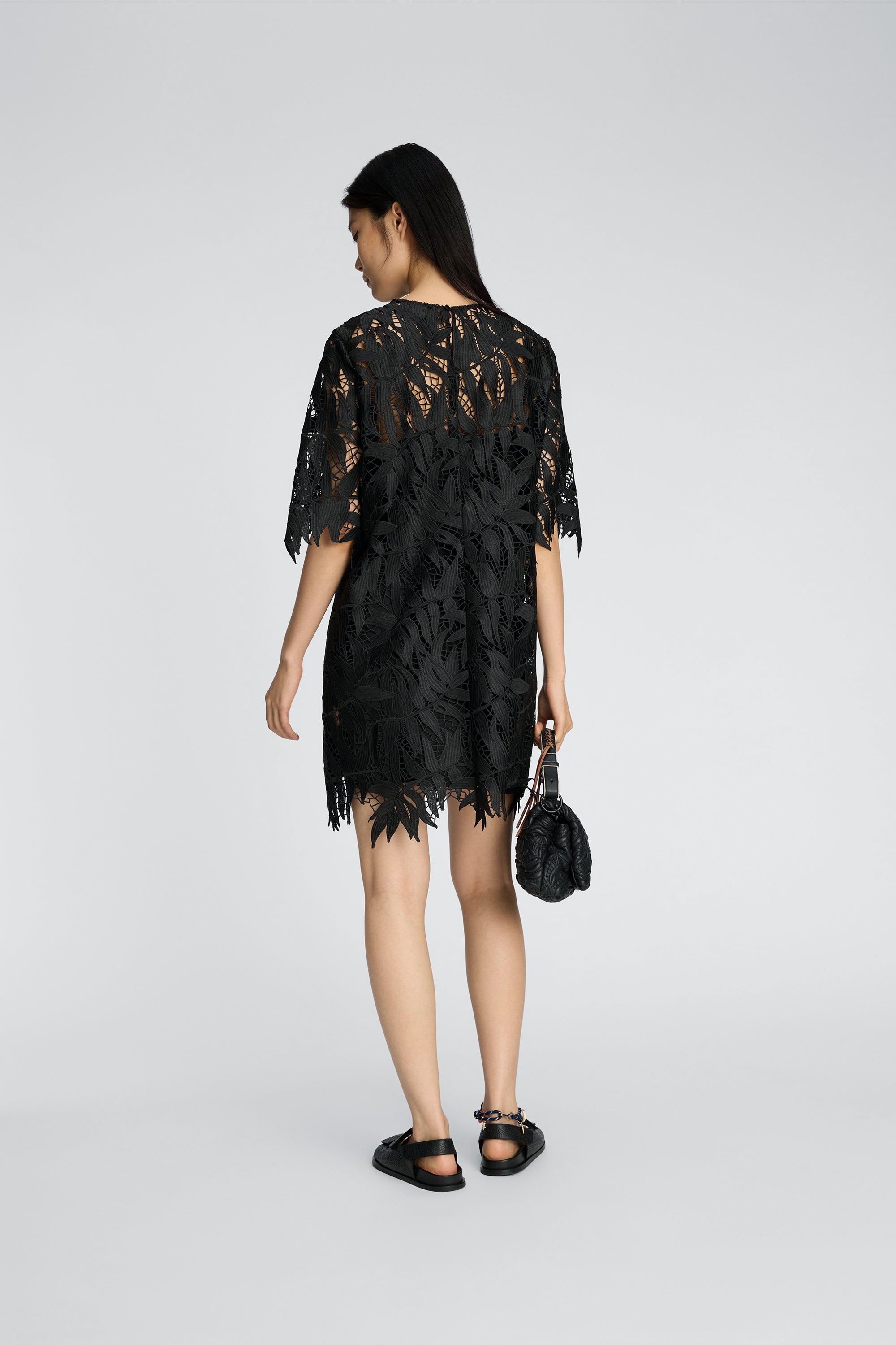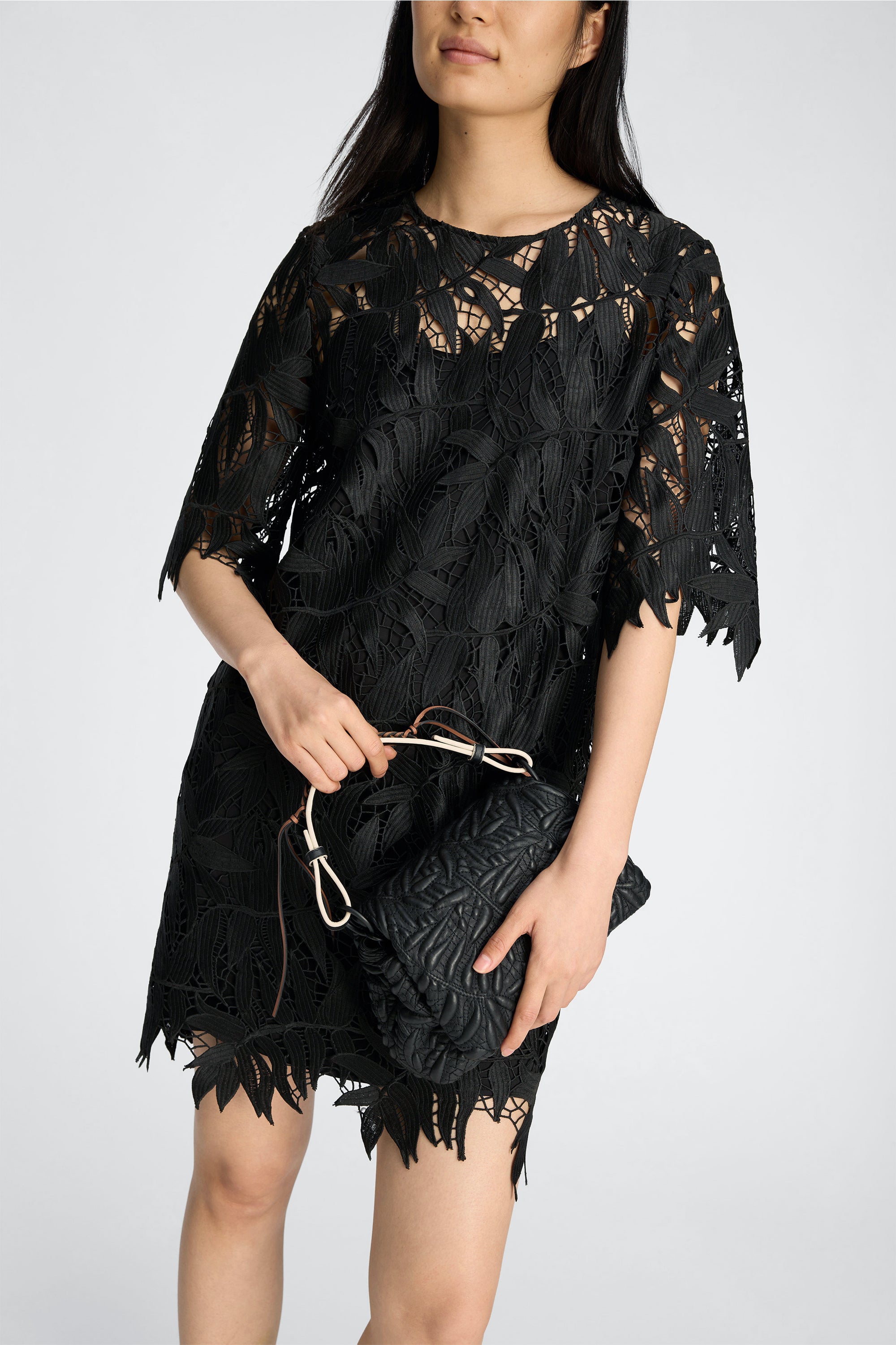 Kjole i blondemateriale med et bladformet mønster og korte ærmer. Modellen har rund hals og en lige, kort silhuet, samt rå kanter, der understreger materialets mønster.