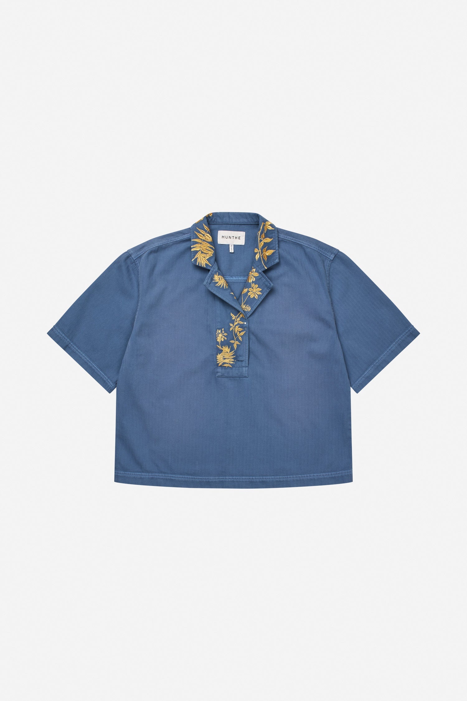 Top med broderede detaljer langs kraven, korte ærmer, en åben kraveudskæring og et let, boxy snit i en blød denimkvalitet.