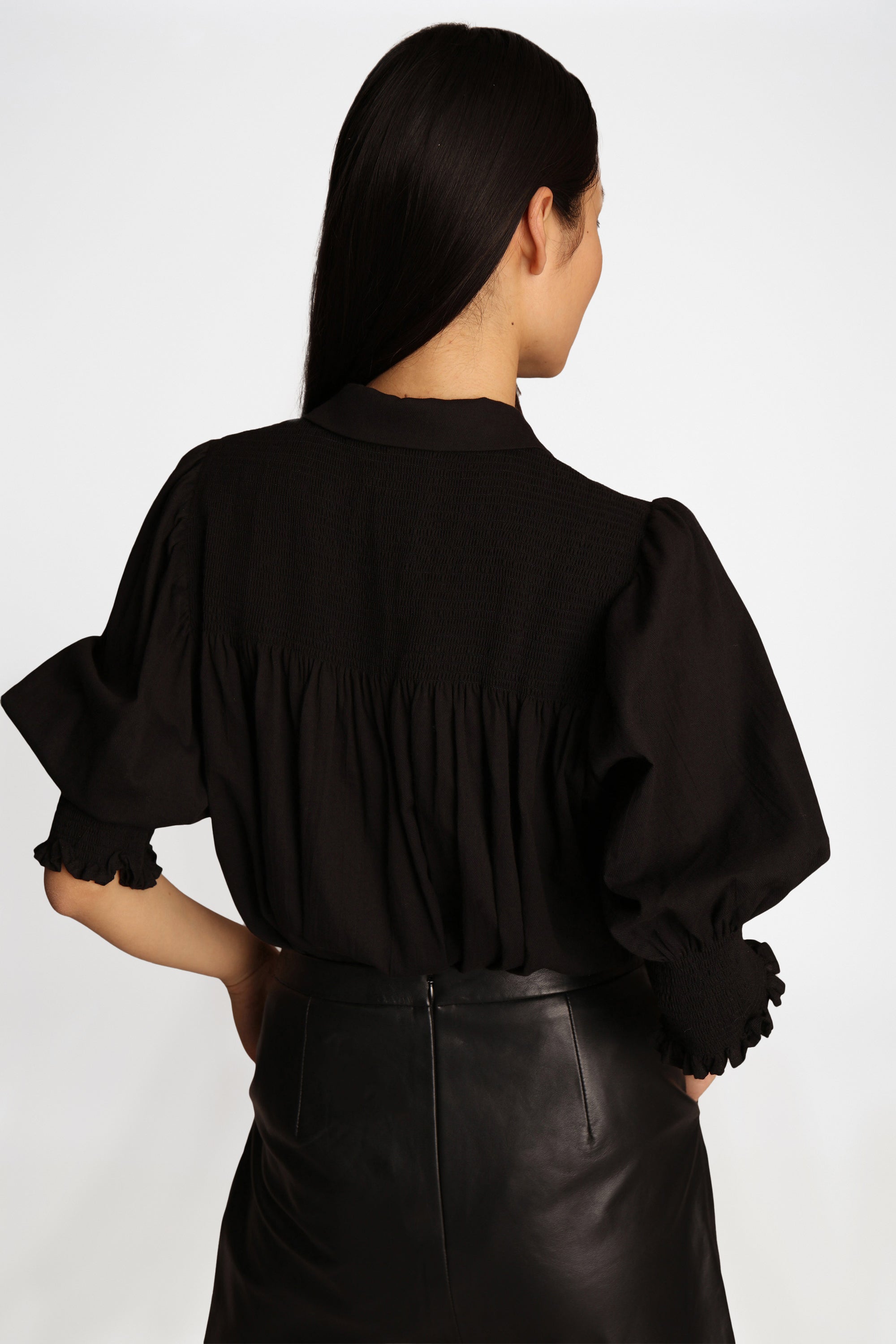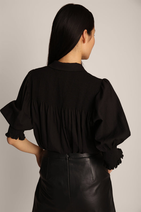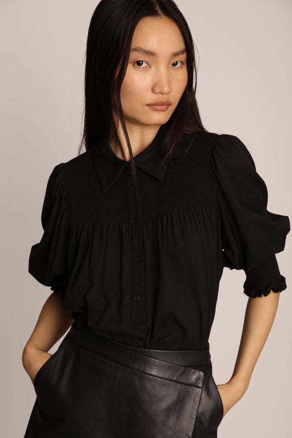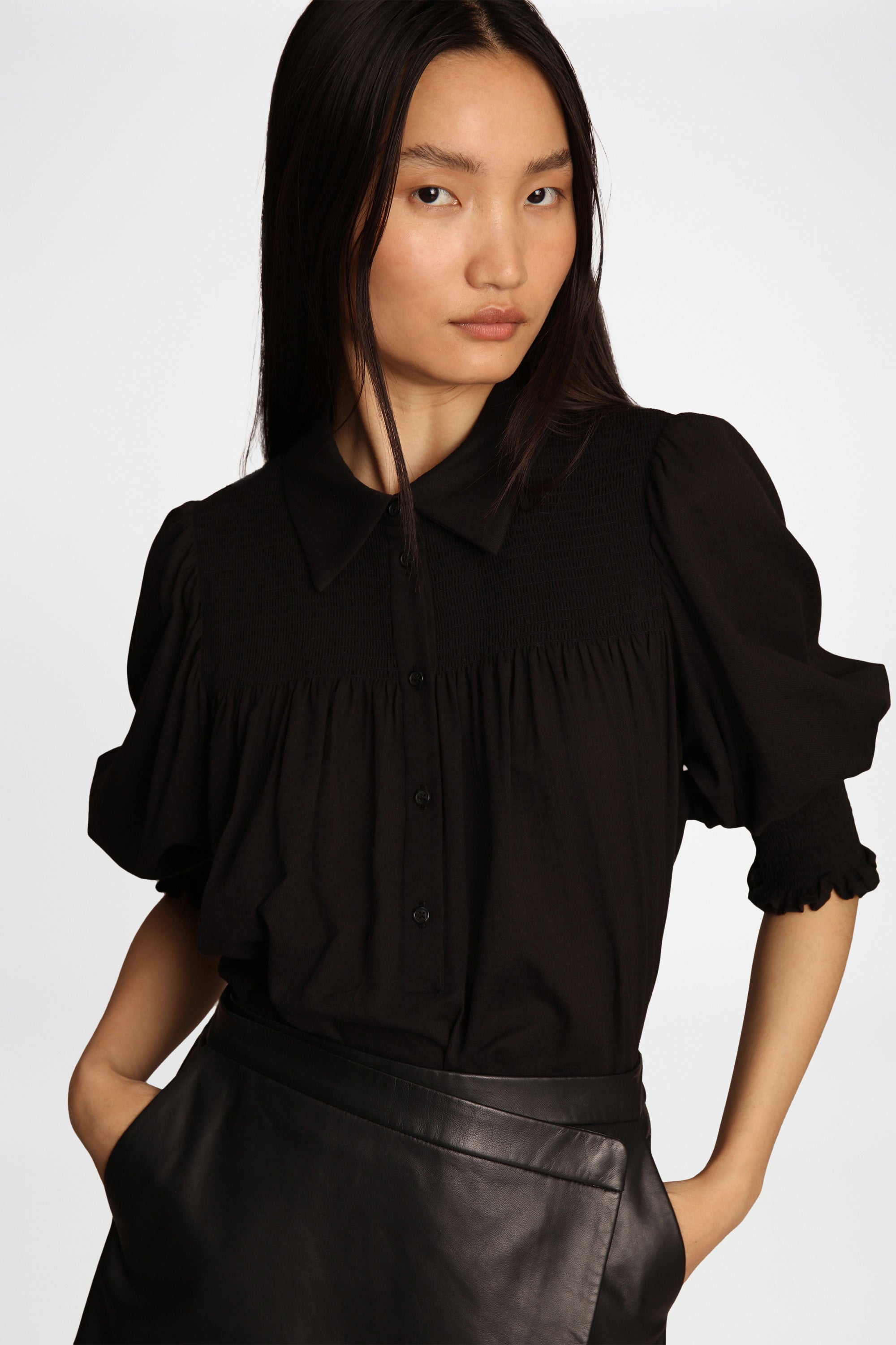 Feminin bluse med smukke smock detaljer på ærmer, bryst og ryg. Skjorten har en lille krave og en elegant dyb åbning foran, med en knap lukning.