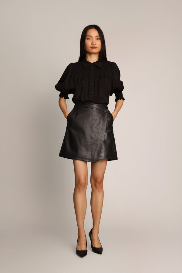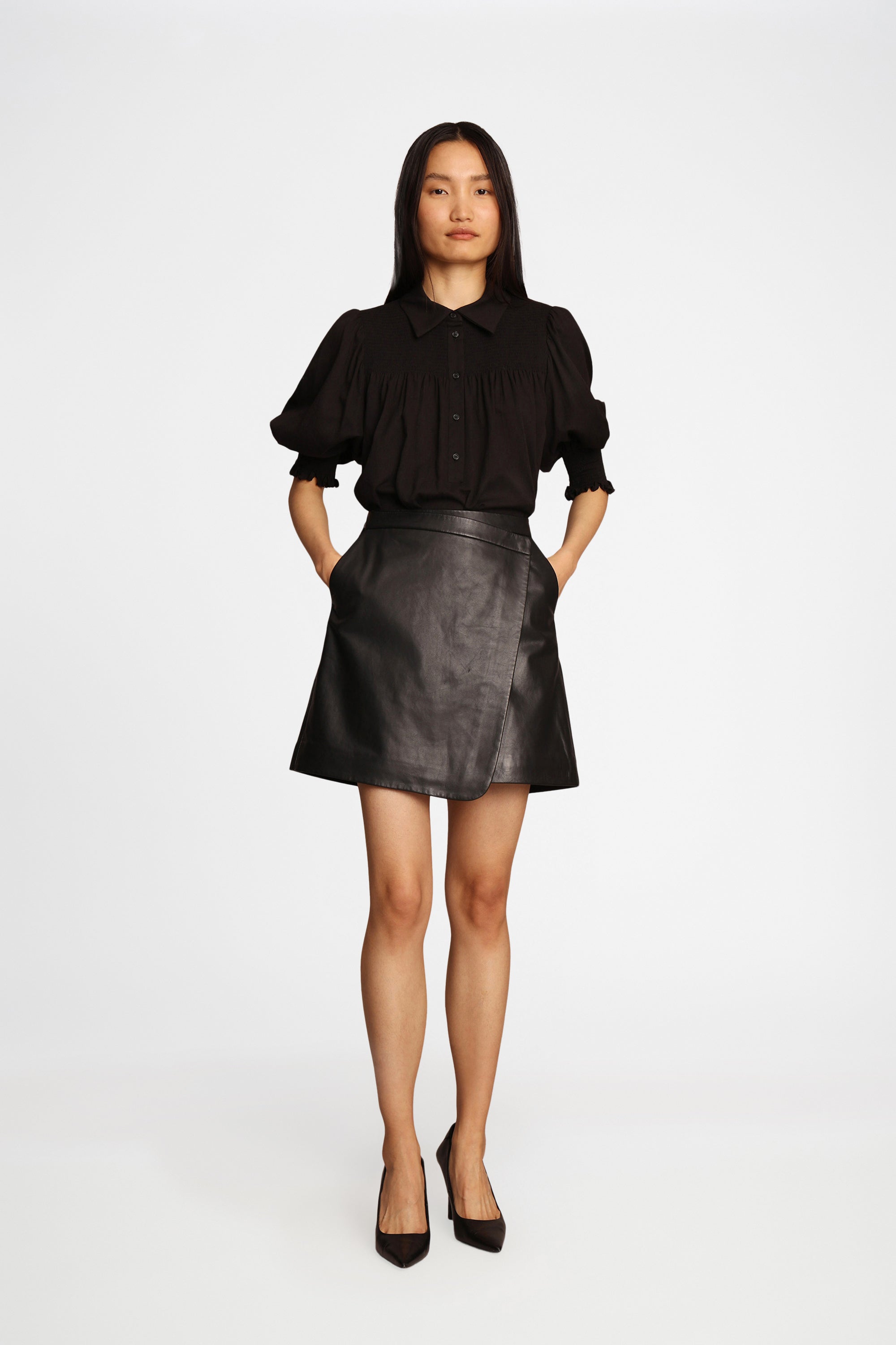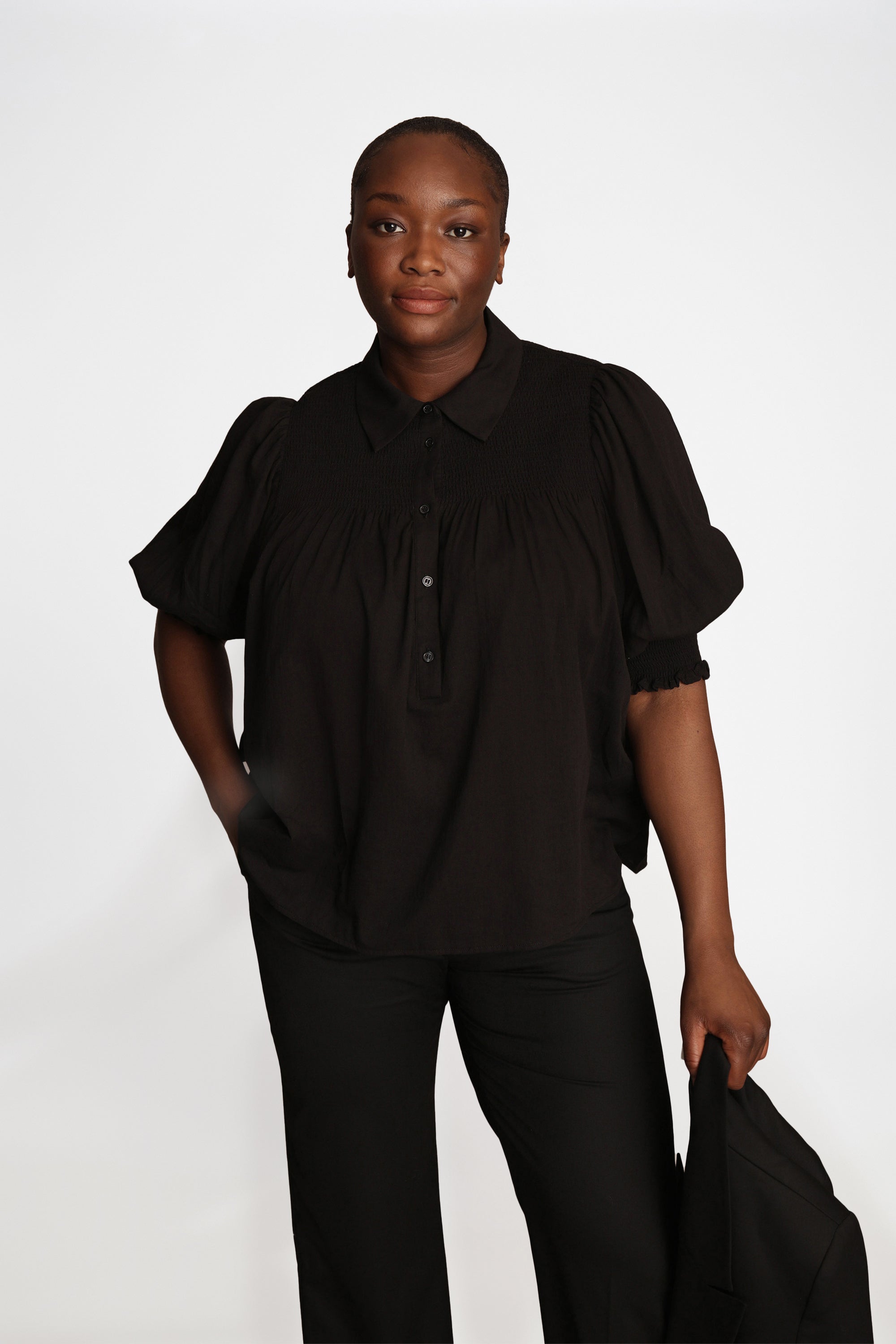 Feminin bluse med smukke smock detaljer på ærmer, bryst og ryg. Skjorten har en lille krave og en elegant dyb åbning foran, med en knap lukning.