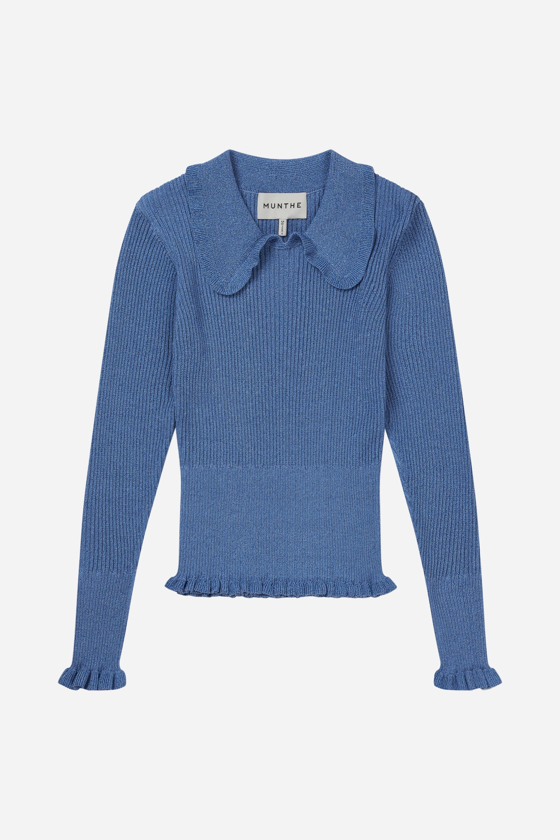 Polo strik med en elegant tynd peplum rib på ærmer og hals. Designet i en rib kvalitet med en høj, smallere rib nederst på strikken. Strikken er lavet af en bomulds blanding og er designet i en tætsiddende pasform. Fås i farverne blå eller sort.