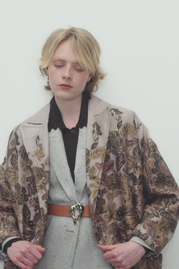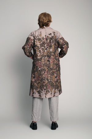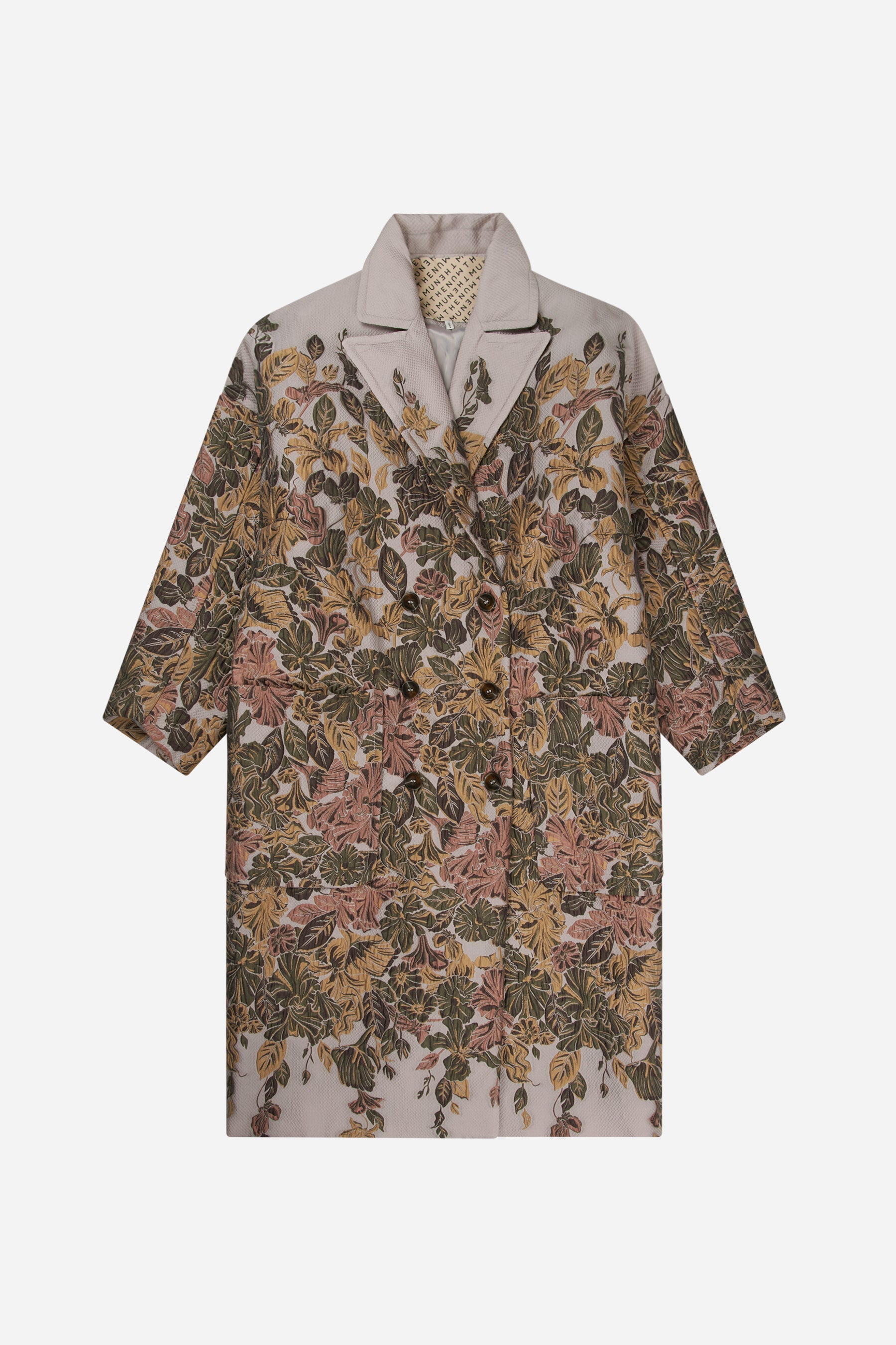 Frakke med elegant blomster print, der udtones ved skuldrene og ved bunden af frakken. Jakken er designet i en løs pasform med lommer og en dobbeltradet knaplukning. Fås i farven sand.