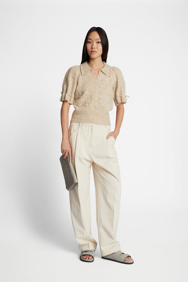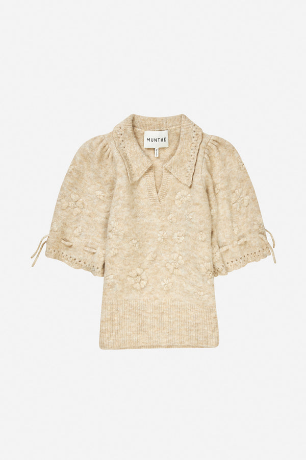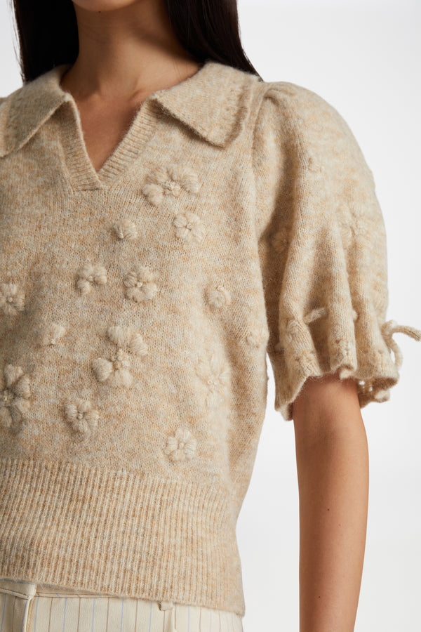 Blød polo-strik med et elegant blomster broderi, og smukke snore detaljer på ærmerne. Denne strik er lavet af en blød uldblanding og designet til en normal pasform.