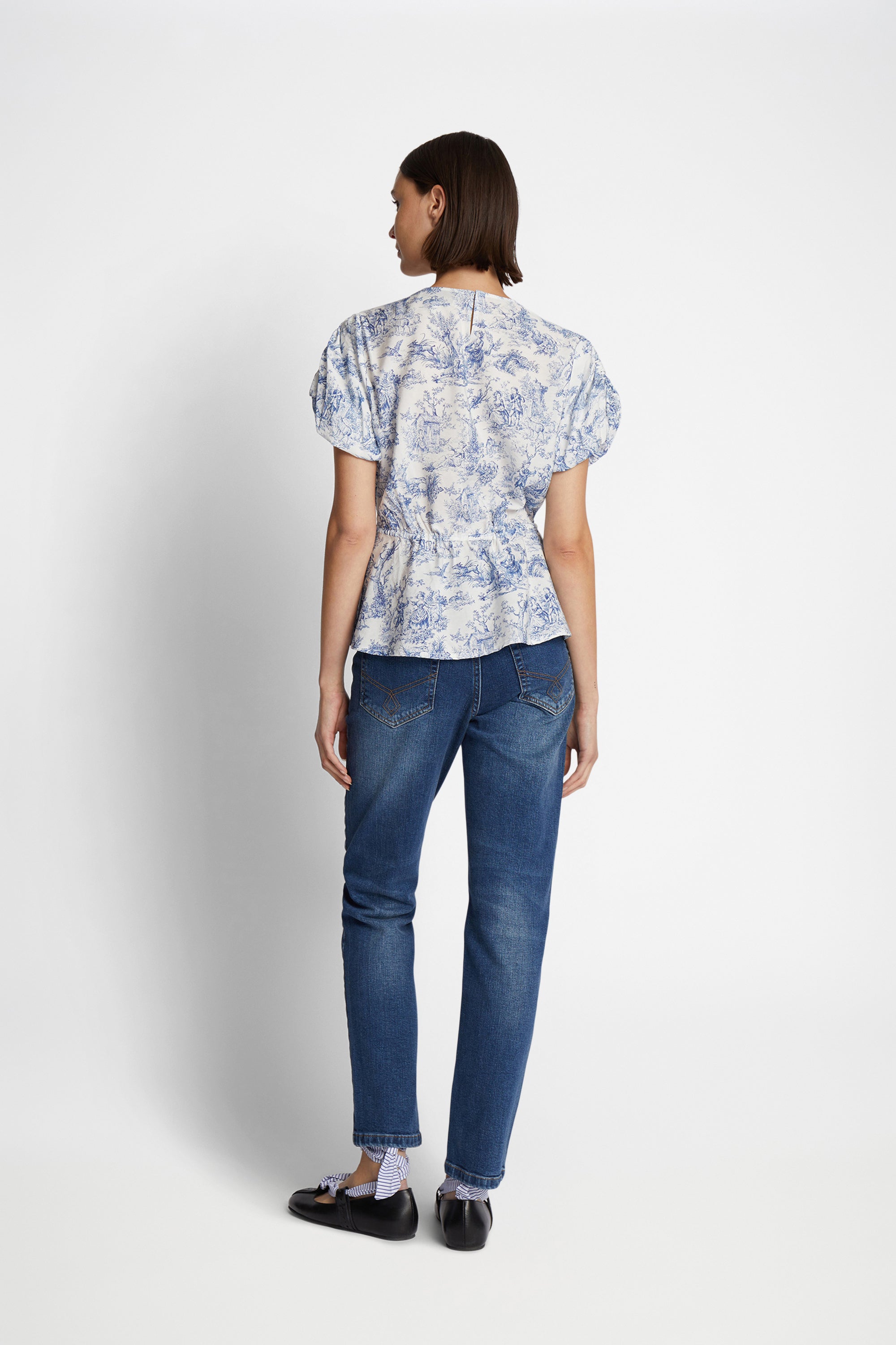 Bluse designet med et elegant print, med elementer af nostalgisk charme. Denne bluse har smukke rynke detaljer på skulder og i taljen. Blusen er designet med korte ballon ærmer og en lille elegant knap lukning i nakken.