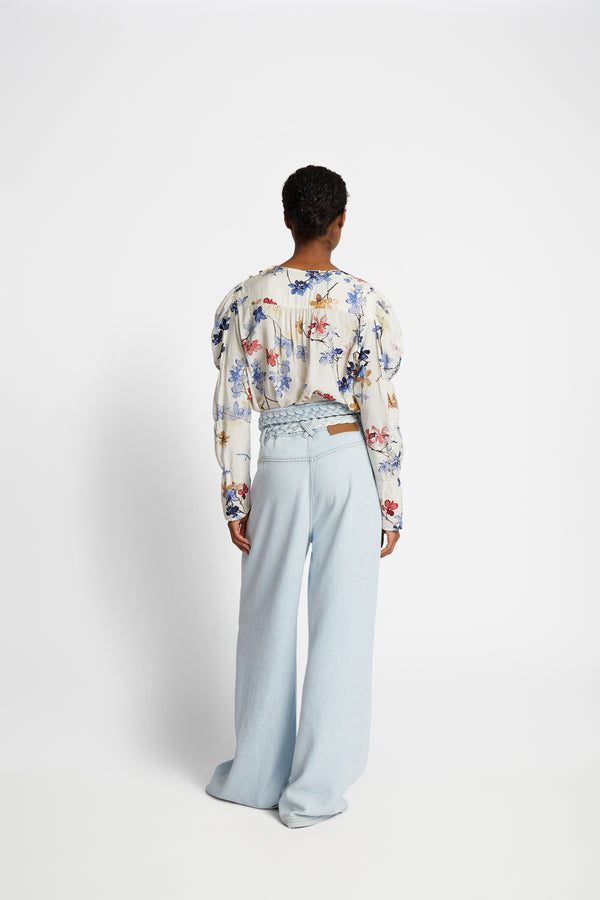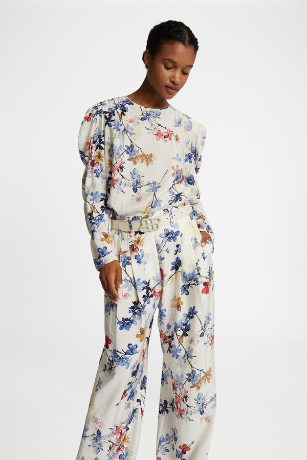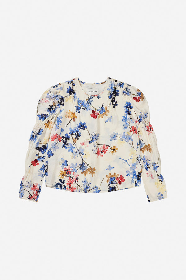 Bluse med et elegant blomster print, og smukke rynke detaljer på skulder, ærmer og bryst. Blusen er designet med lange ærmer og har en almindelig pasform.