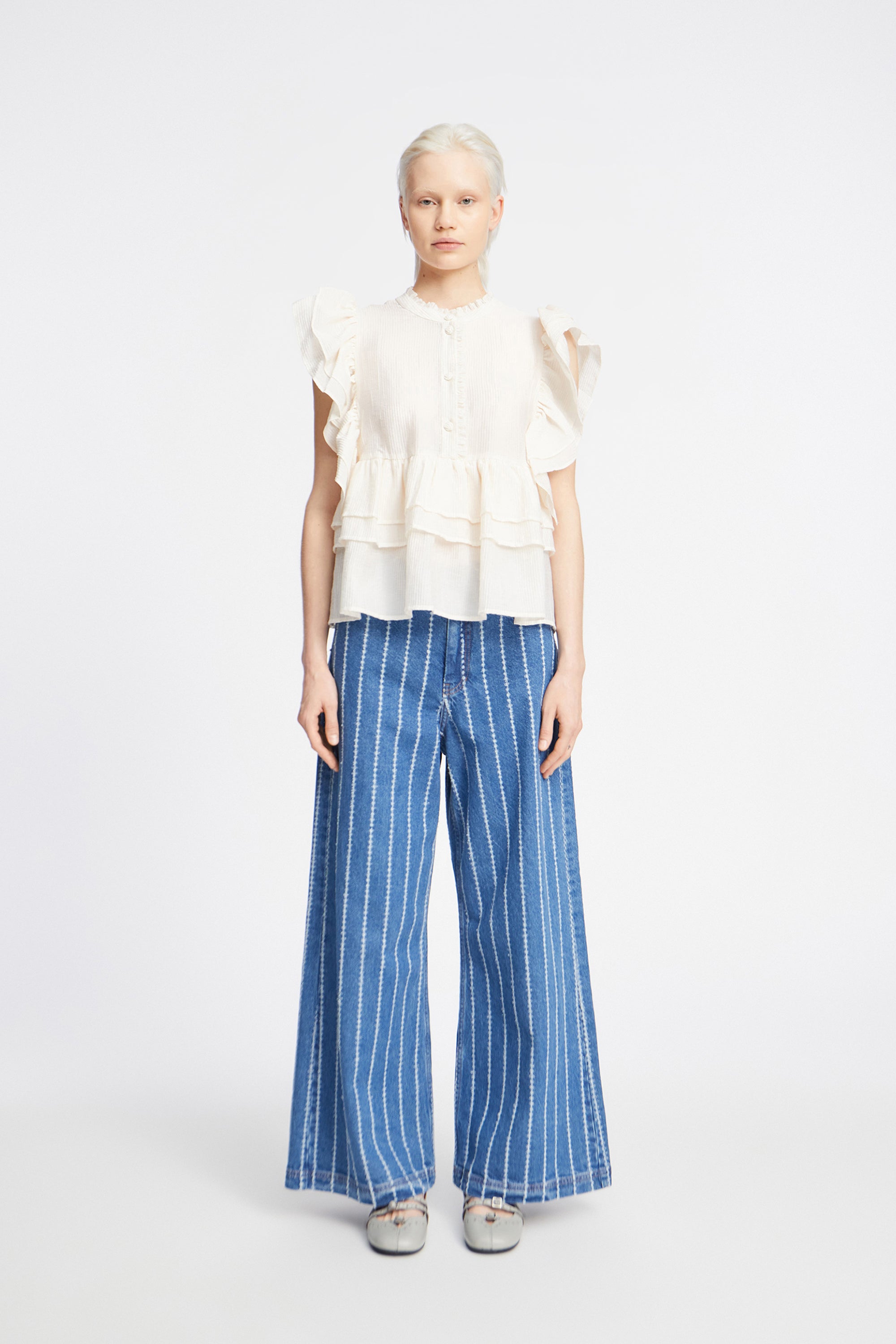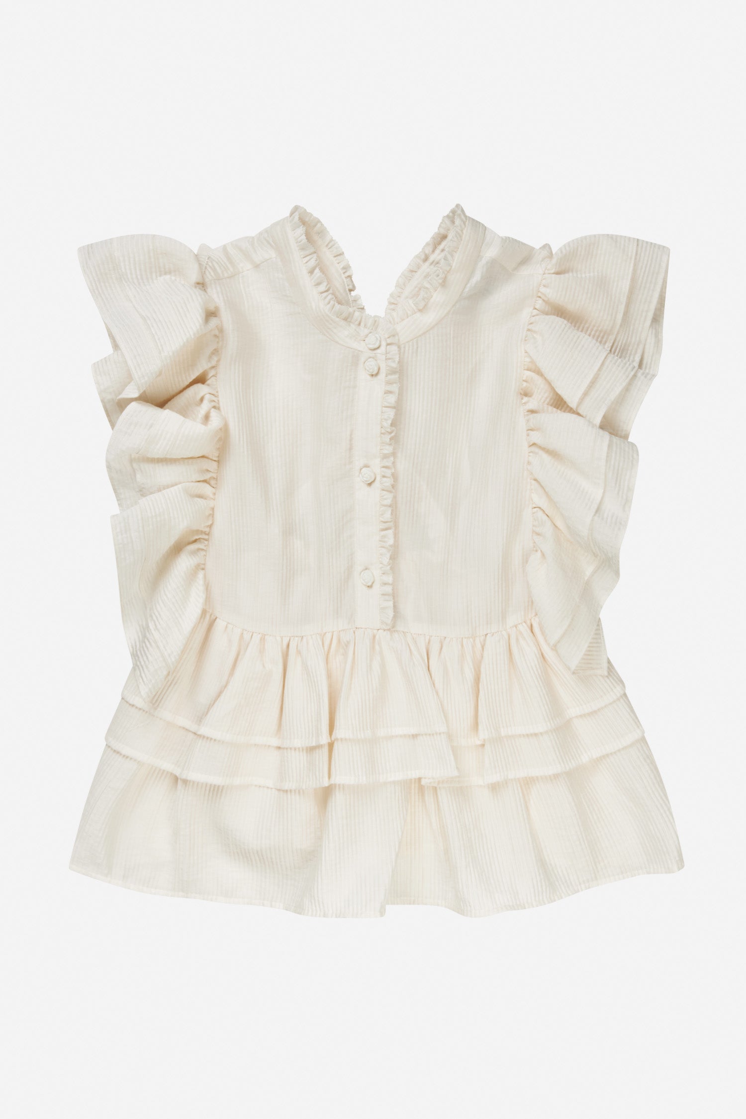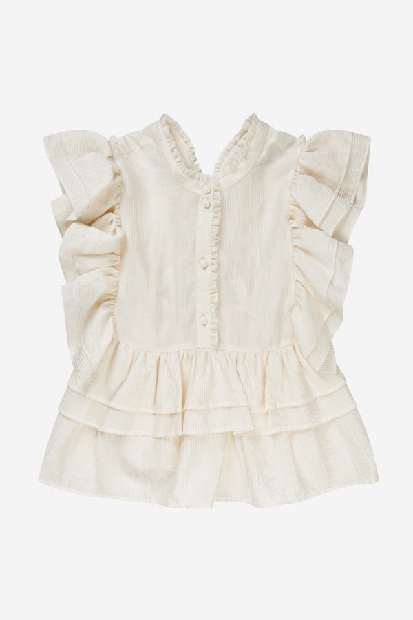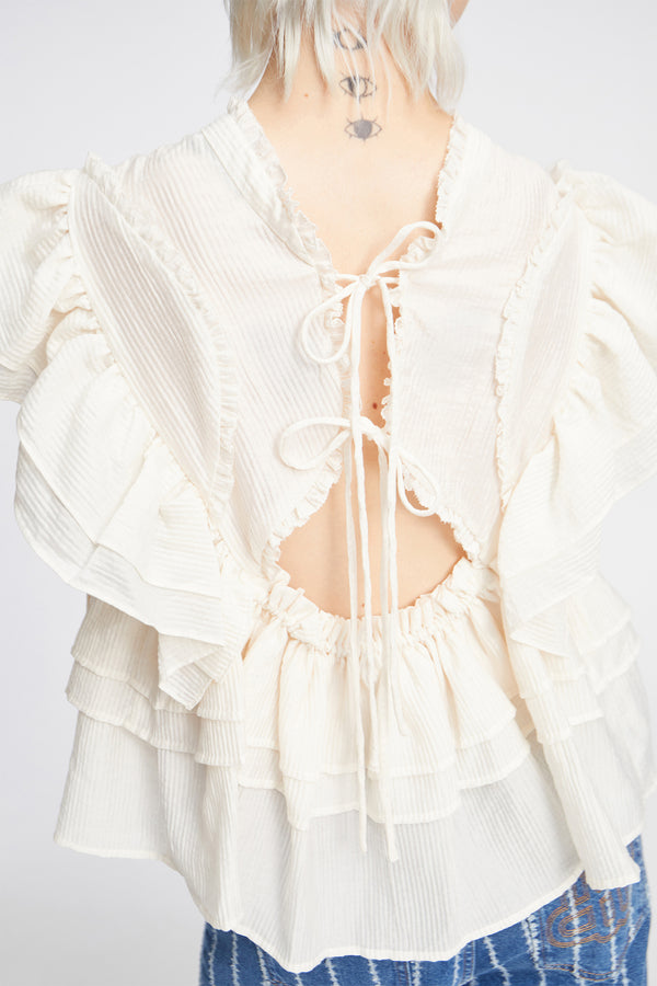 Bluse designet med elegante flæse detaljer på ærmer samt fra taljen og ned. Blusen har en smuk bindebånds lukning bag på.
