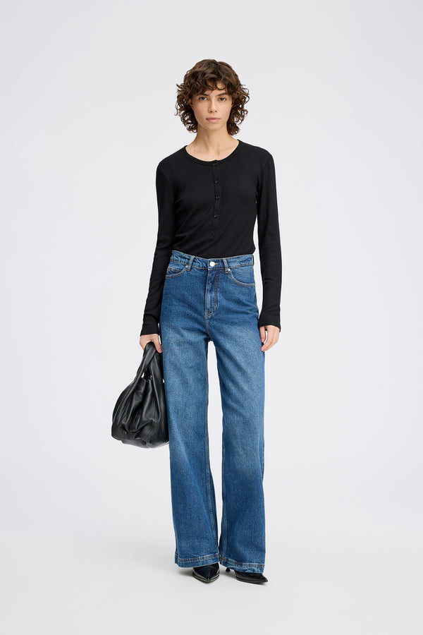 En ribbet T-shirt med en elegant delvis knaplukning på brystet. T-shirten har lange ærmer og er designet med en rund halsudskæring.