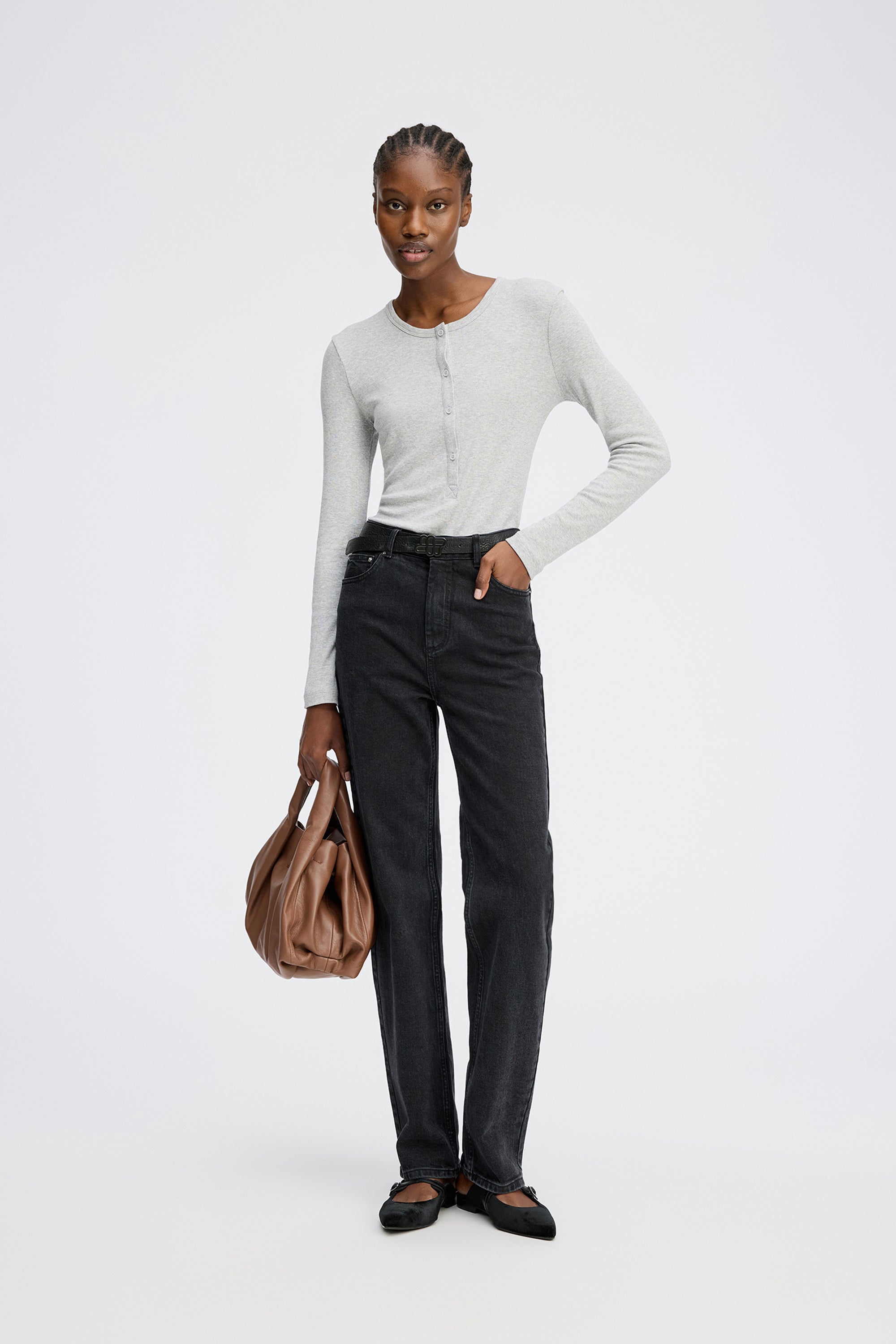En ribbet T-shirt med en elegant delvis knaplukning på brystet. T-shirten har lange ærmer og er designet med en rund halsudskæring.