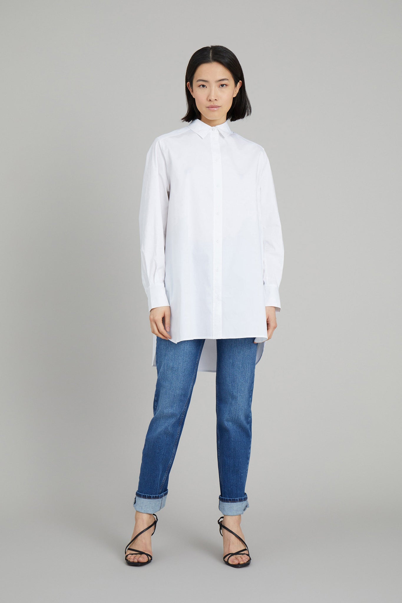 Klassisk skjorte designet i en løs pasform, i et bæredygtigt bomulds mix. Skjorten har lange ærmer, en lille krave og er en smule længere bagtil.