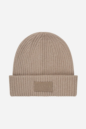 Ribstrikket hue med logomærke foran. Fremstillet af en blød genanvendt polyester blanding.