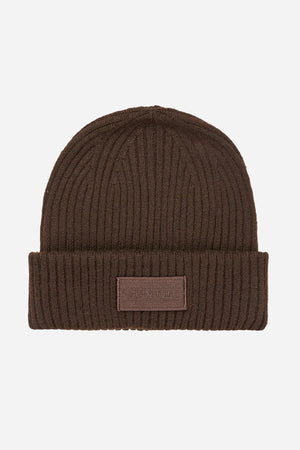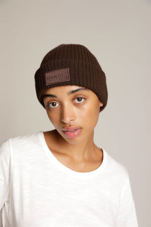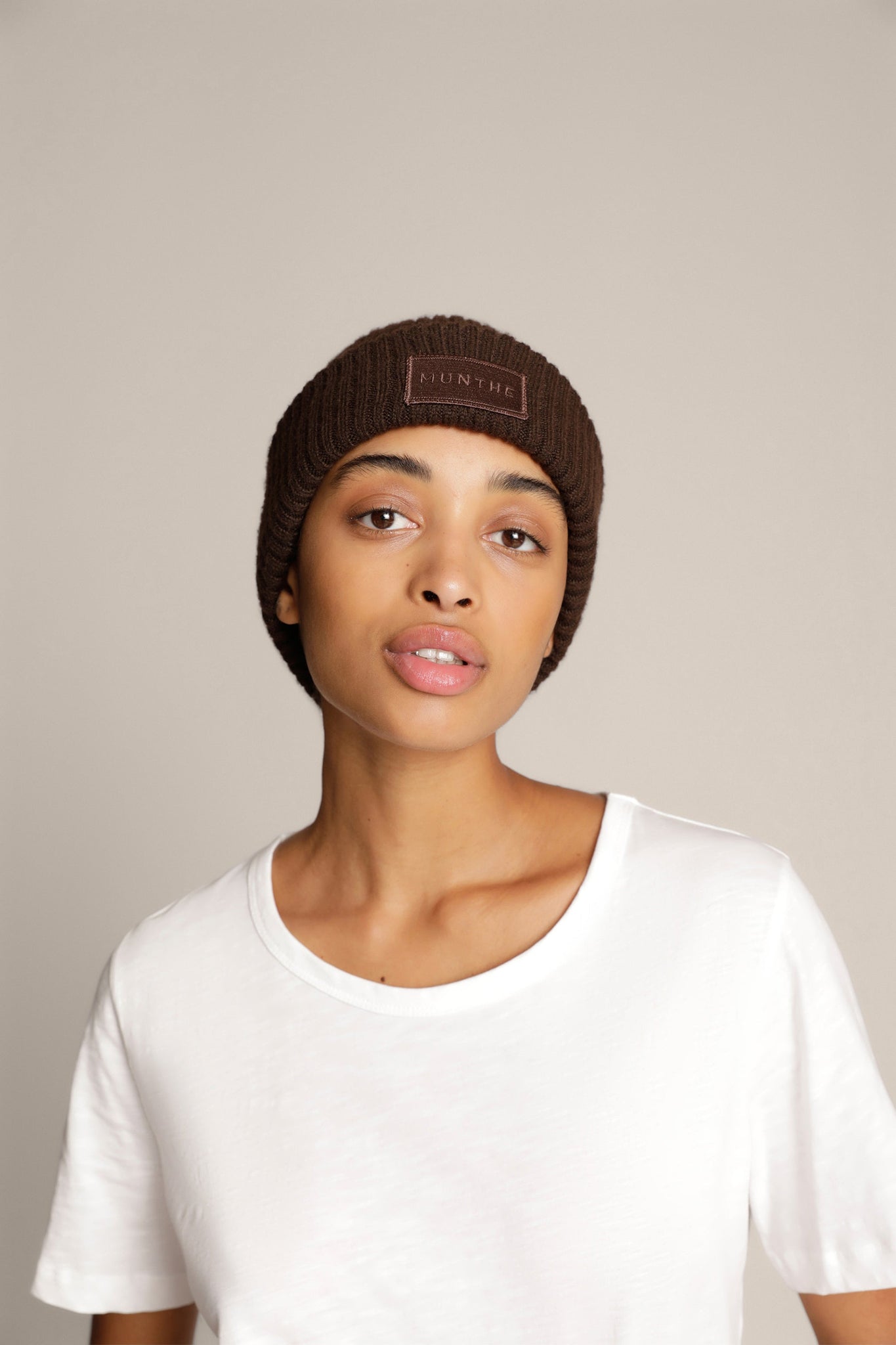 Ribstrikket hue med logomærke foran. Fremstillet af en blød genanvendt polyester blanding.