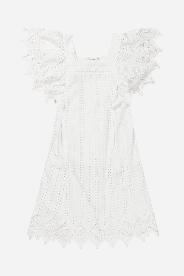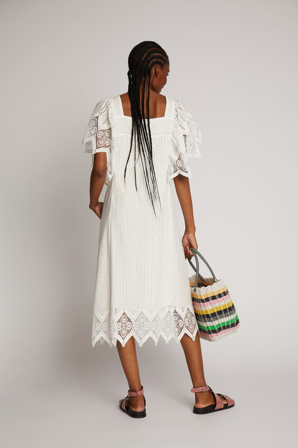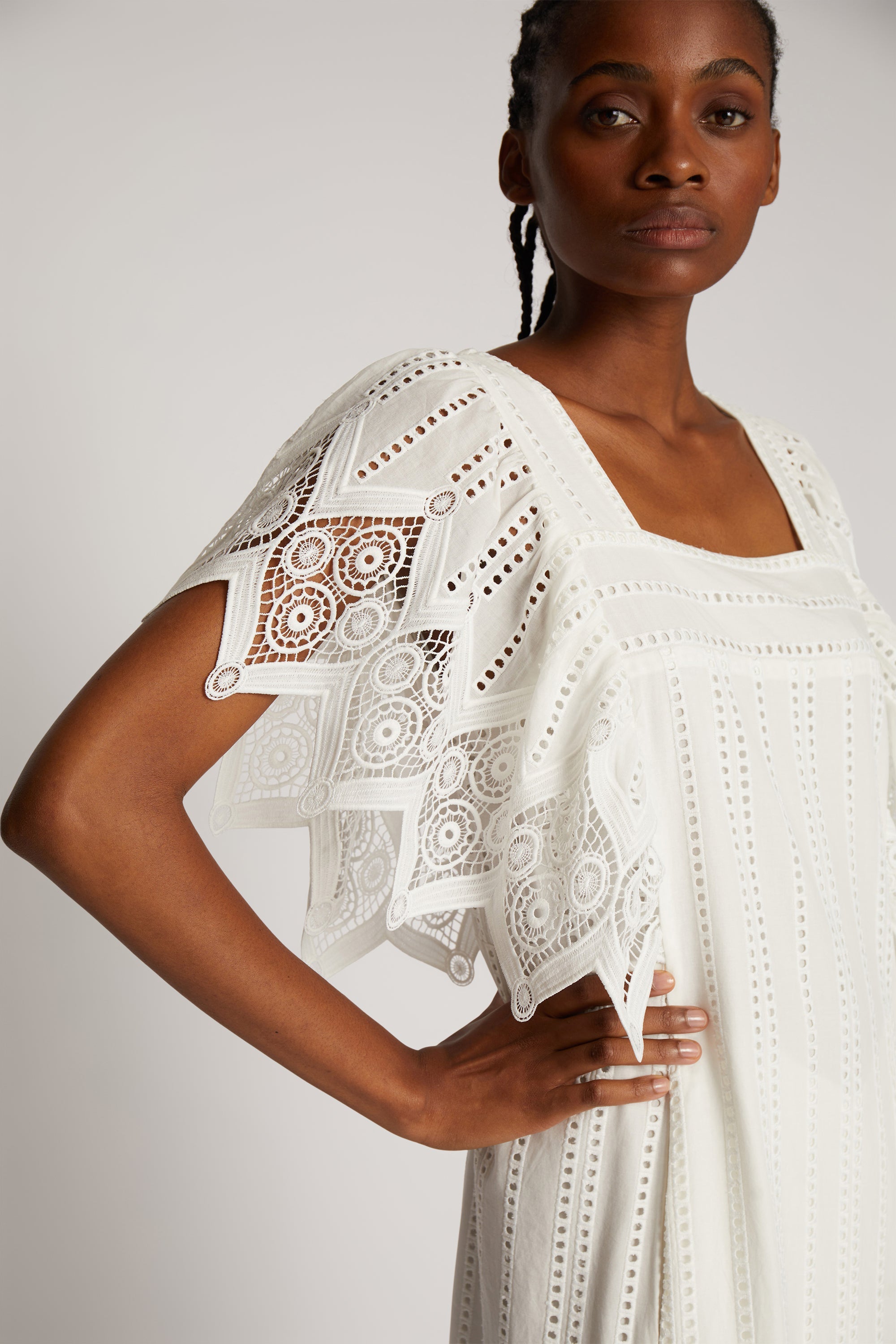En lang kjole med smukt broderi anglaise. Kjolen har elegante løse ærmer og er designet til en normal pasform. Fås i farverne gul eller hvid.