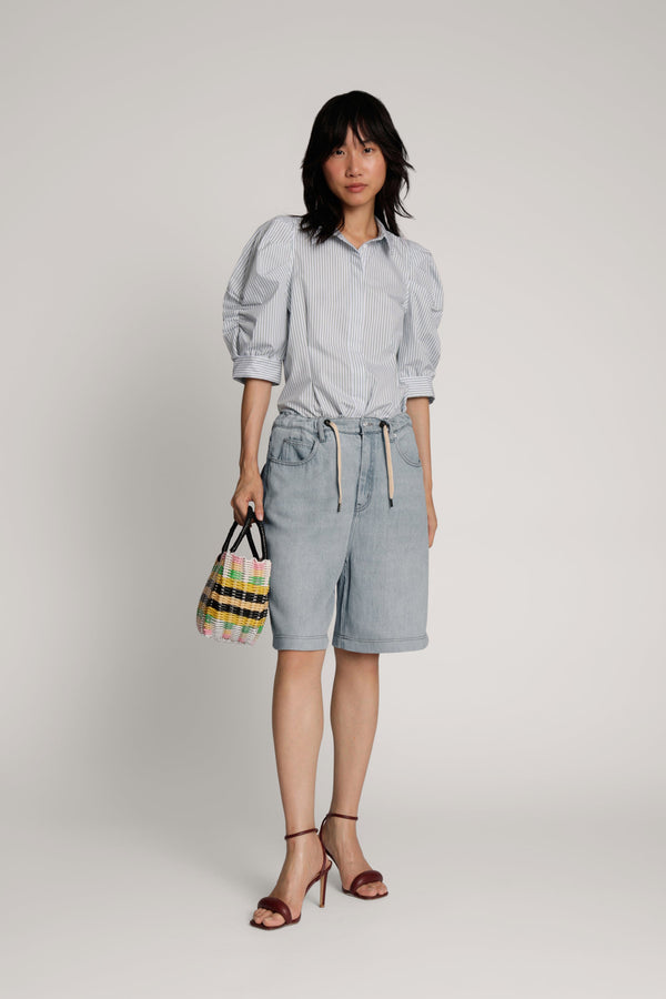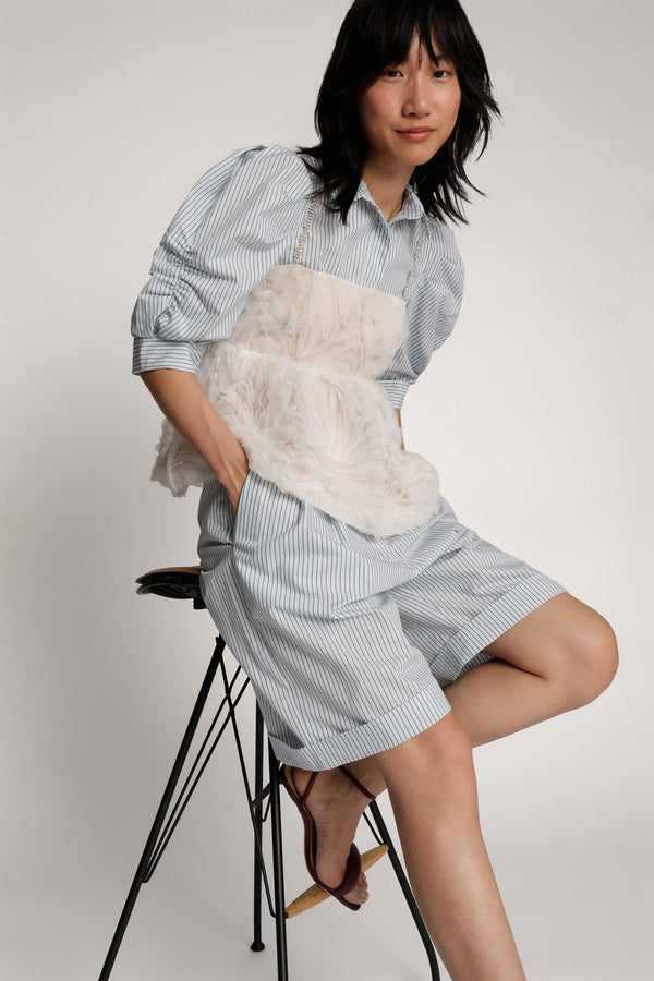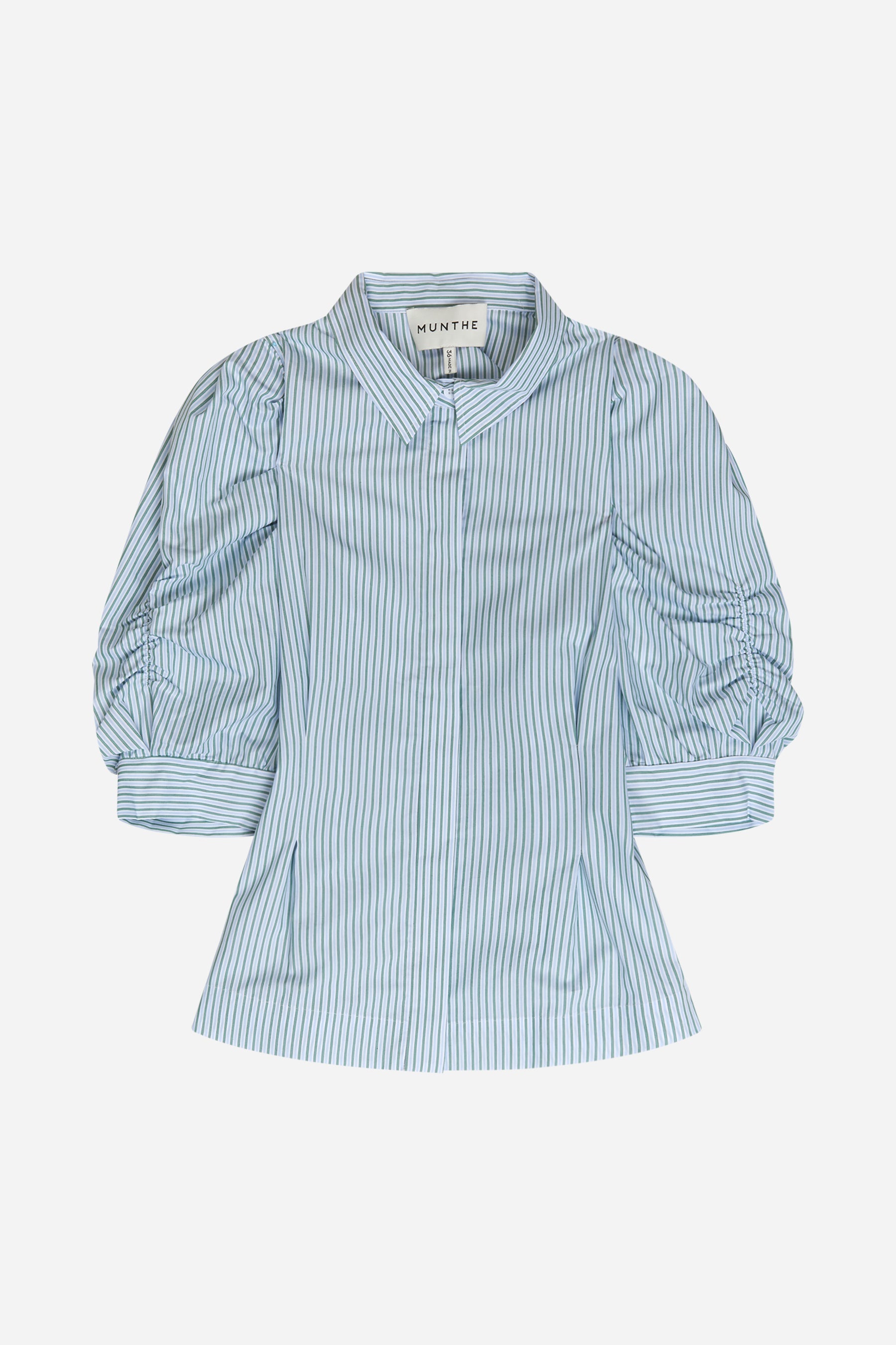 Elegant blå nålestribet skjorte, designet med trekvart lange pufærmer. Denne skjorte har en normal pasform, en lille krave og en knaplukning foran. Fås i farven blå.