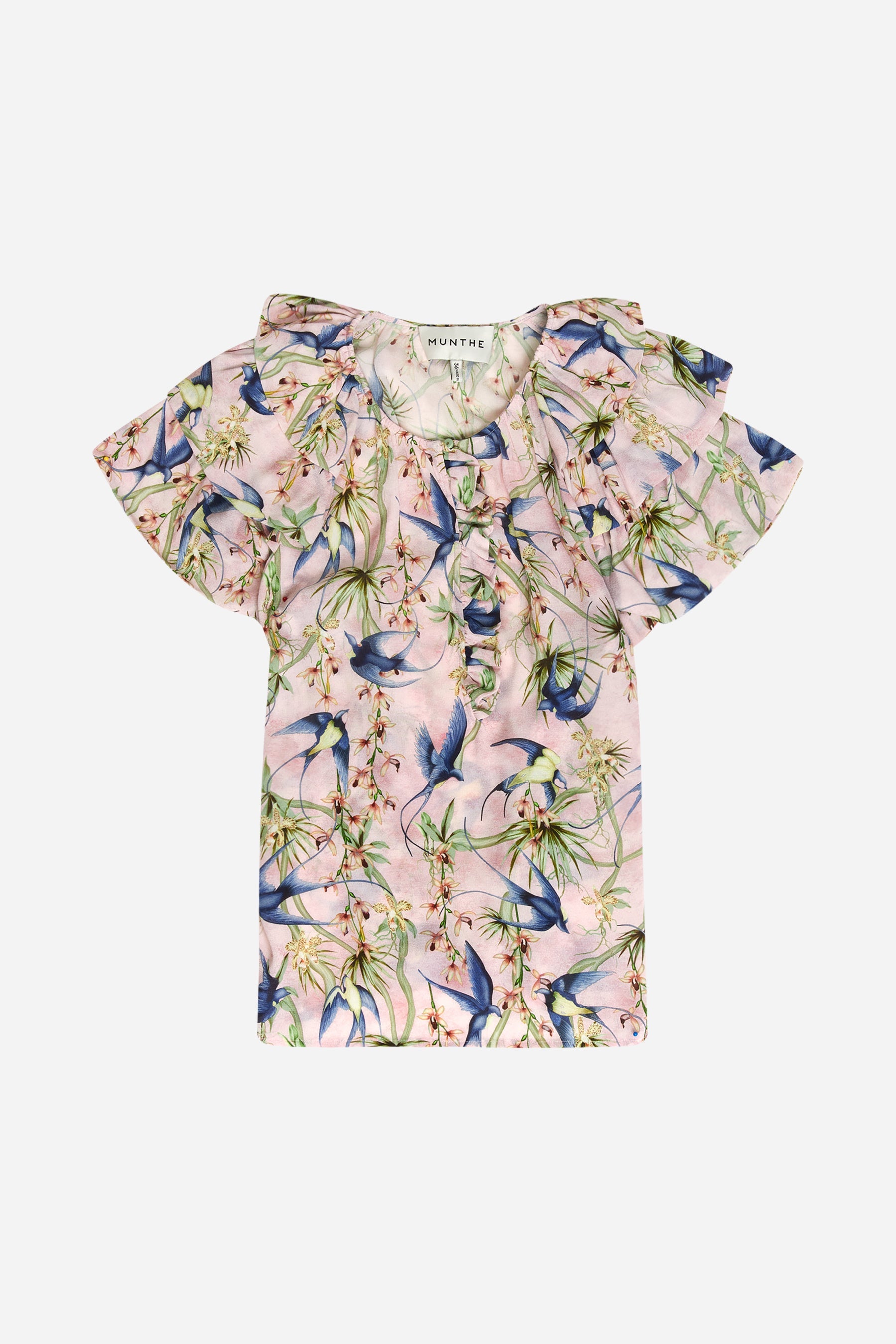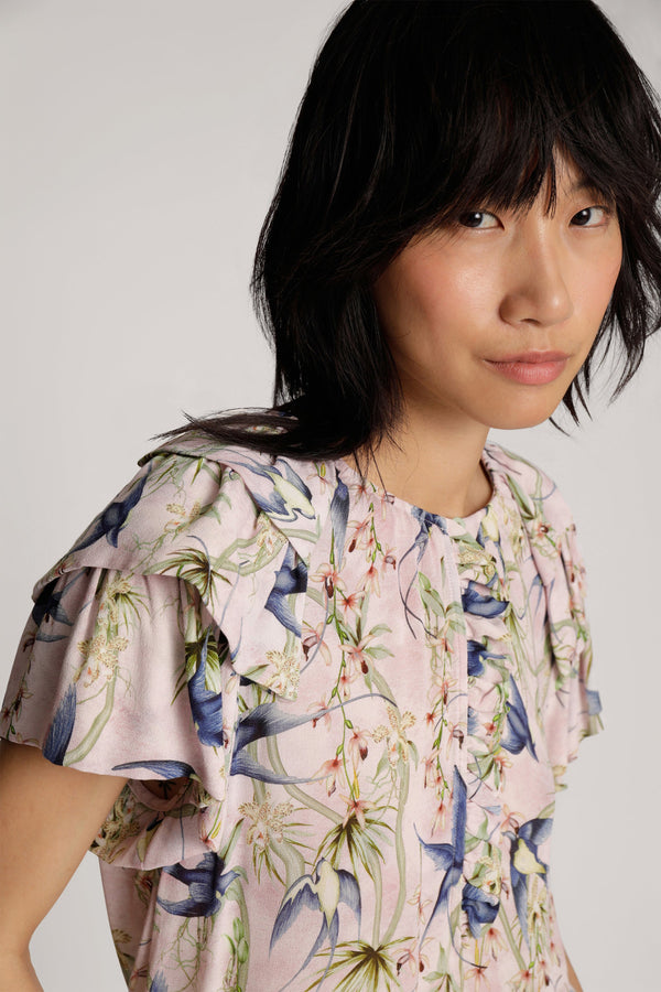 Bluse med et smukt print, designet med flæse detaljer ved skuldrene og på brystet. Blusen har korte ærmer og en split hals med en elegant knaplukning. Fås i farven rose.