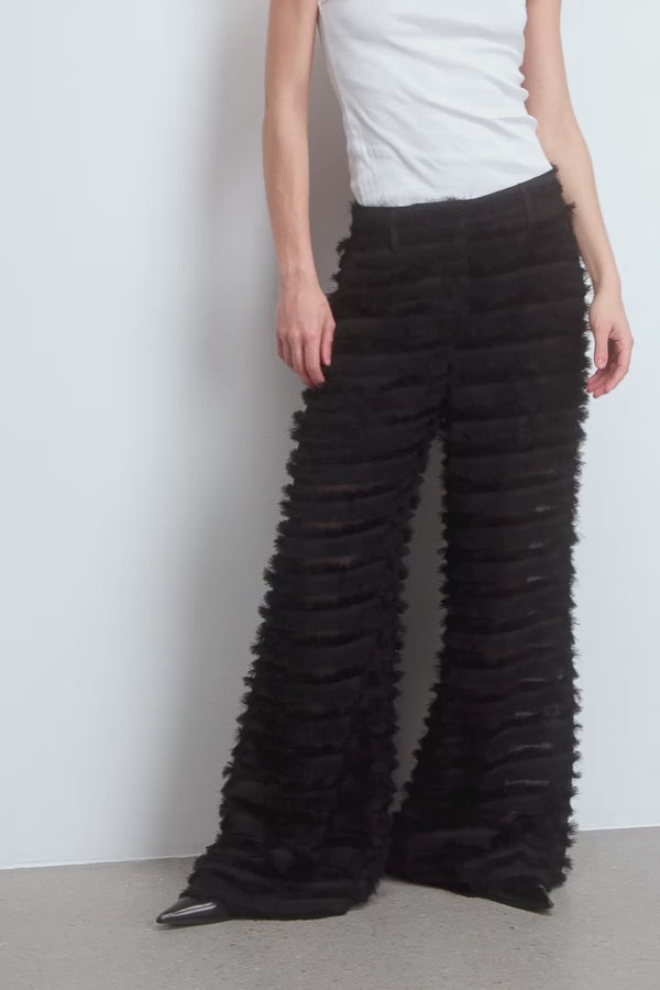 Bukser, der er let transparente, med smukke, fine frynser. Bukserne lukkes med en lynlås og er designet med lommer, bæltestropper og brede ben.