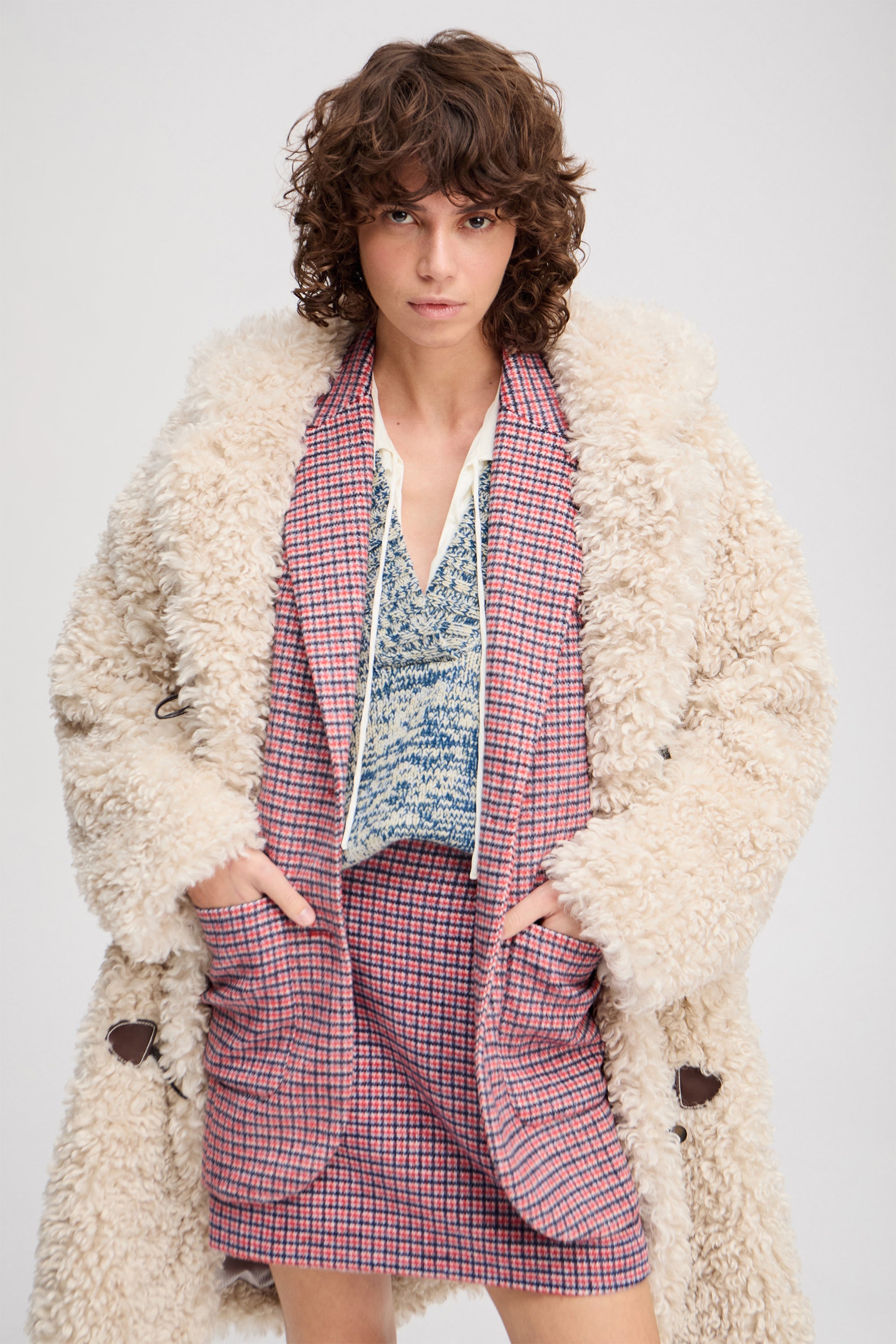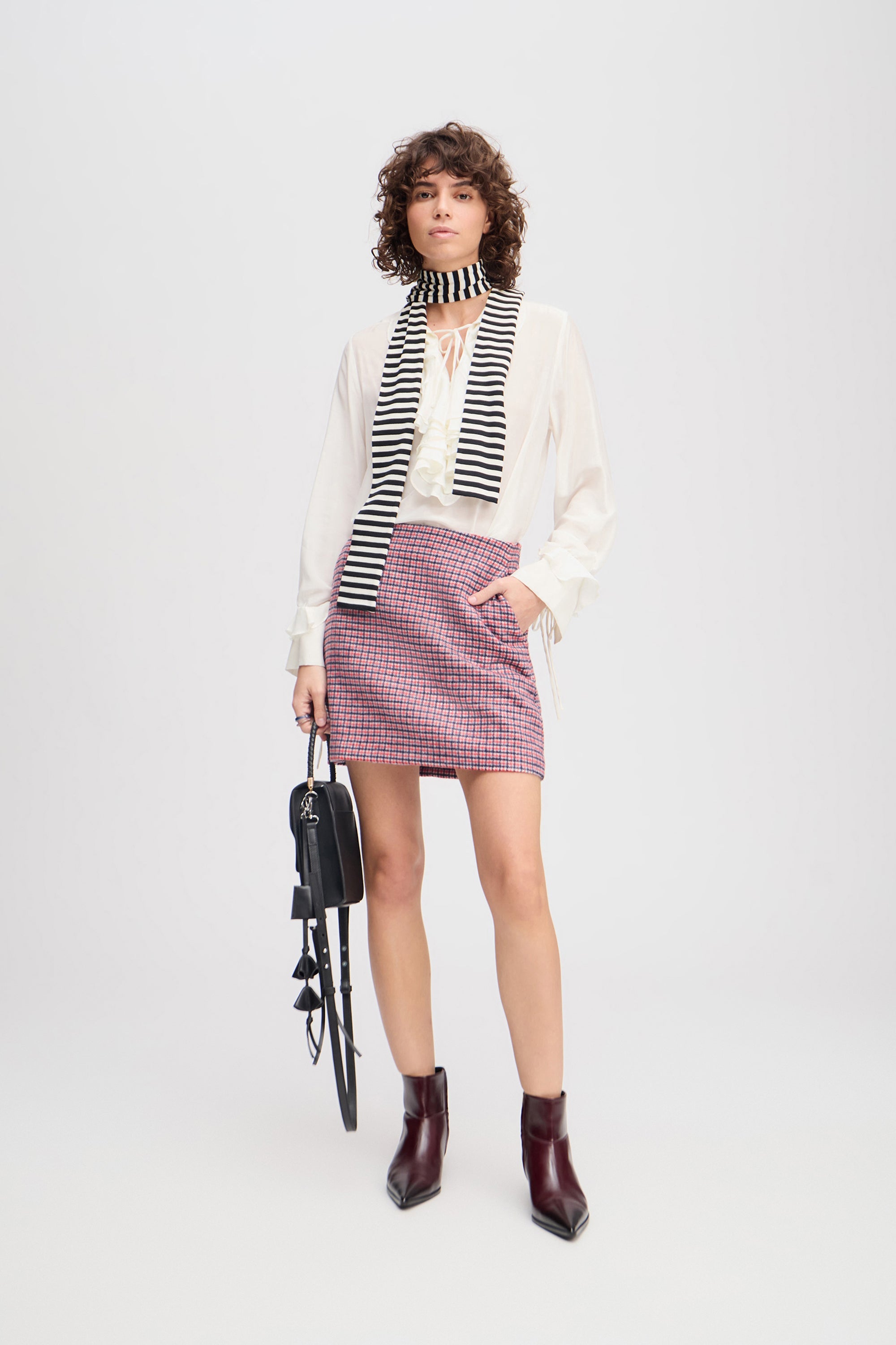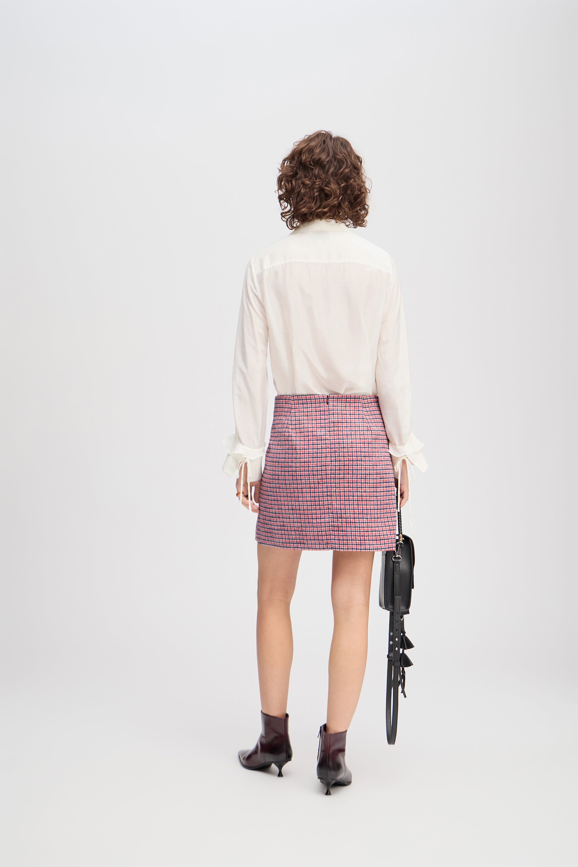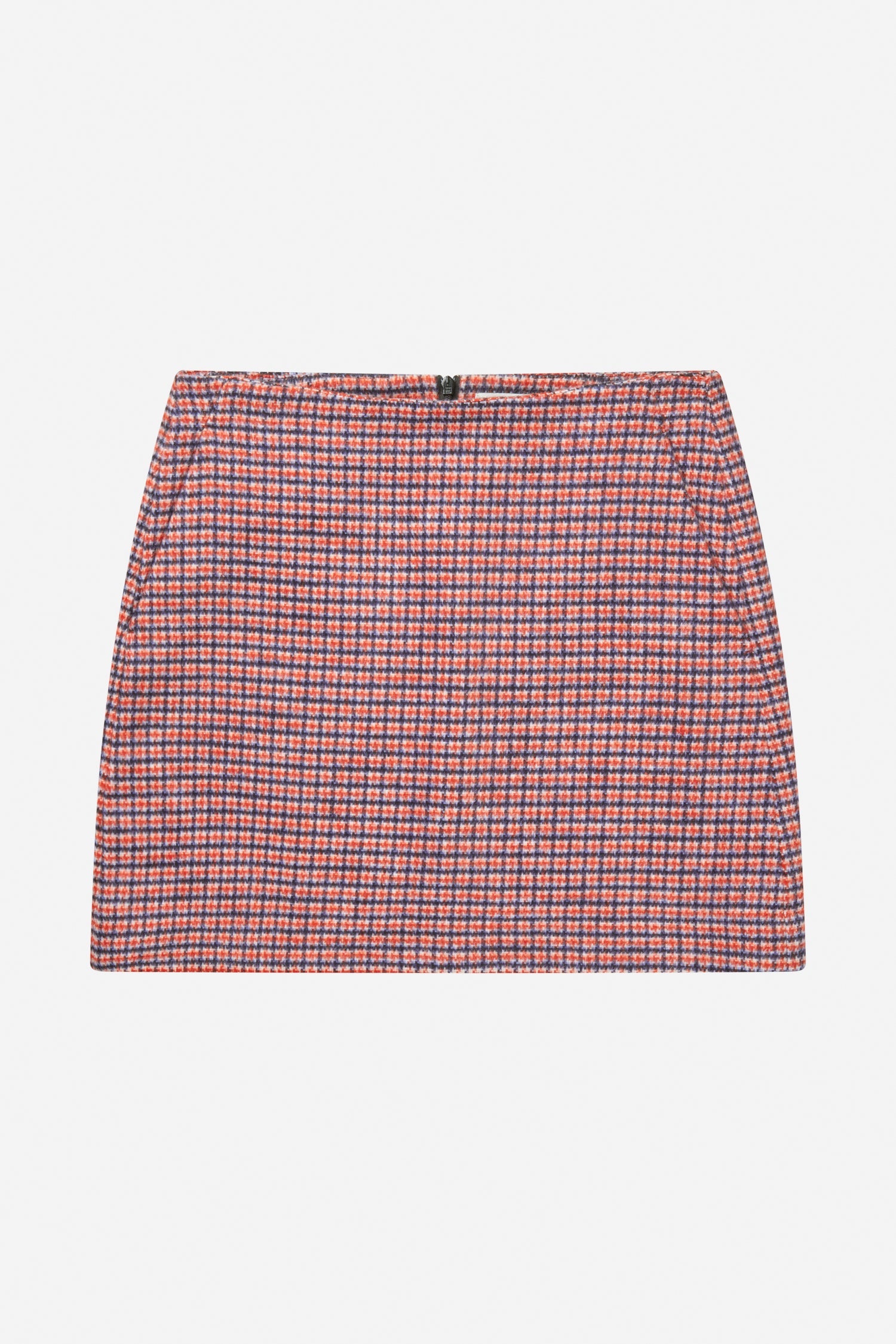 En elegant, kort, ternet nederdel med fine skrå lommer i siden. Denne nederdel lukkes med en lynlås bagpå og er designet til at være tætsiddende.