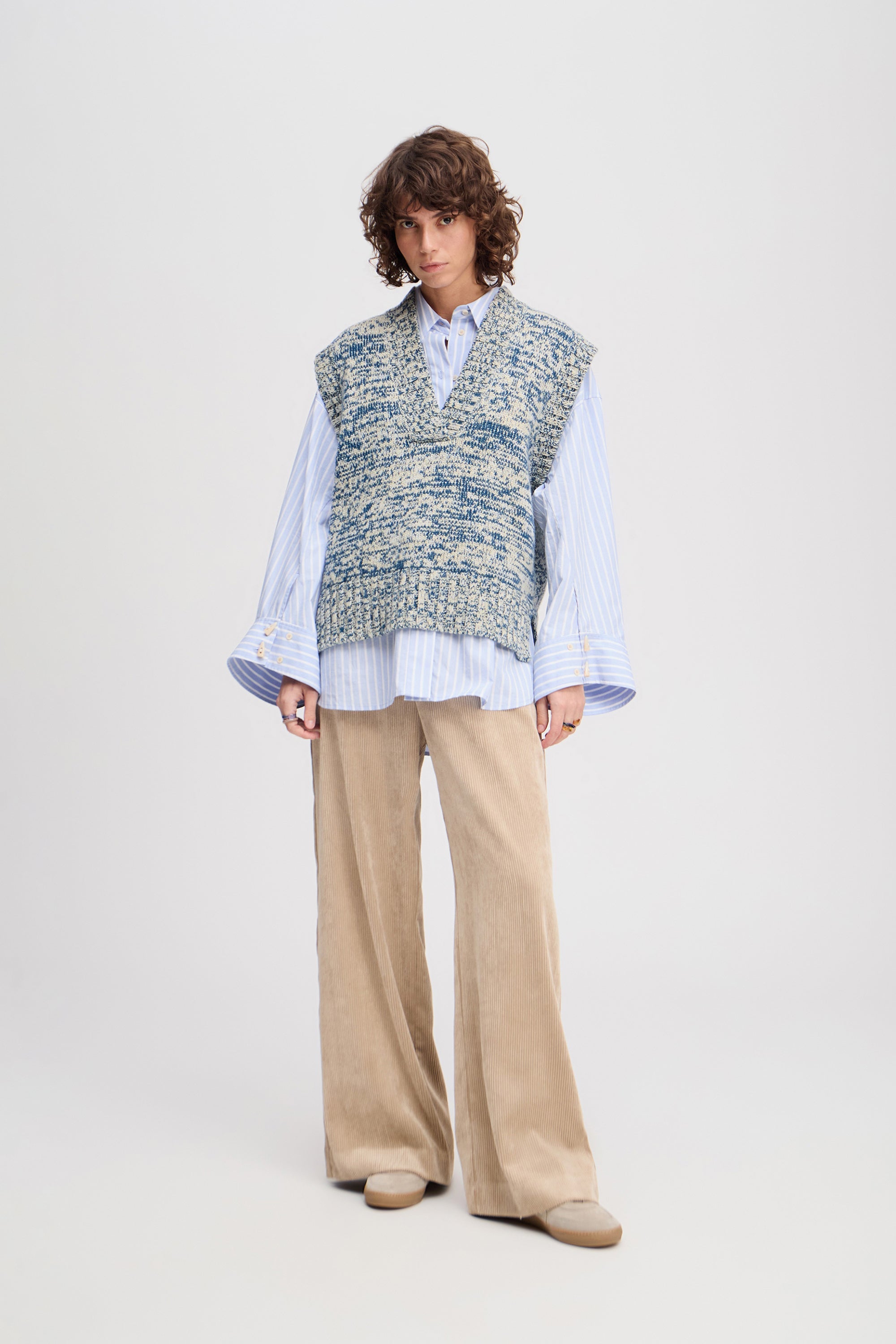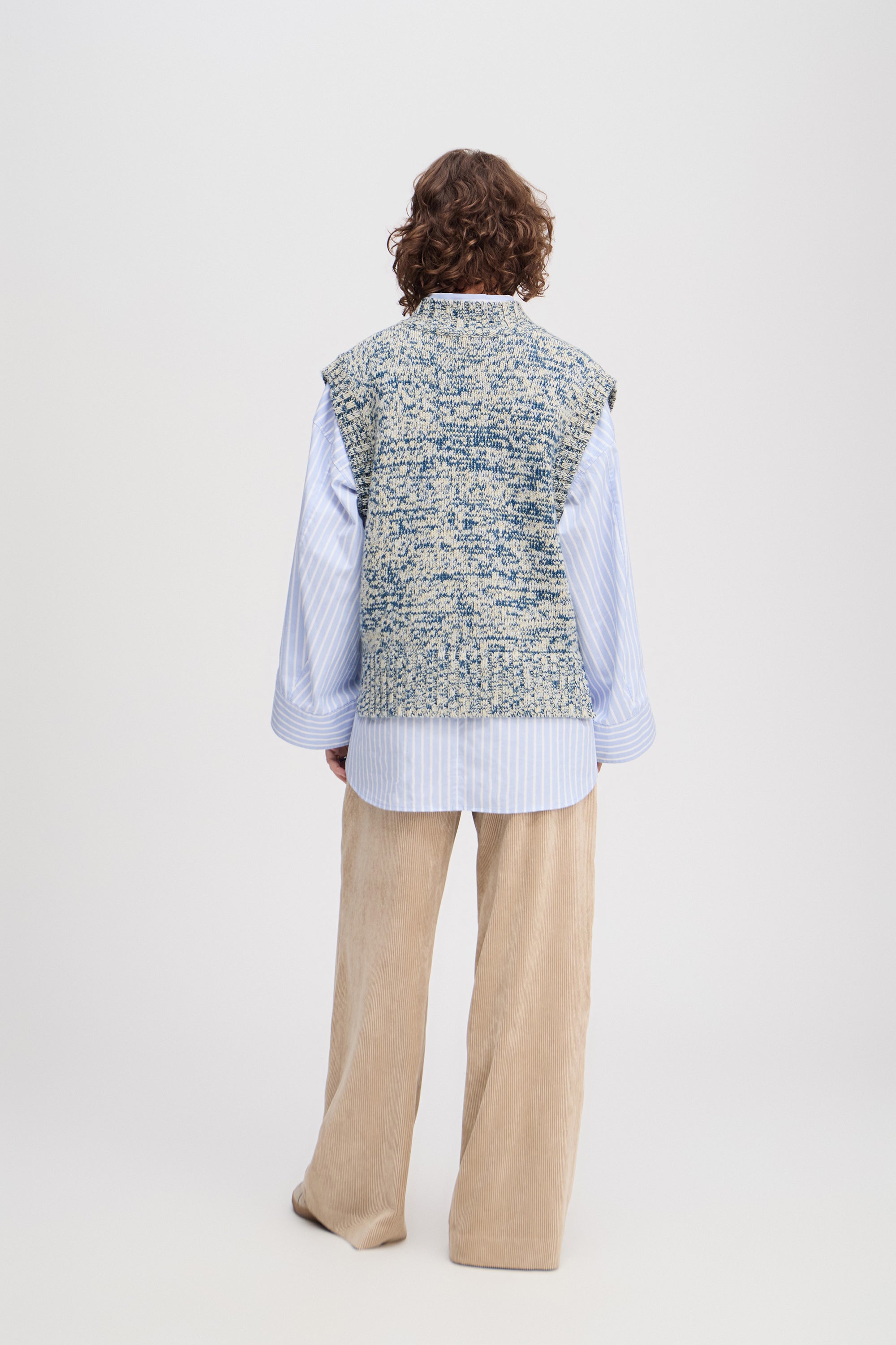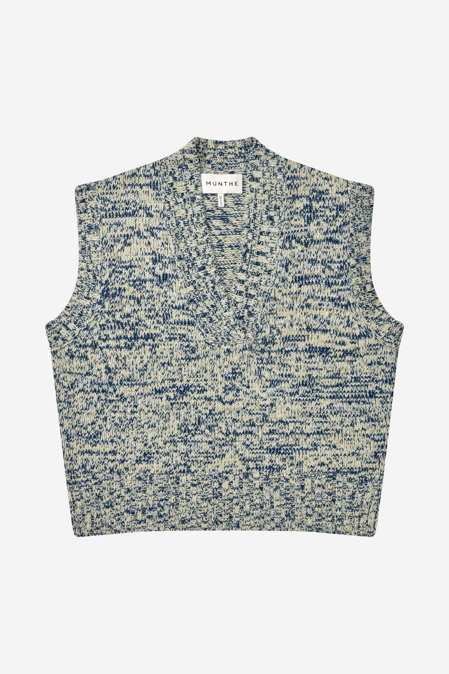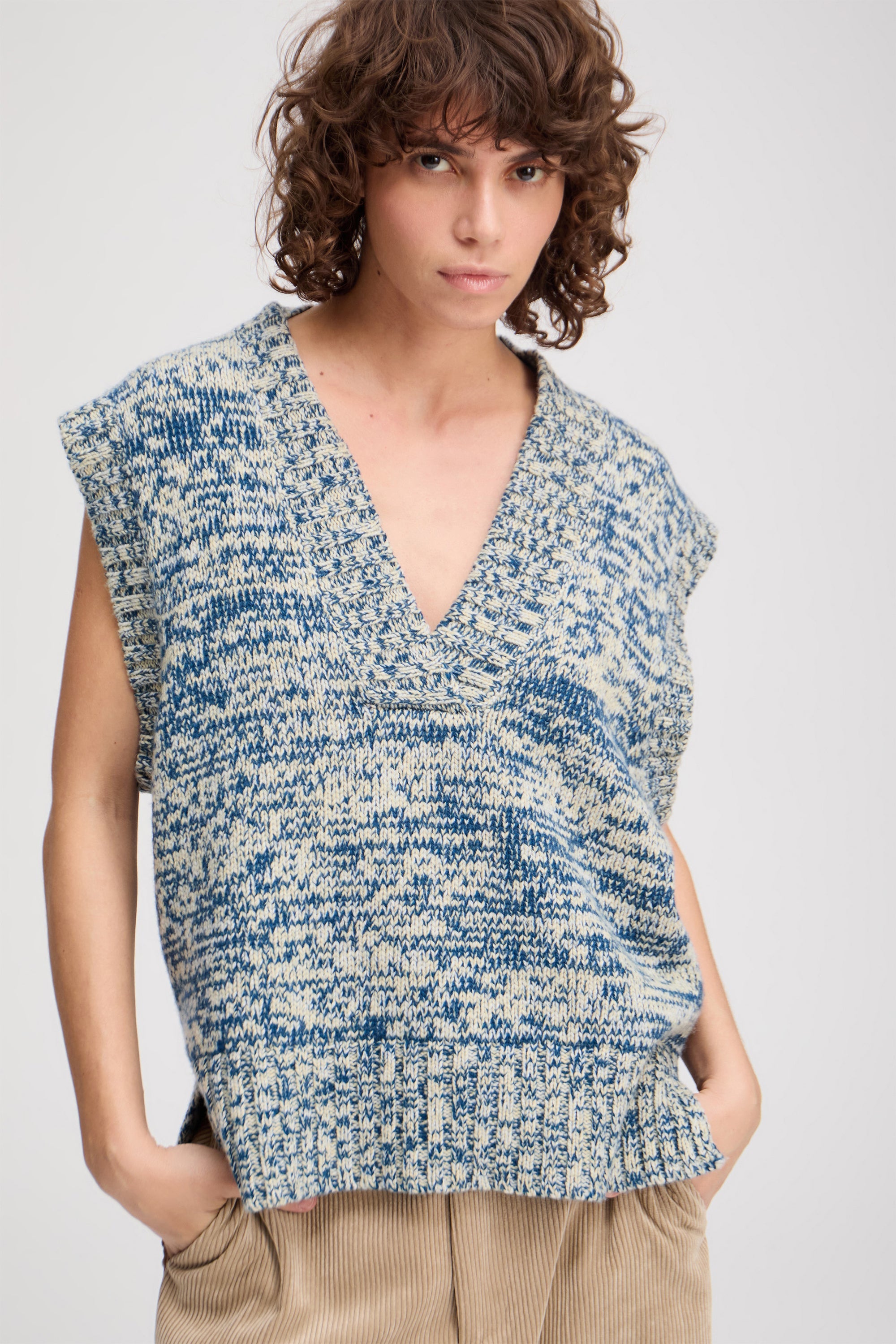 Vest strikket i et fint mønster, med smukke rib detaljer og en elegant slids i siderne. Strikken er designet med en dyb V-udskæring.