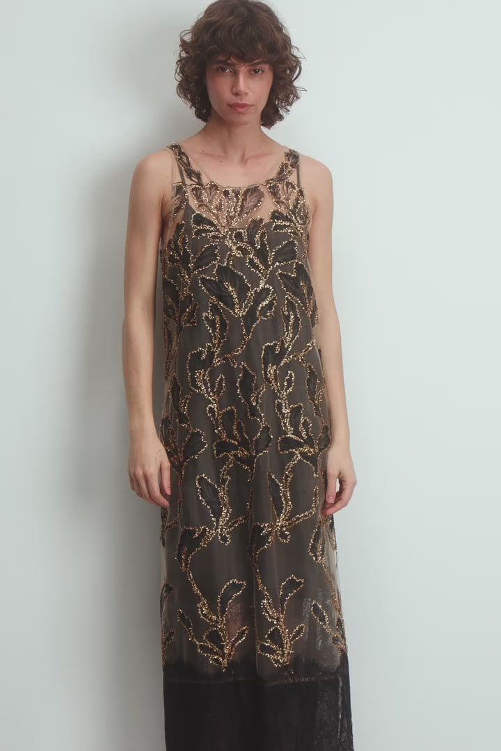 Kjole med en smuk all-over guld blomster applikation, en fin slids i siden og en elegant bred blondekant nederst. Denne alsidige kjole kan styles med eller uden slip dress.