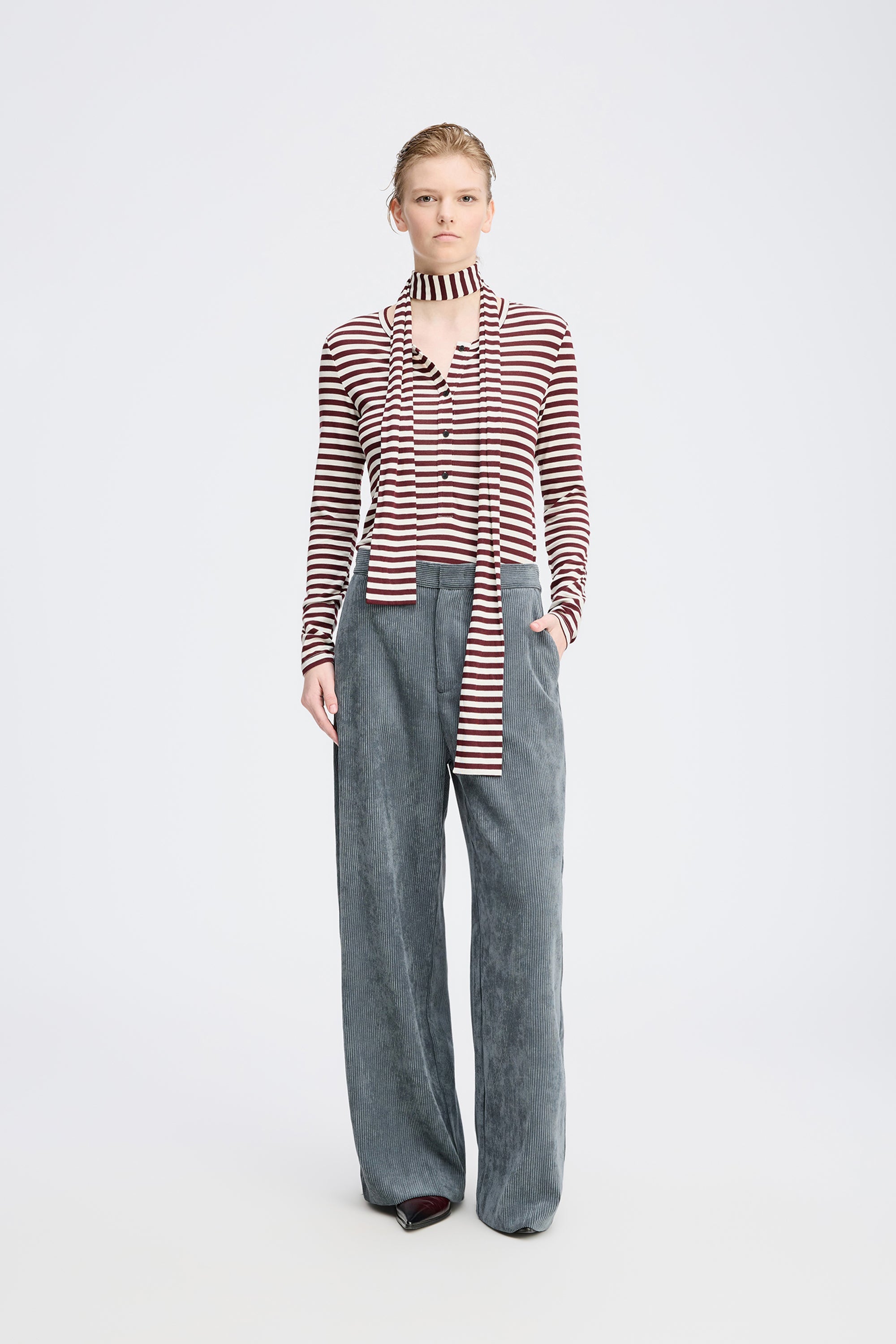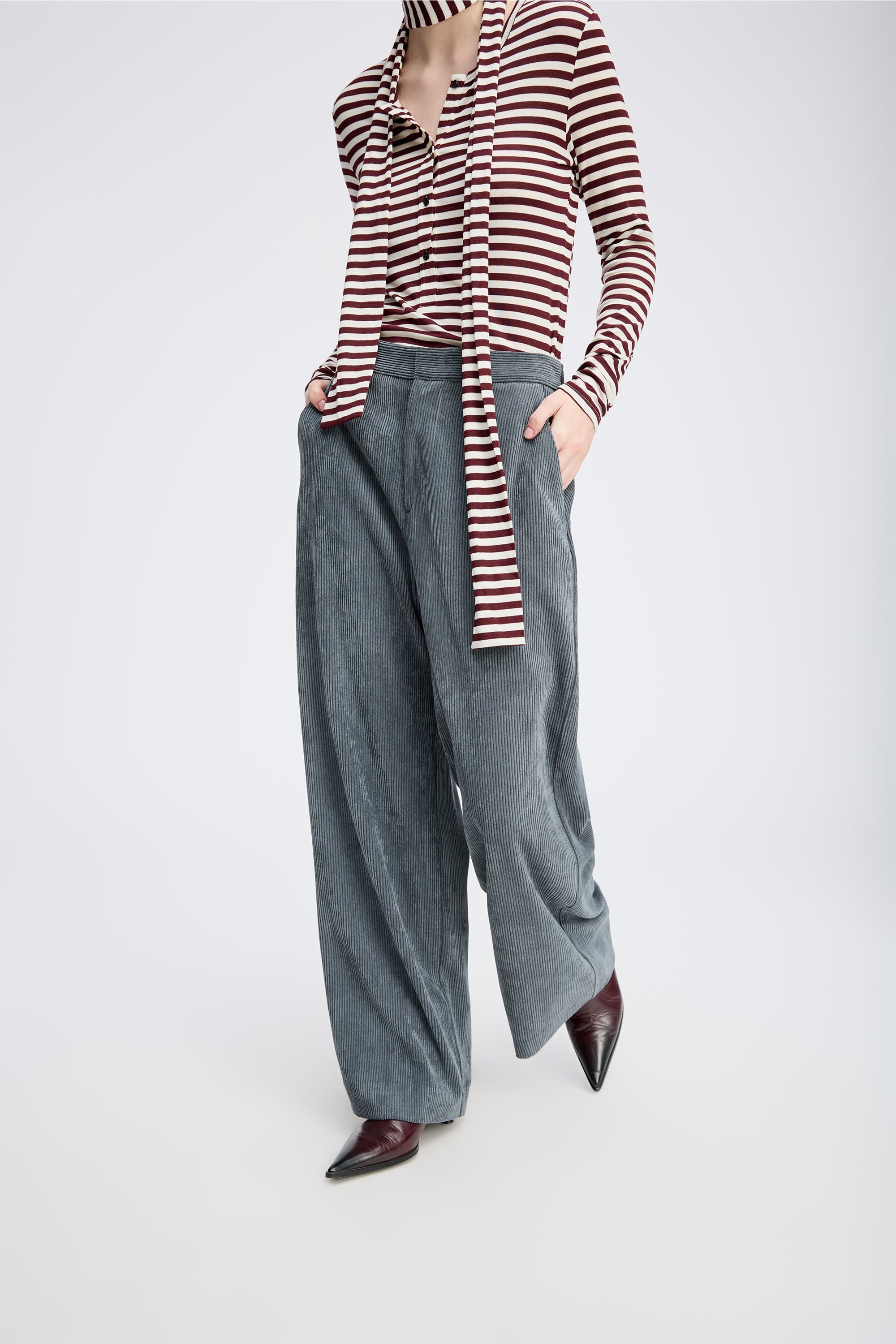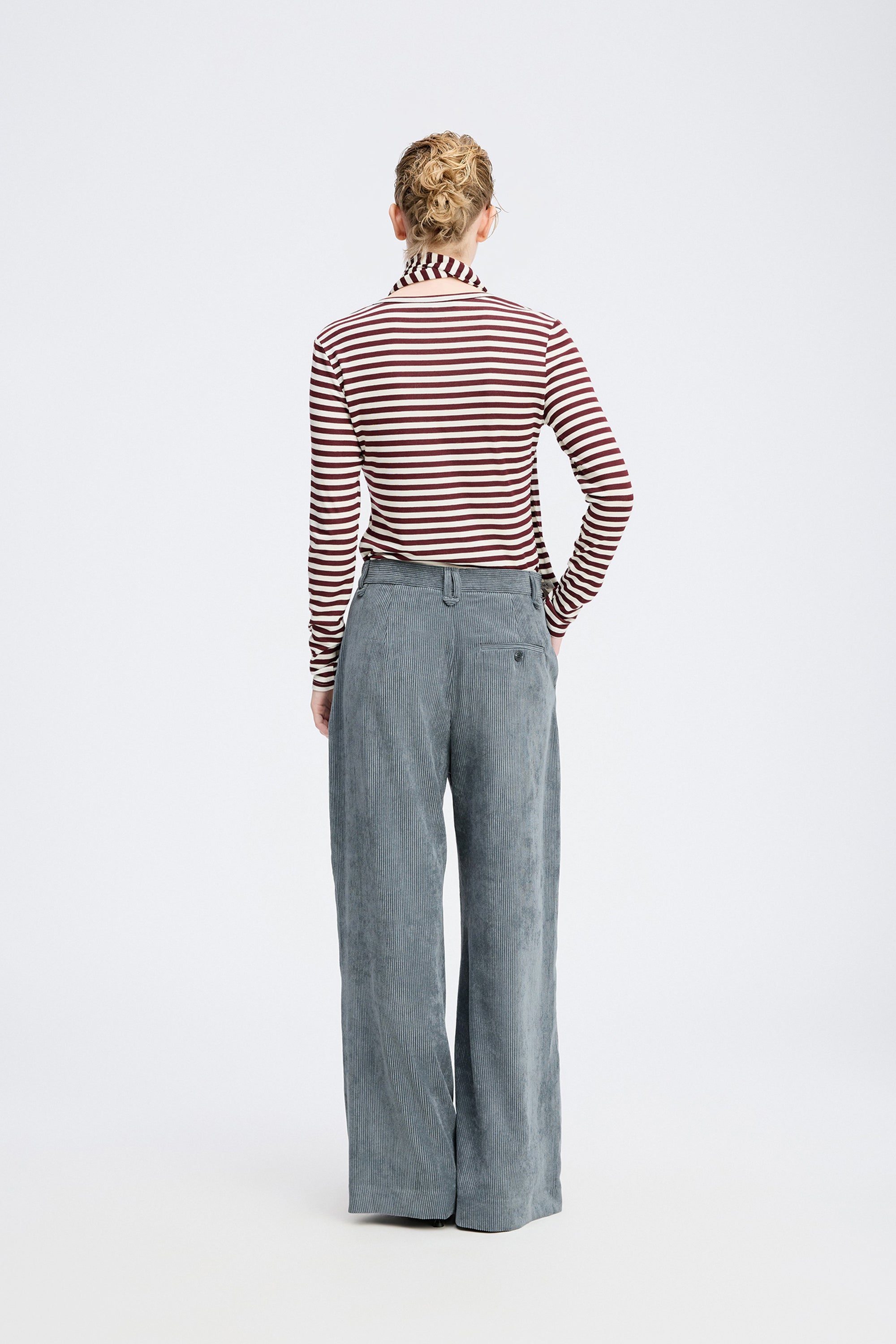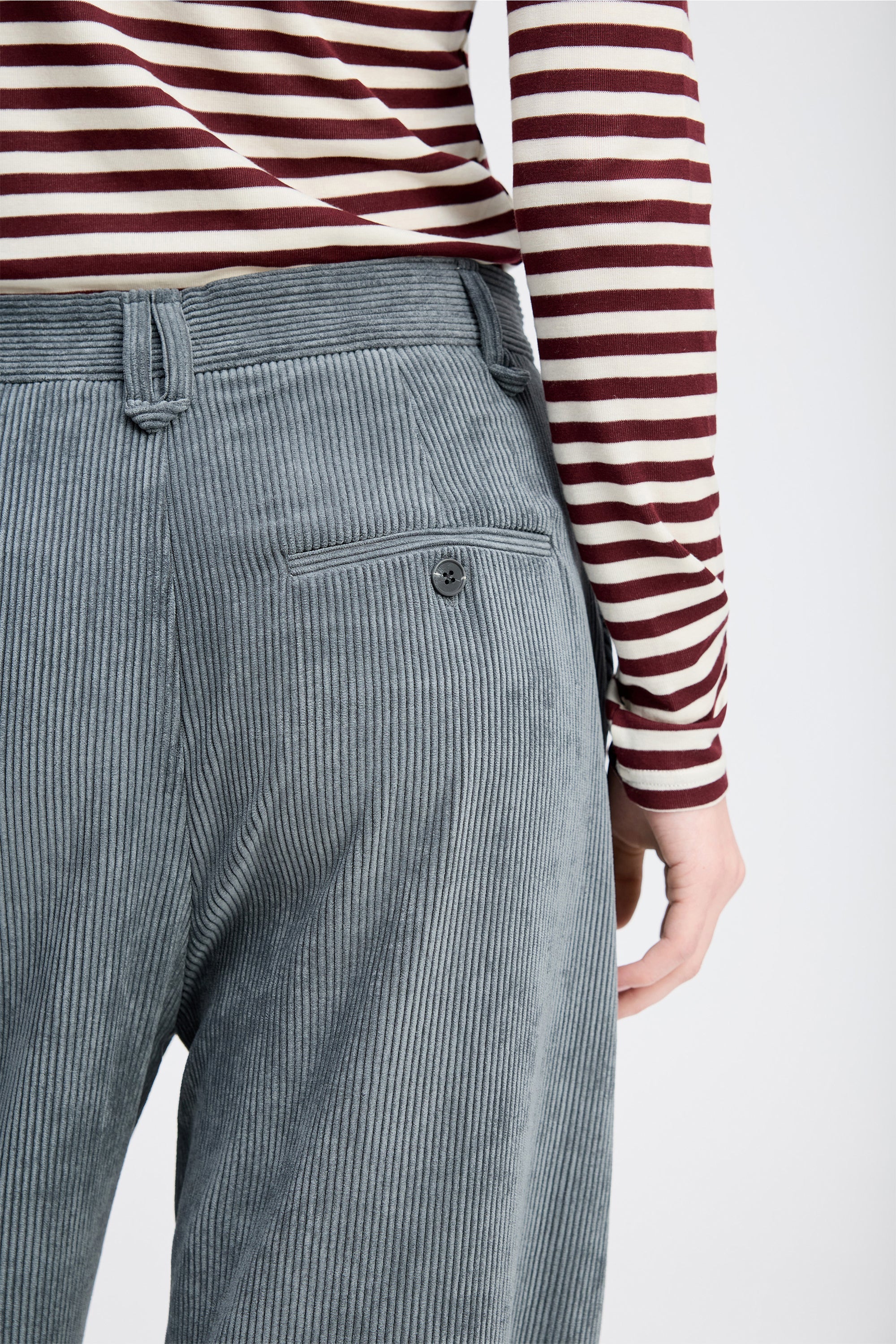 Smukke fløjlsbukser designet med elegante detaljer såsom brede ben, bæltestropper og sidelommer. Bukserne lukkes med en lynlås foran.