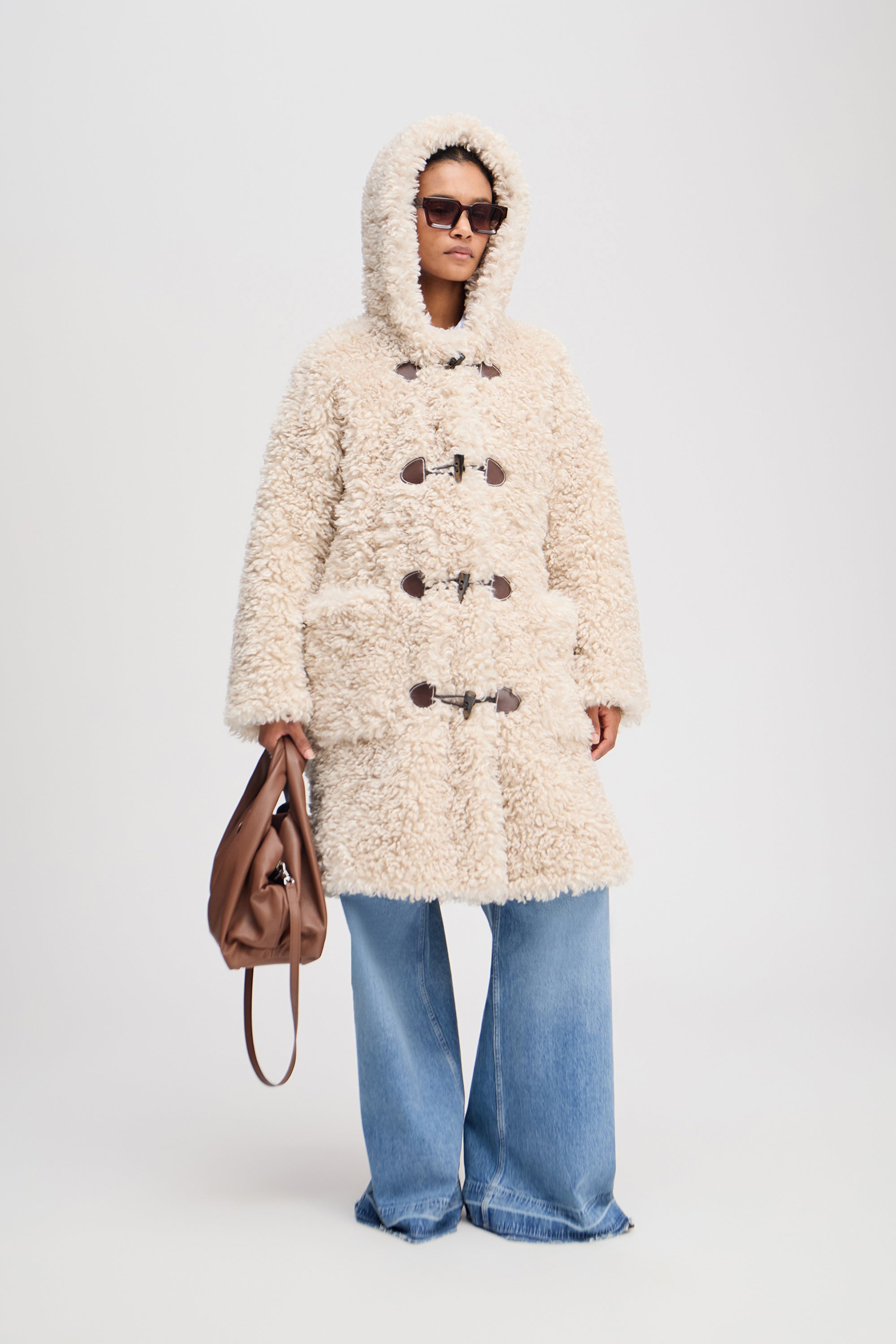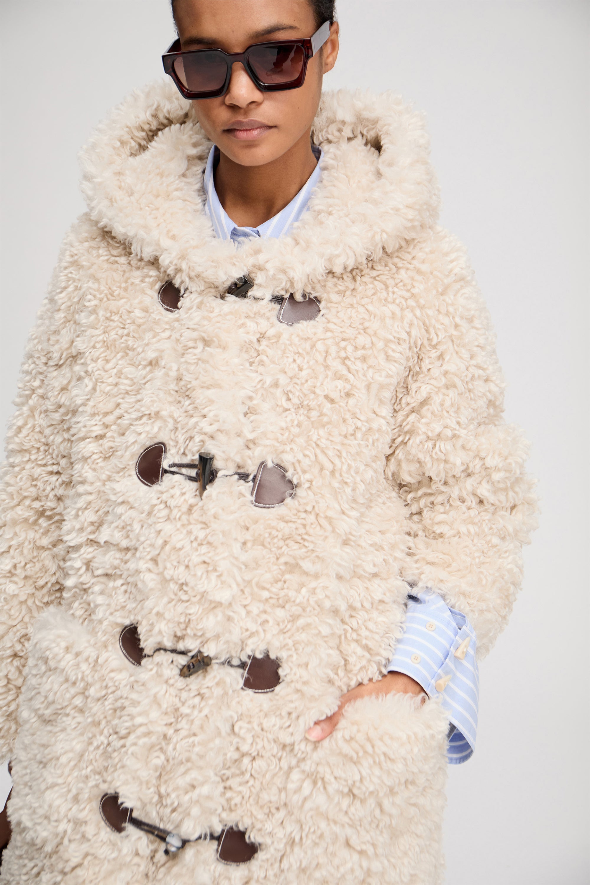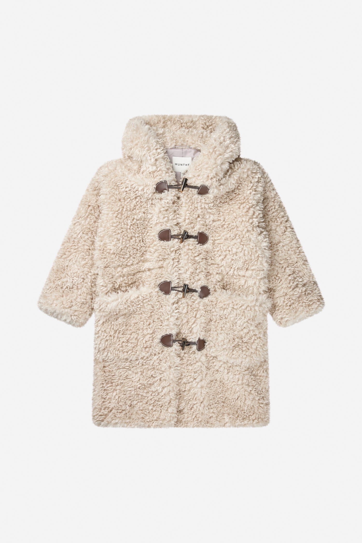 En smuk teddy frakke med toggle-lukning og imiterede hornknapper samt en elegant hætte. Frakken er designet med sidelommer.
