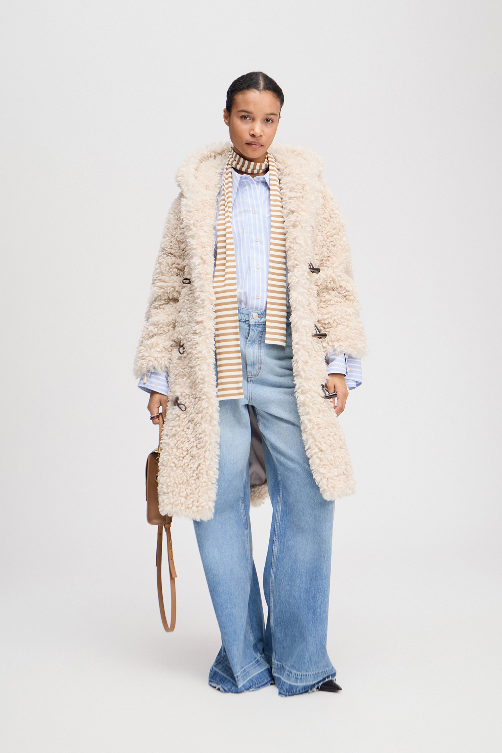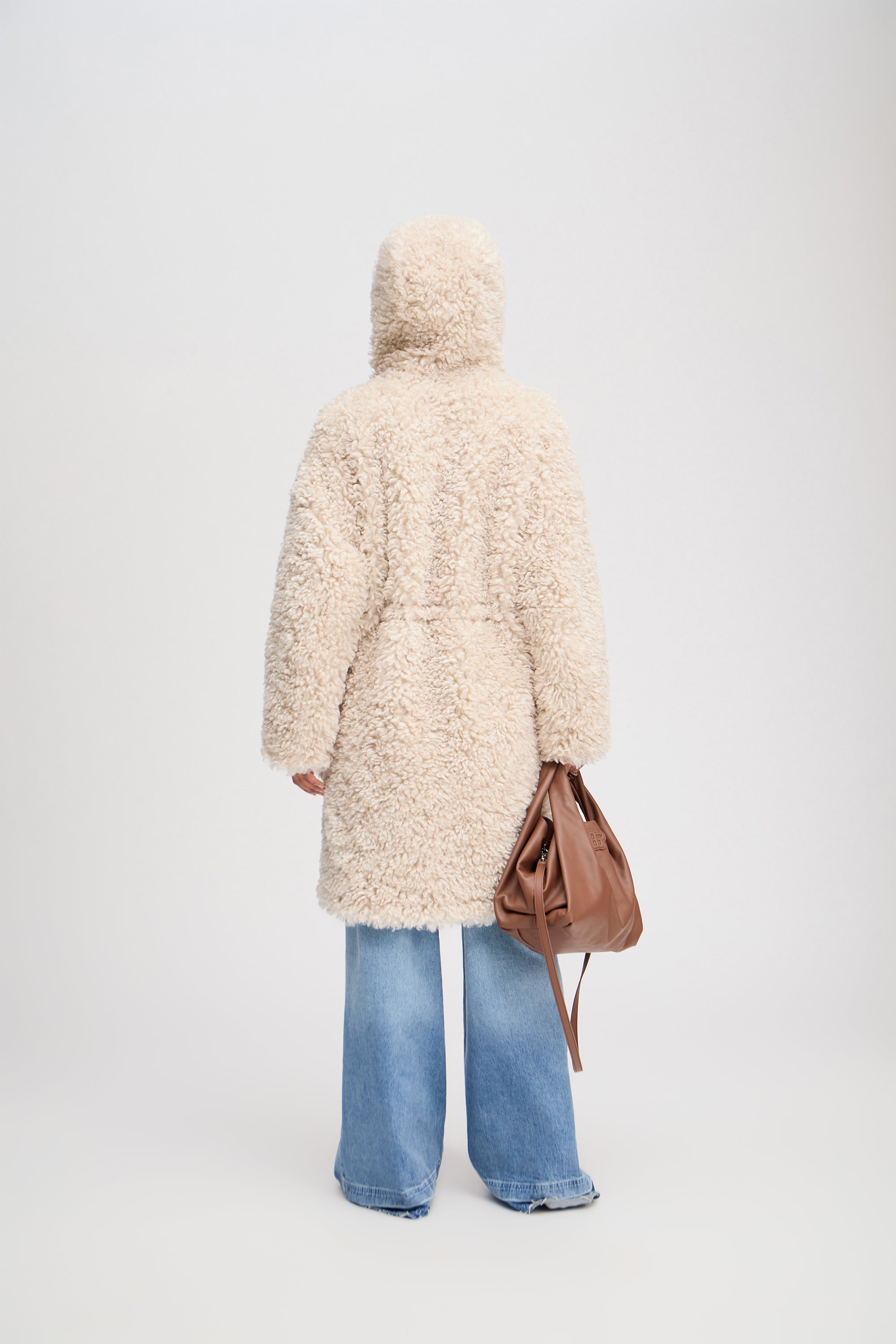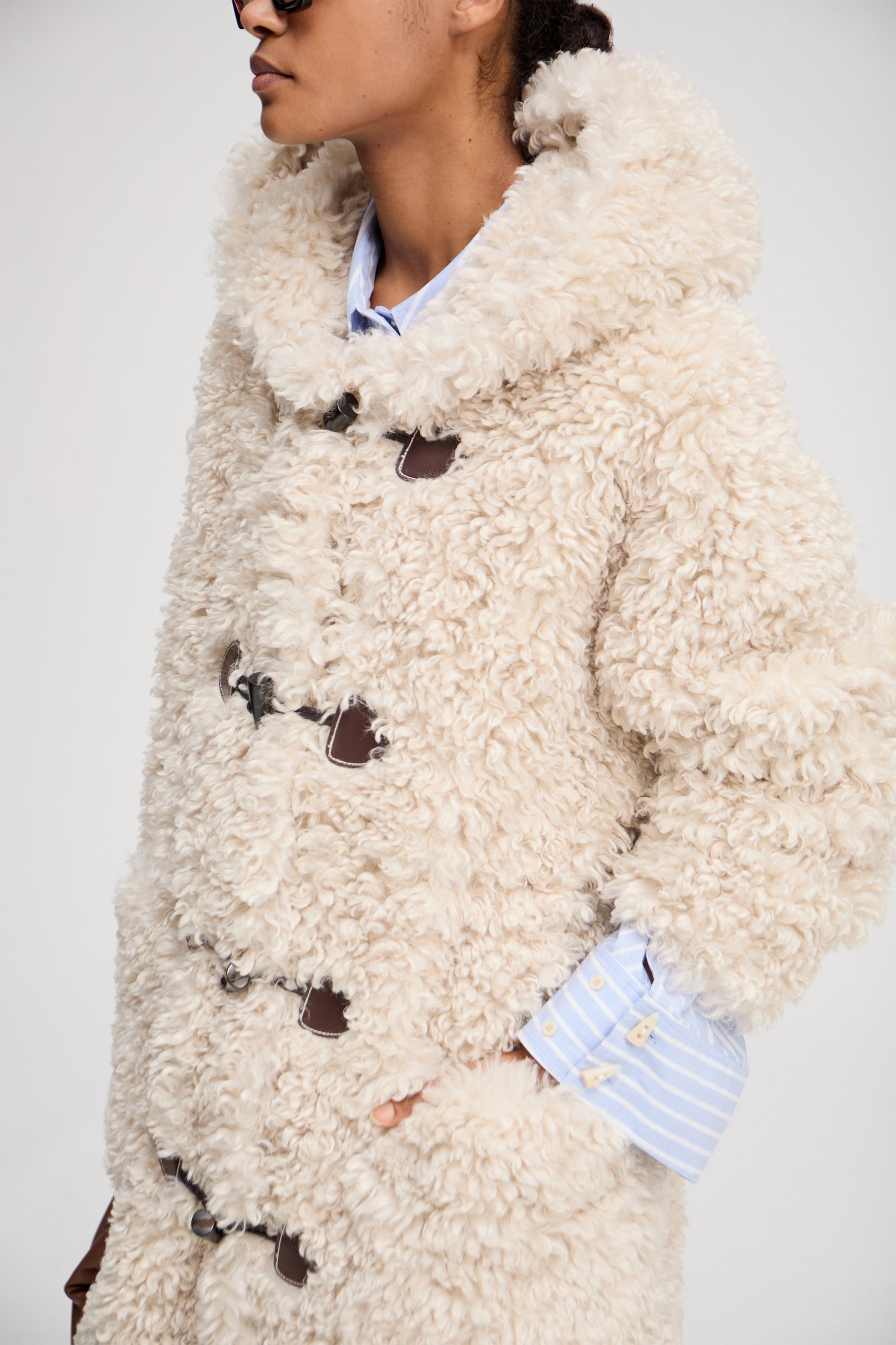 En smuk teddy frakke med toggle-lukning og imiterede hornknapper samt en elegant hætte. Frakken er designet med sidelommer.