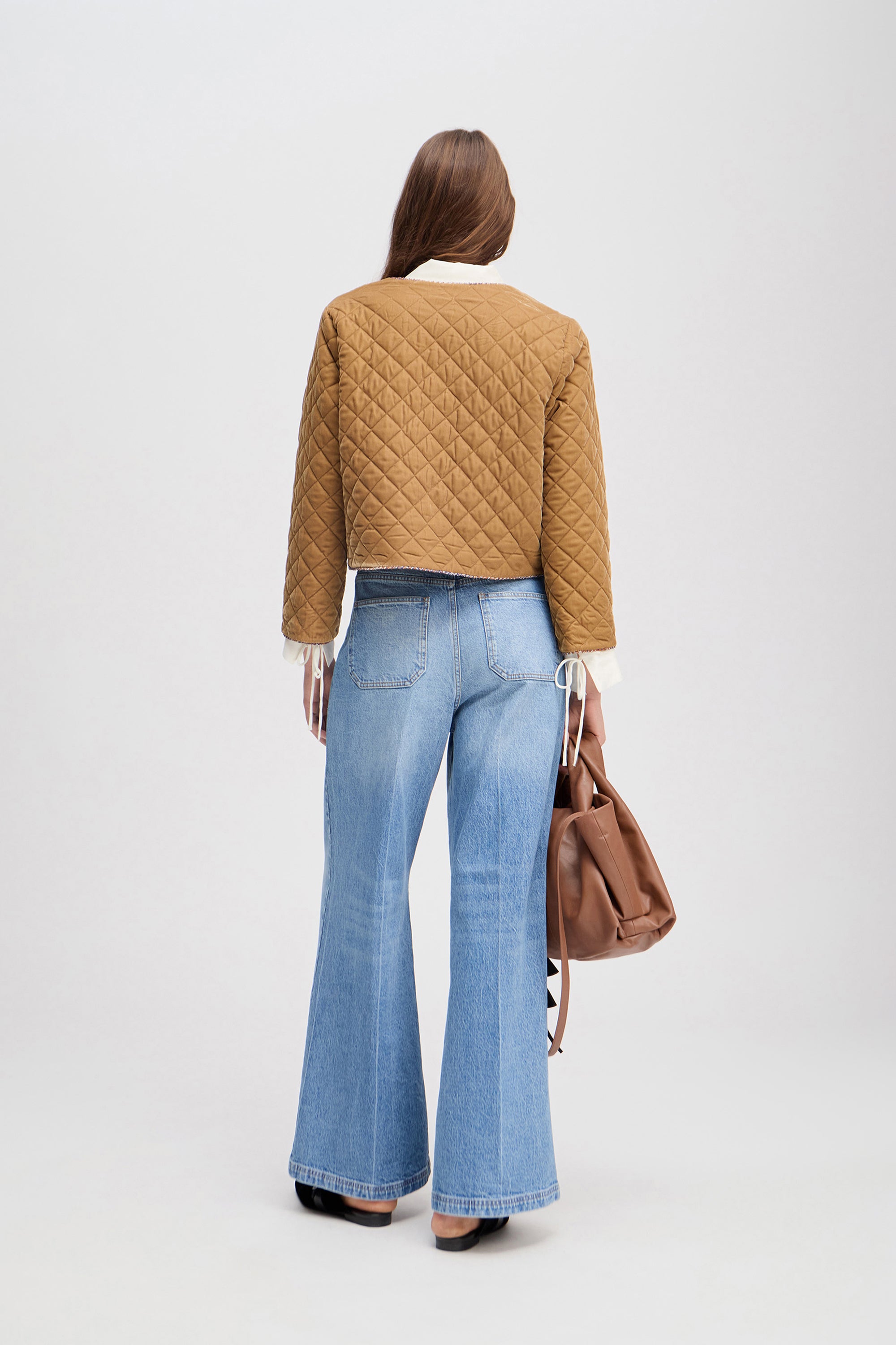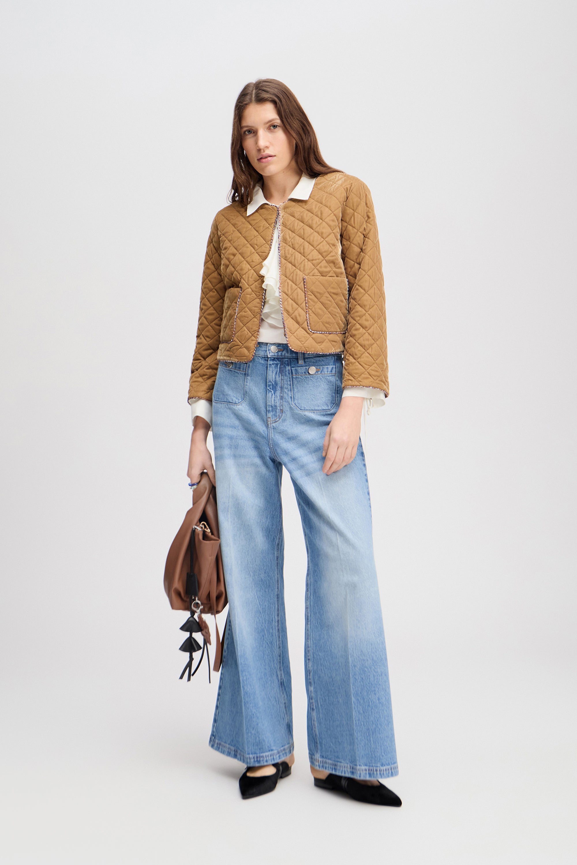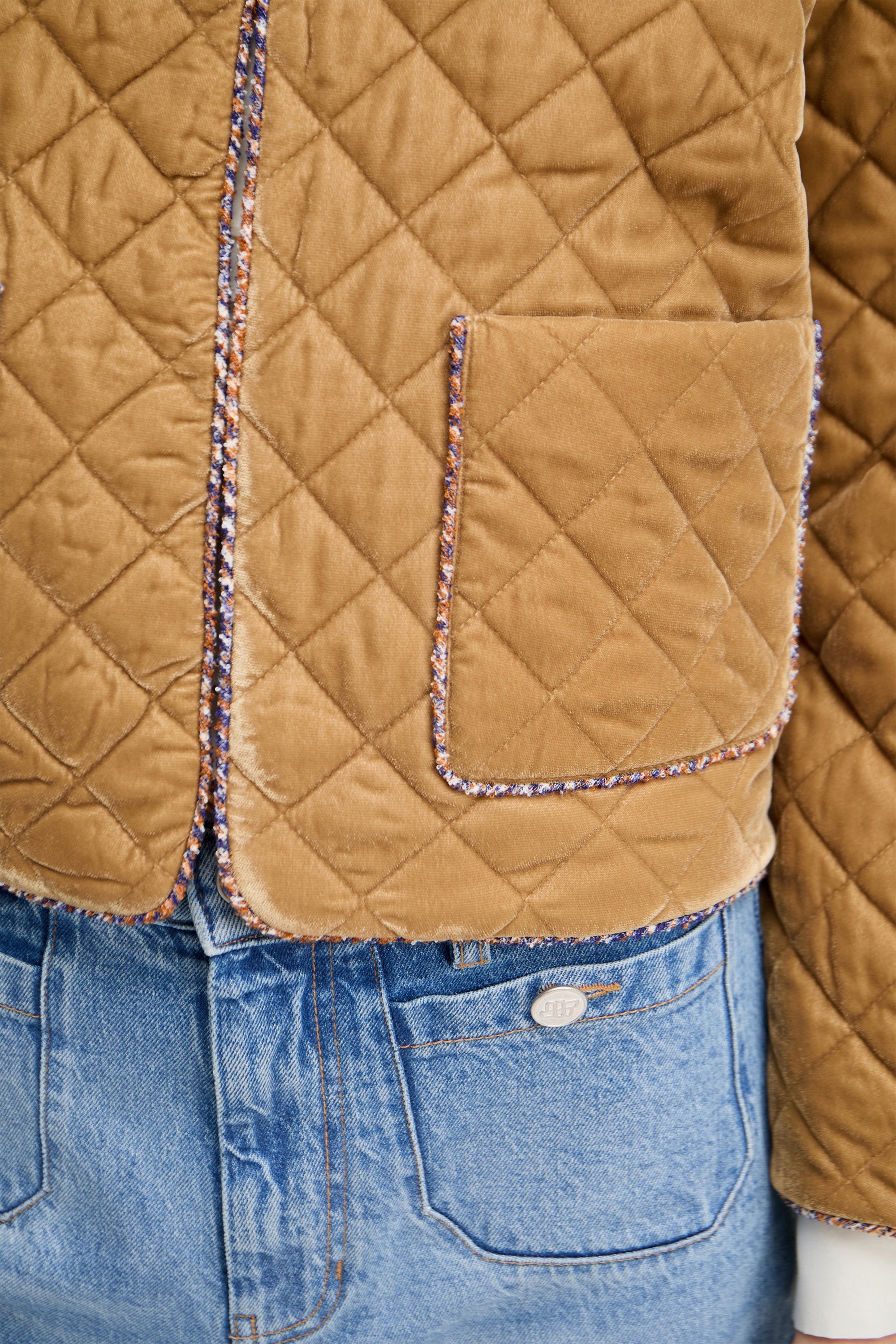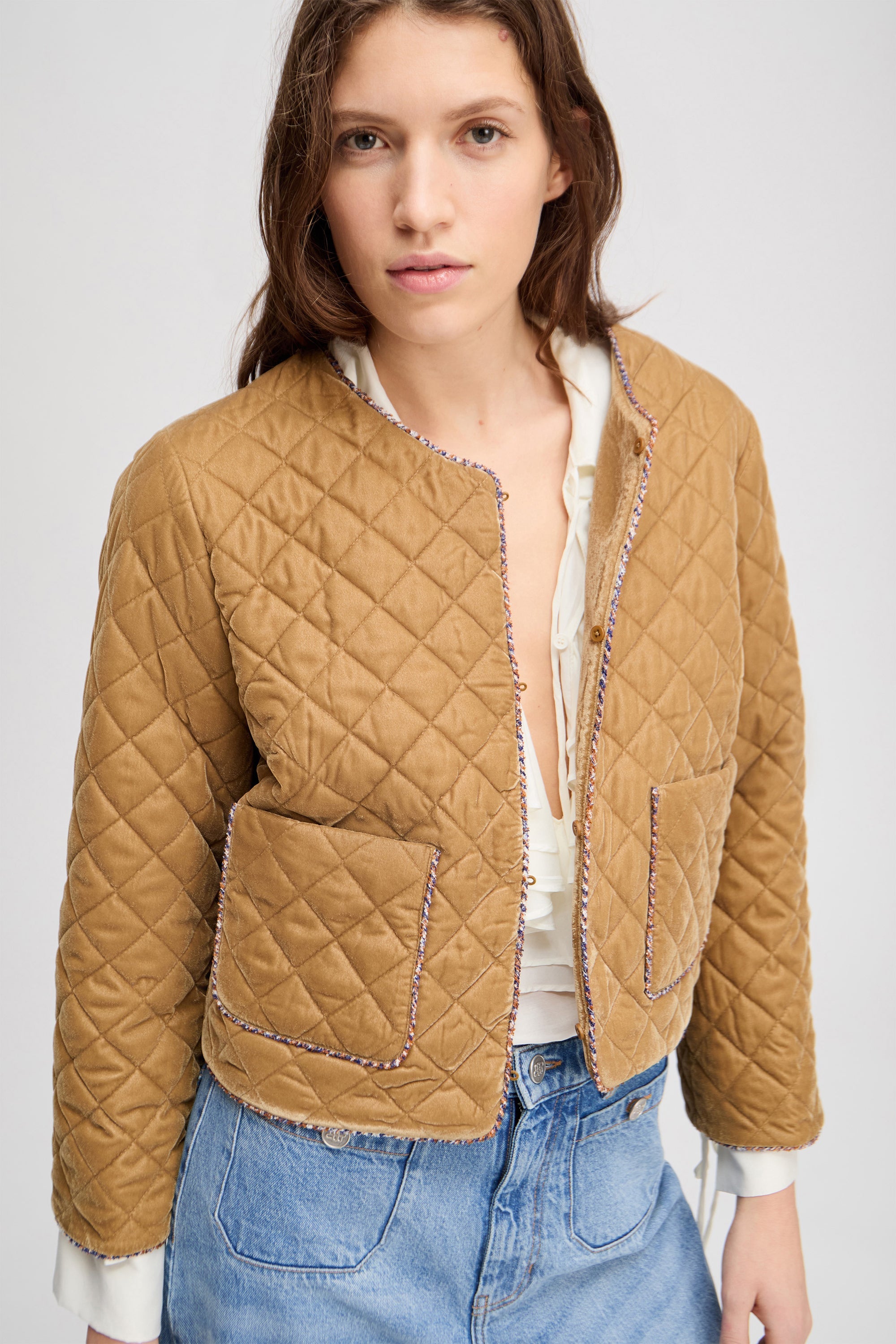 Kort, smuk, quiltet velour jakke med elegant frynset piping. Jakken har knaplukning og fine lommer foran.